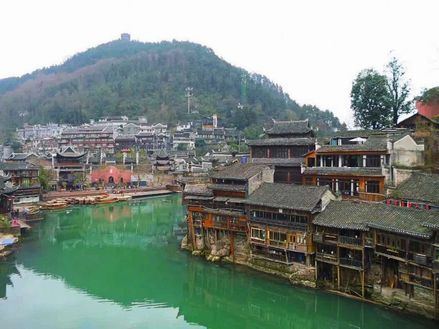 一入凤凰古城,便可看到一条蜿蜒而下的江,江两旁都伫立着吊脚楼。