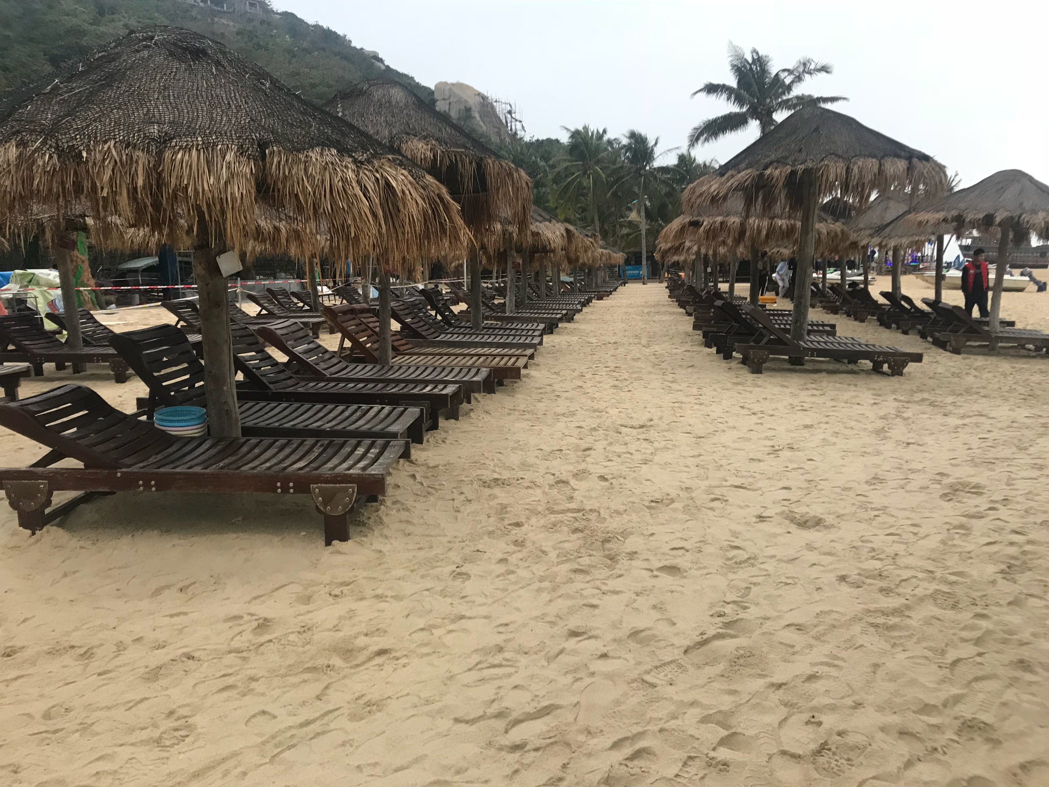 阴天、傍晚的海边的沙滩椅,20元一位,不限时间。