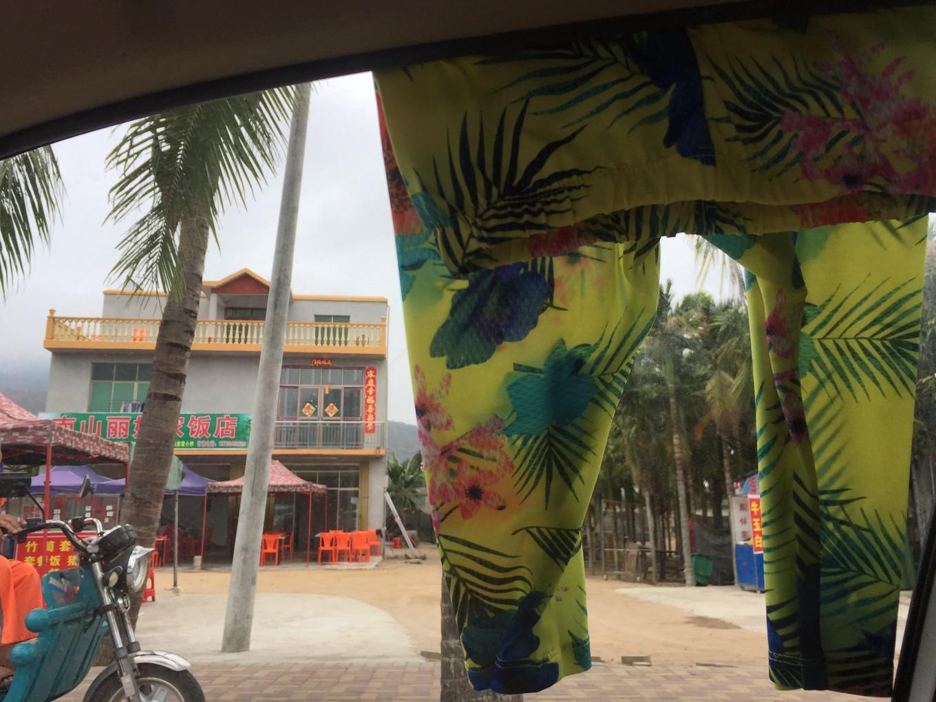 因为玩海浪,糖糖的裤子就光荣牺牲了,湿了一大片,在车上就把裤子脱了,夹在车窗,飘了一路,到南山的时候居然就干了,哈哈……