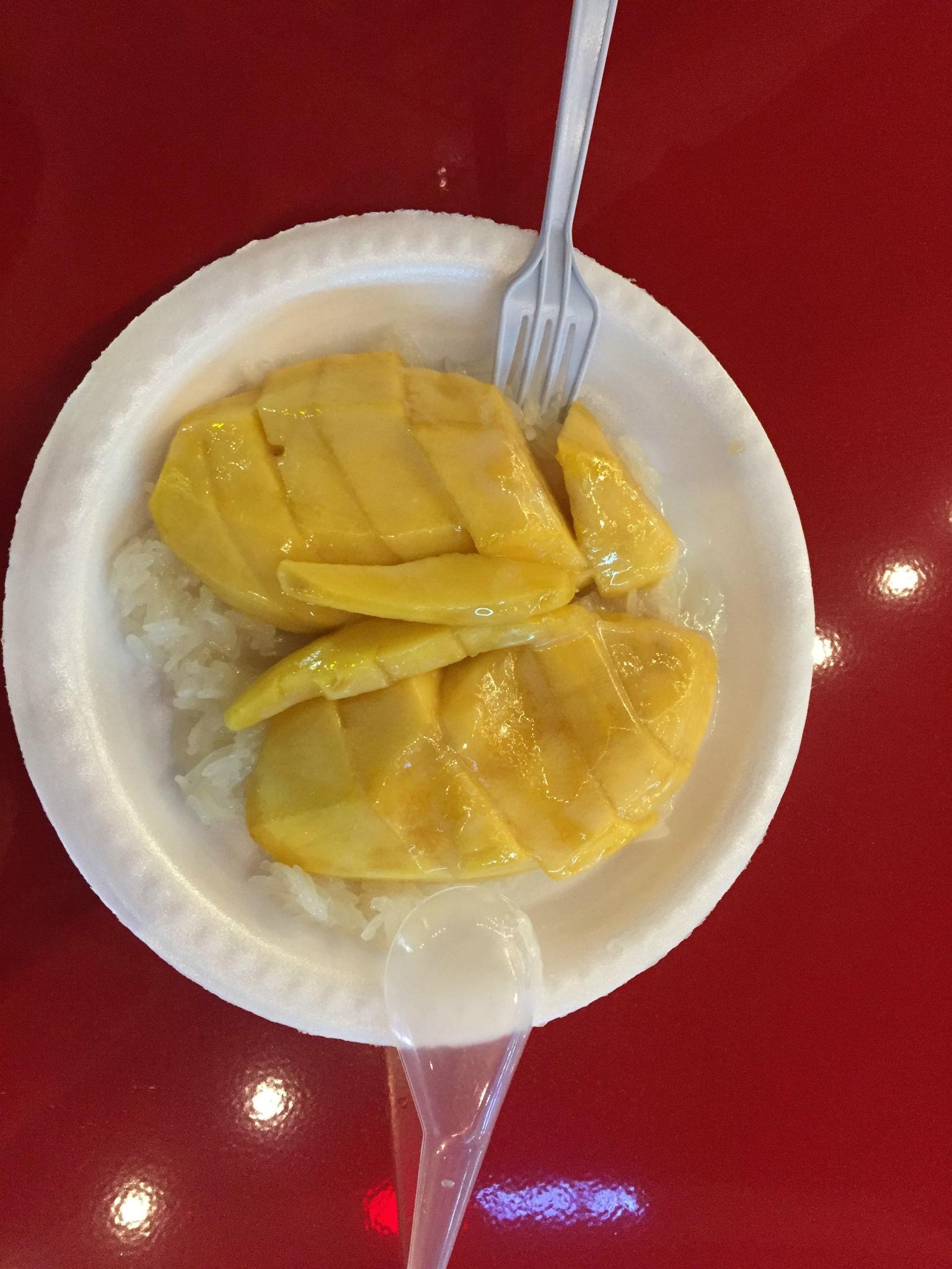 芒果糯米饭,个人认为是个奇怪的搭配,芒果甜,糯米饭咸,口感很矛盾。80泰铢