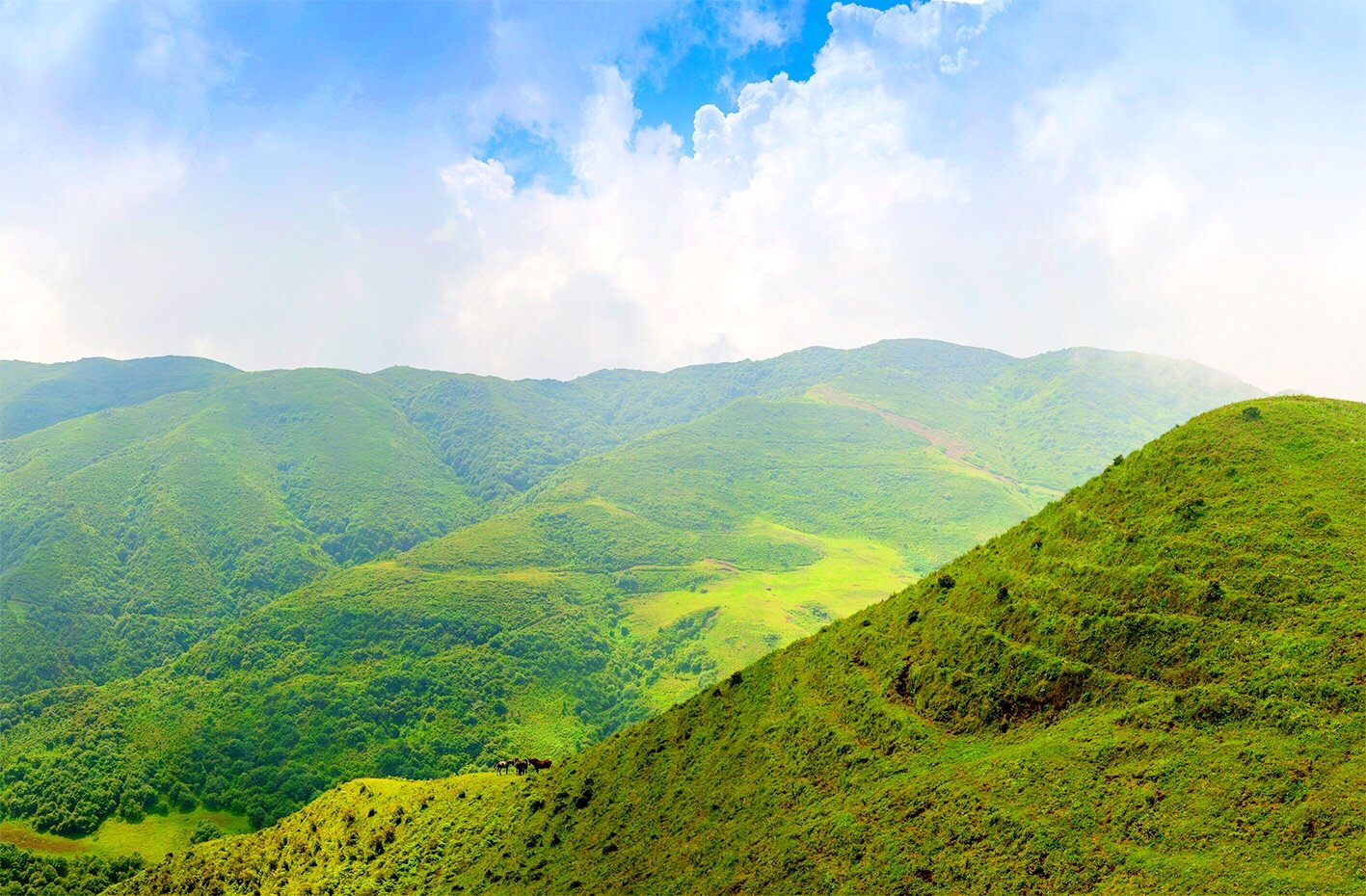 乌蒙大草原是西南地区海拔最高,面积最大的高原草场之一。最高海拔为2857米,年平均气温为11.1℃,是一个夏日避暑的良好去处。这里有一望无际的独特高原草场。乌蒙大草原不像内蒙草原那么平坦,那么连绵起伏,相比而下略显粗糙,但是他却有自己的独特韵味。