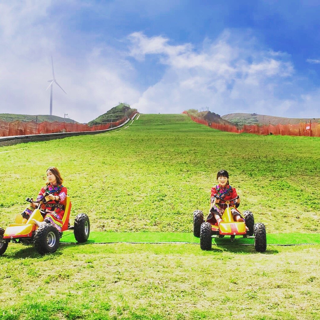 草原上既有骑马等娱乐项目,也有滑草的刺激体验,今天我们就玩了一把滑草。