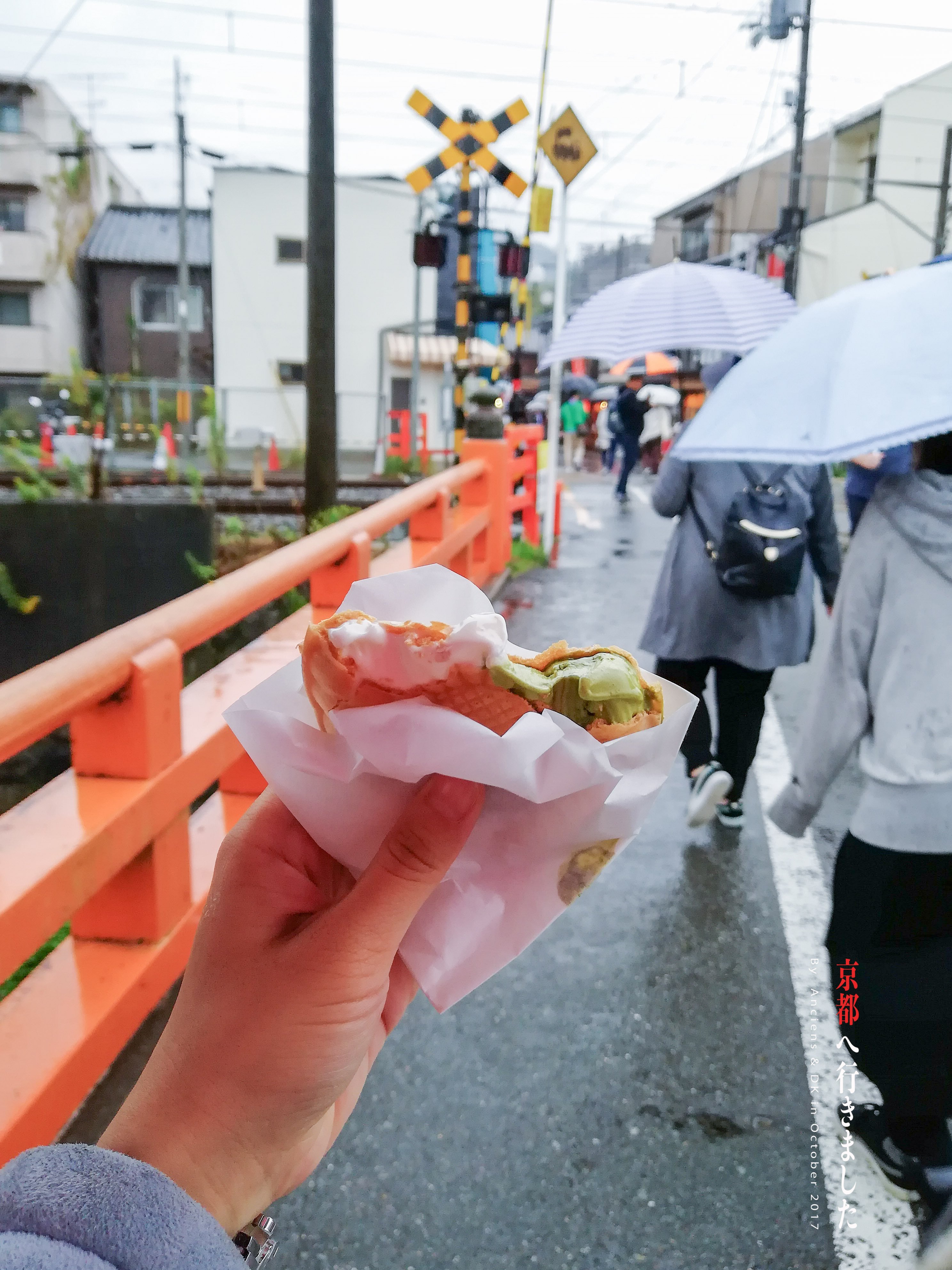 我吃的是稻荷大社限定的华夫薄饼夹豆腐抹茶冰淇淋,京豆庵是一家全国连锁的冰淇淋店,“伏见稻荷限定”的意思是只有在这里才能吃到的哦。比起抹茶部分,豆乳冰淇淋更加好吃一点,虽然二者味道都非常浓稠,但豆乳入口清香,保留了豆的醇厚,又不至粘腻,入喉之后久久回味无穷,让人惊艳!这份双拼华夫饼冰淇淋300日元一份,折合人民币大约18元一份,值得推荐!