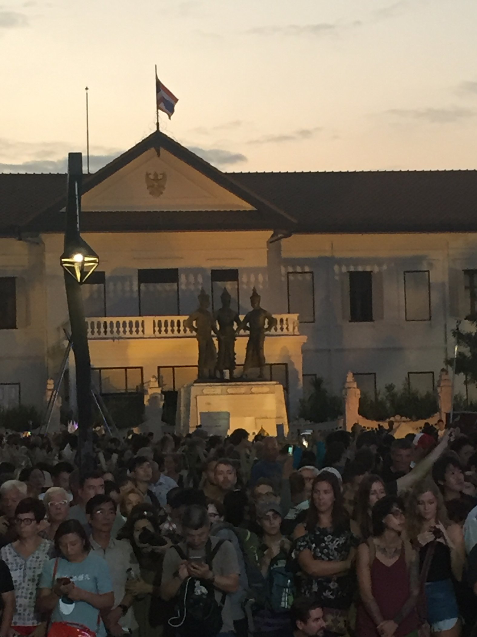 黄昏中的三王像前,人们在等着看水灯节开幕式