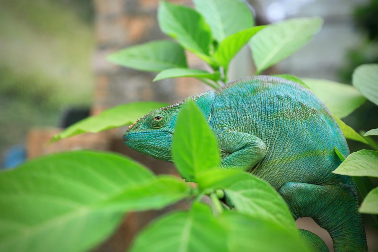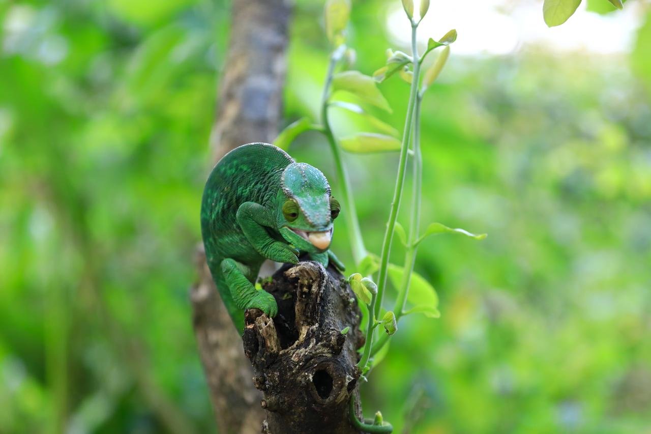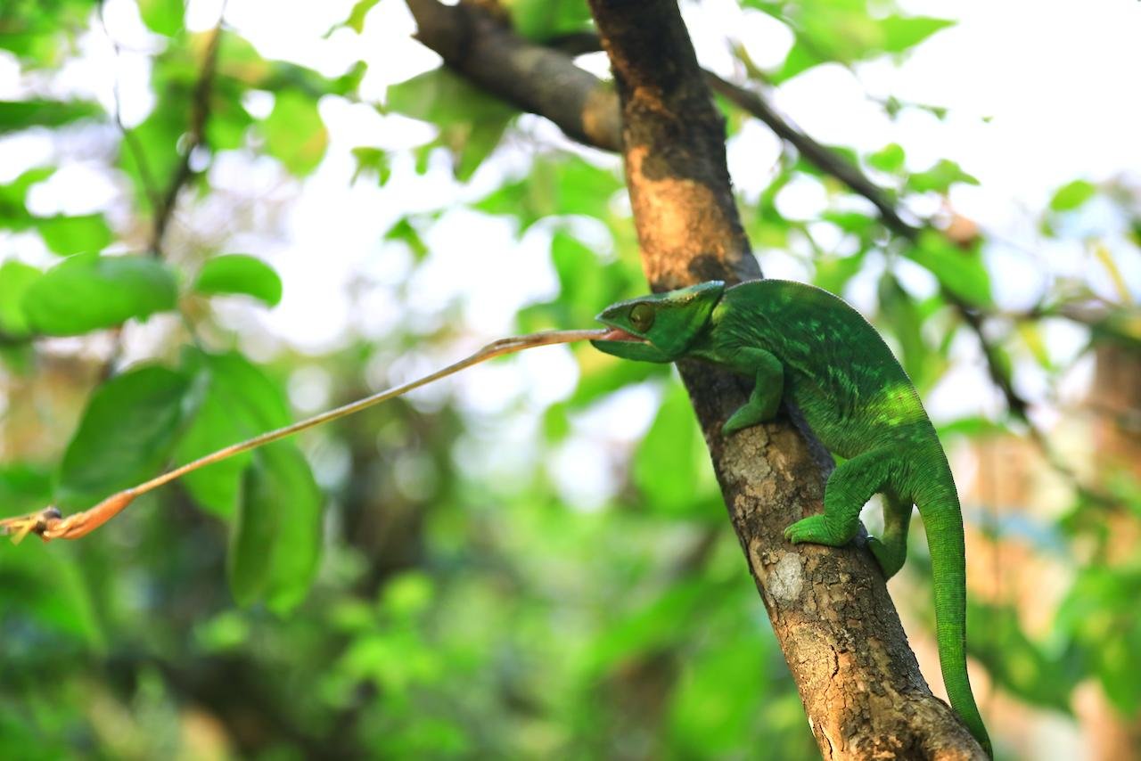 变色龙的视觉不好,只能辨别和捕猎运动中的物体。不过,别看它平时动作慢慢的,捕猎的那一刹那,长长的舌头能极其迅速而精准地捕食,高速连拍的相机,都只能偶尔幸运地捕捉到那一刹那。