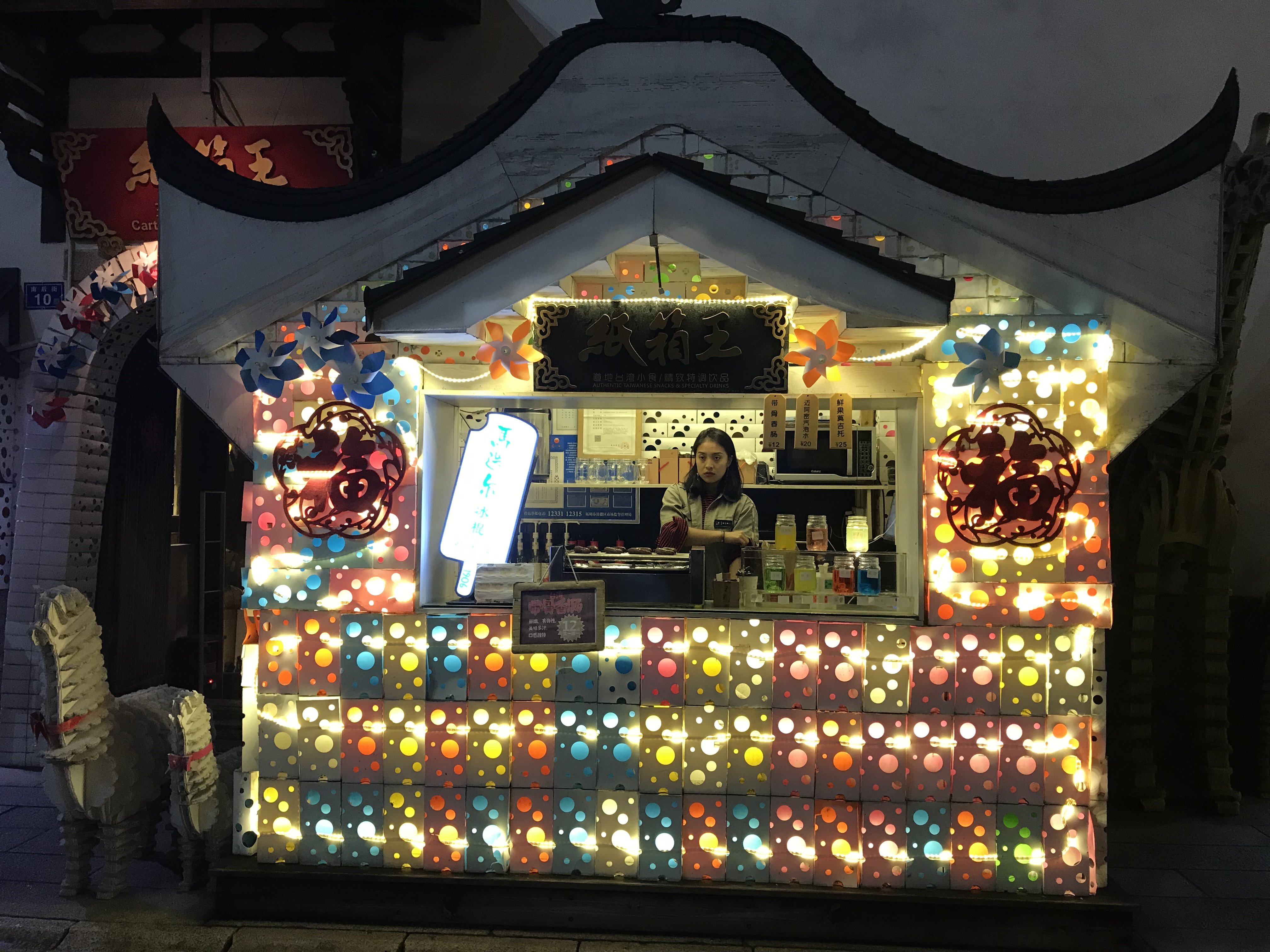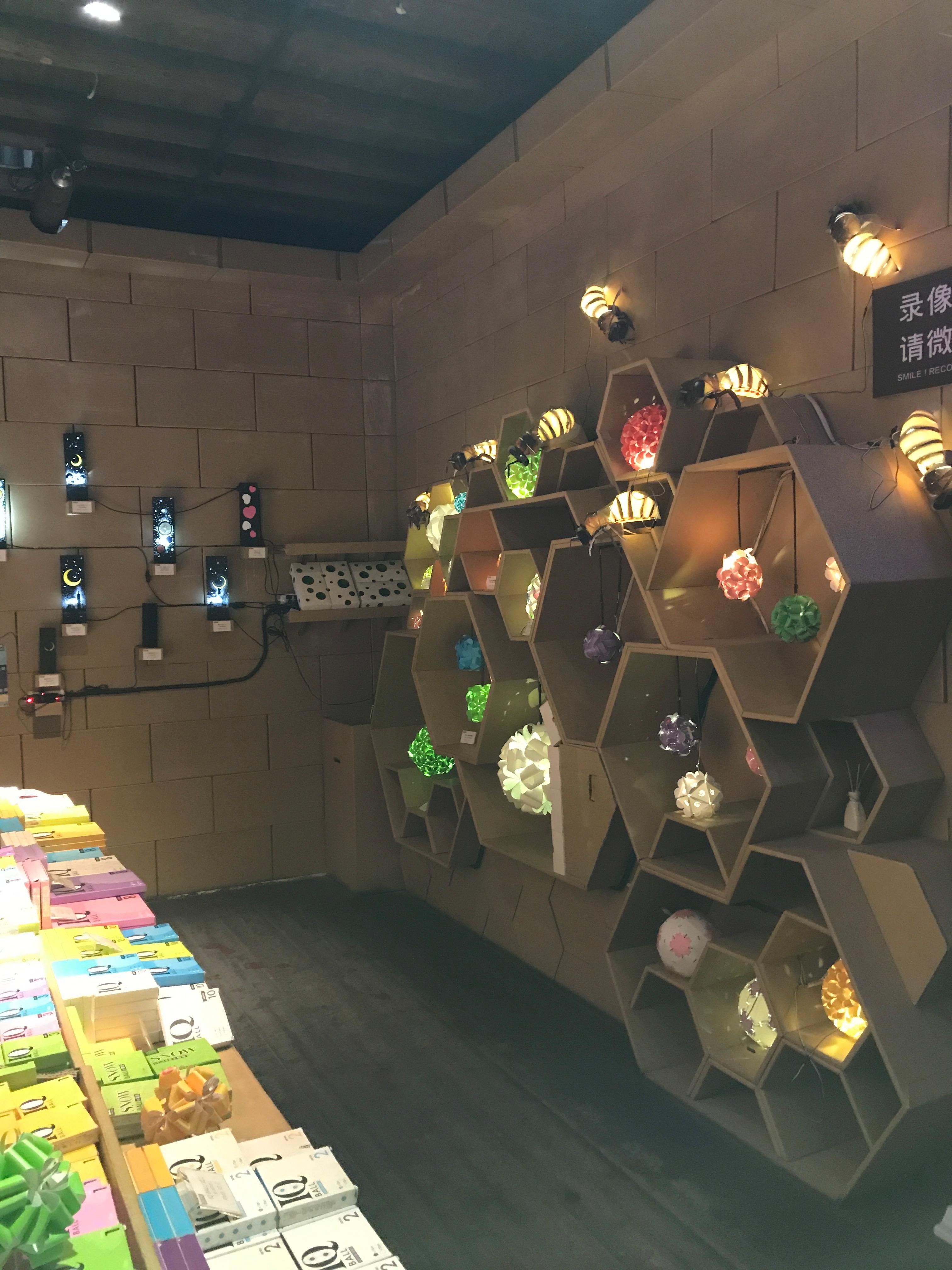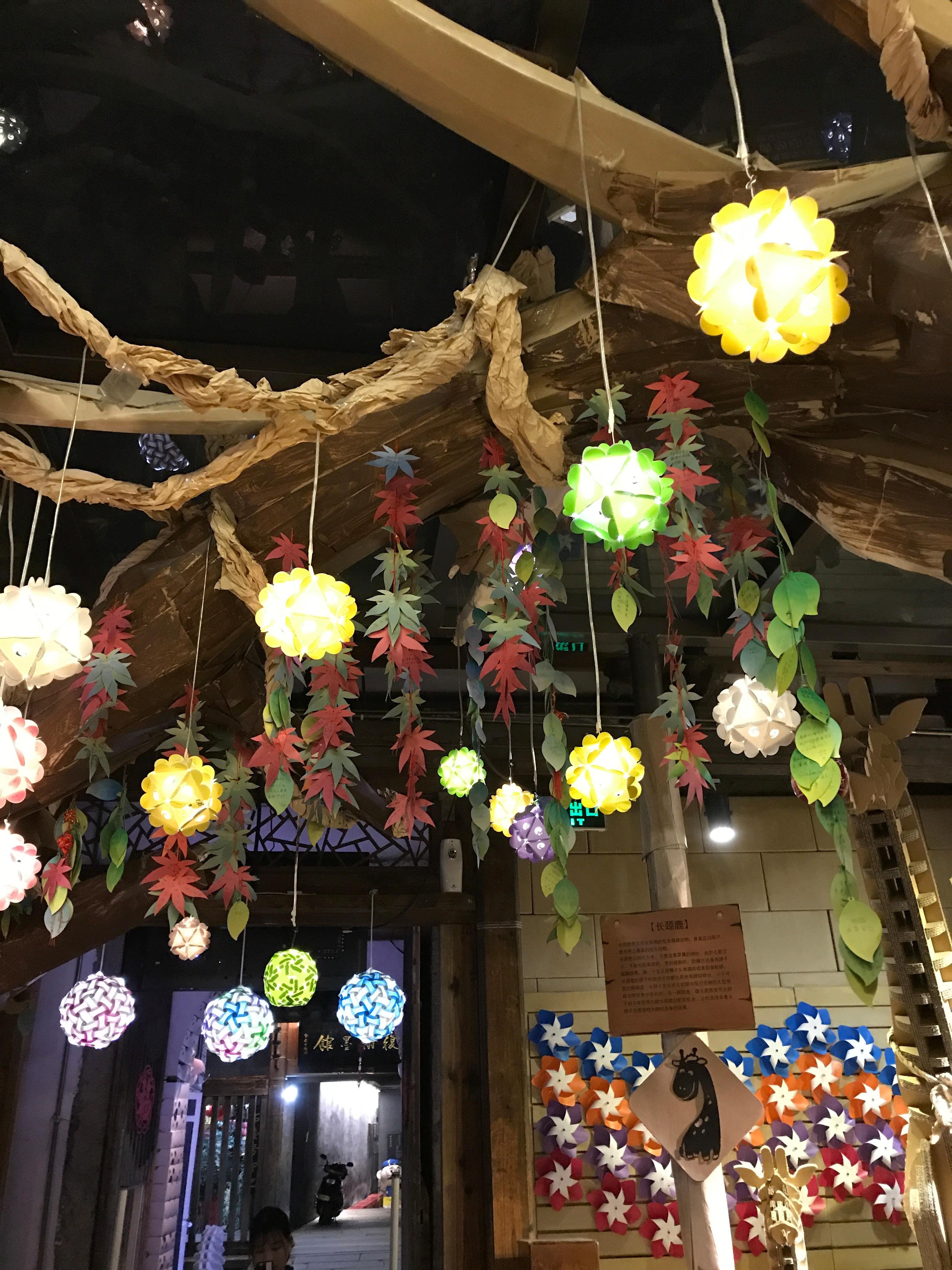 店内不仅有模拟的福州建筑以及各类栩栩如生的动植物,还有各类纸质产品,如文具类,家居装饰类,每一款灯饰可以做出不同的造型,不仅防水,也十分抗压,色彩斑斓,堆积在天花板上,如同璀璨额花火一般(如图)。