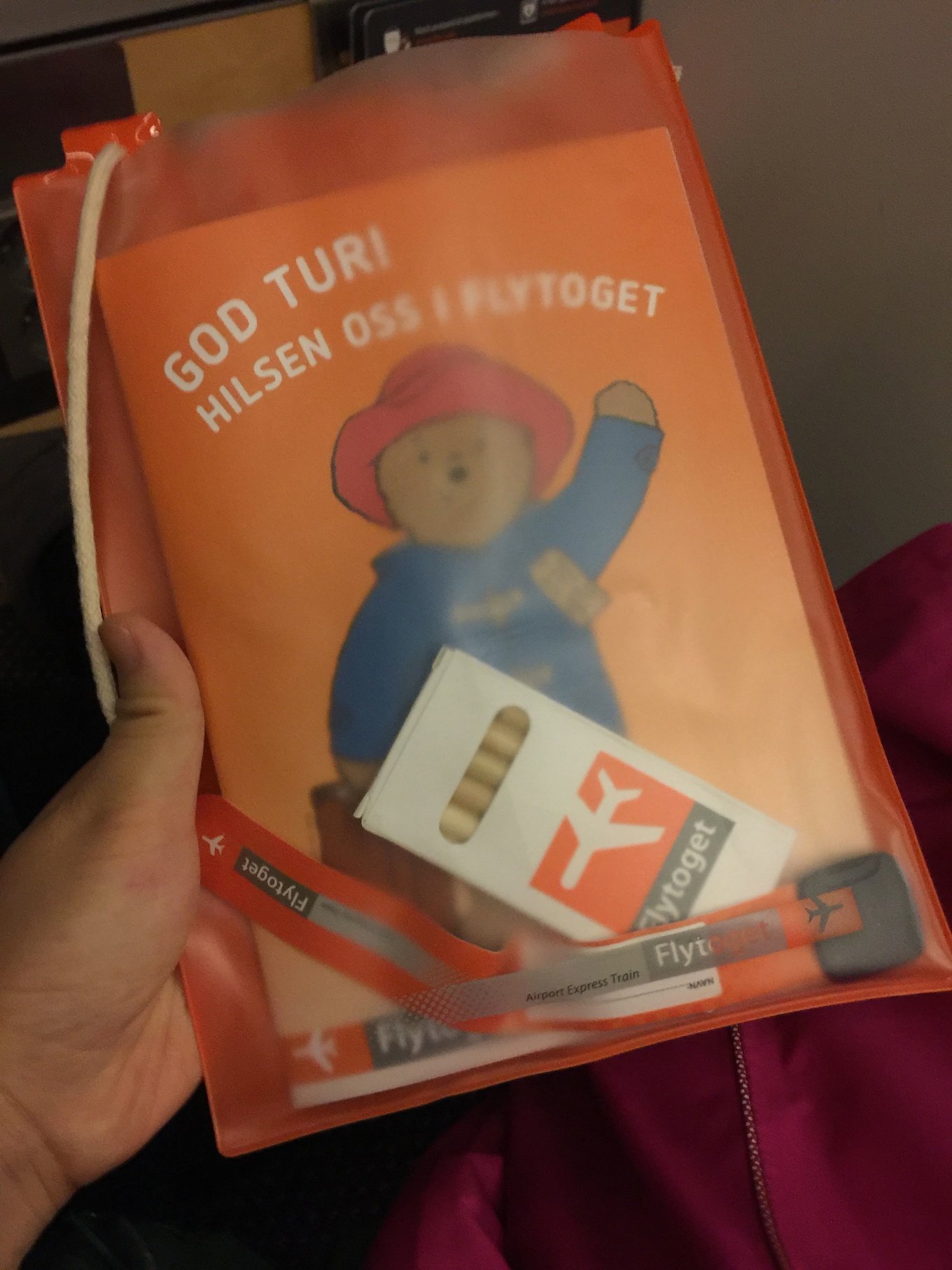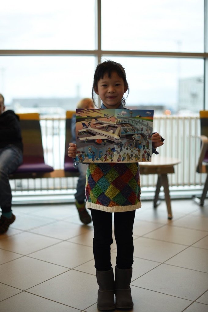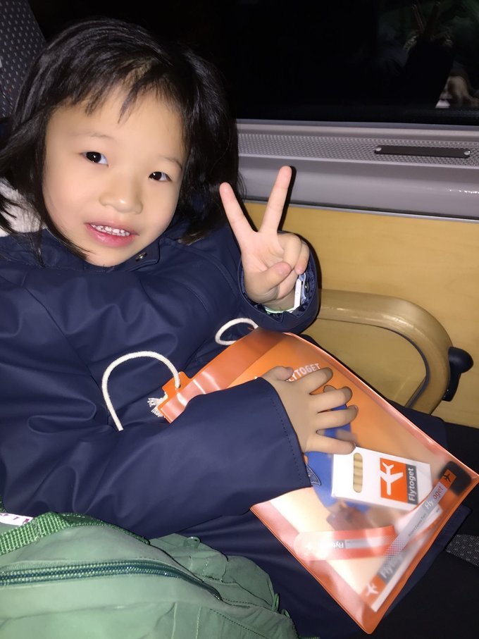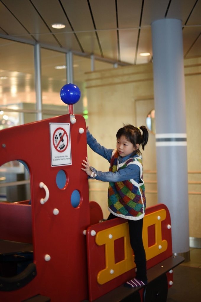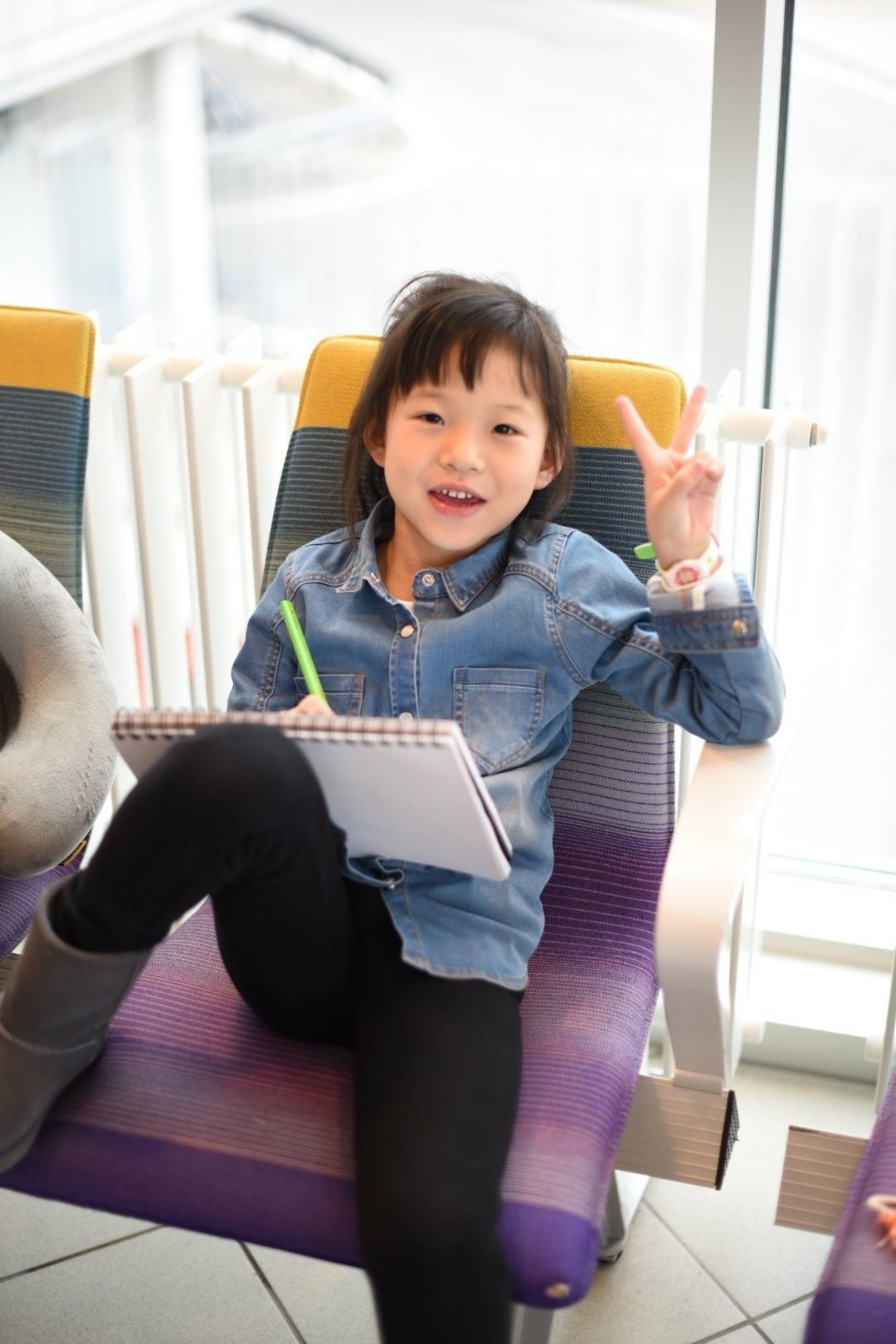 从酒店去机场还是搭乘机场快线,买票的机器很先进,刷一下信用卡就行,不用出票,车票信息直接记录在信用卡上,高效环保。上了车漂亮的列车员看到小妞马上送来了小礼物,可以挂脖子上的袋子里是彩笔和贴纸涂色书,做工精美,用的材料野狠环保,简直不能更贴心。