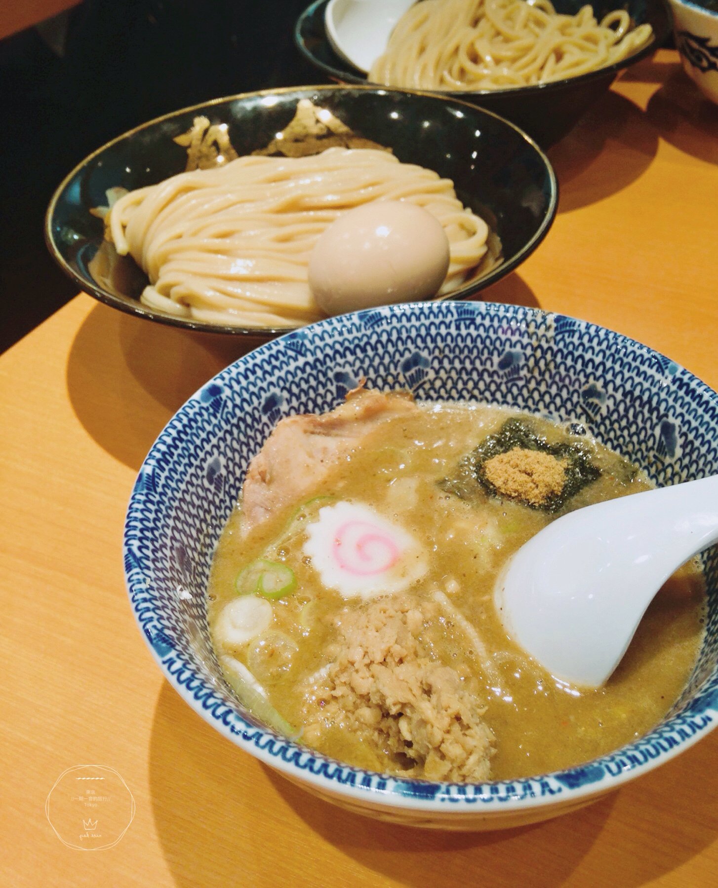 这家店的名字叫做六厘舍。从开店前就开始排队且人潮从早到晚都没有停过的六厘舍,人气遥遥领先其他店,稳居各店之冠。这里提供的不是我们国内同胞熟悉的拉面而是蘸面。我们也是排了足足45分钟才得以入座。点了店内人气第一的特制蘸面。