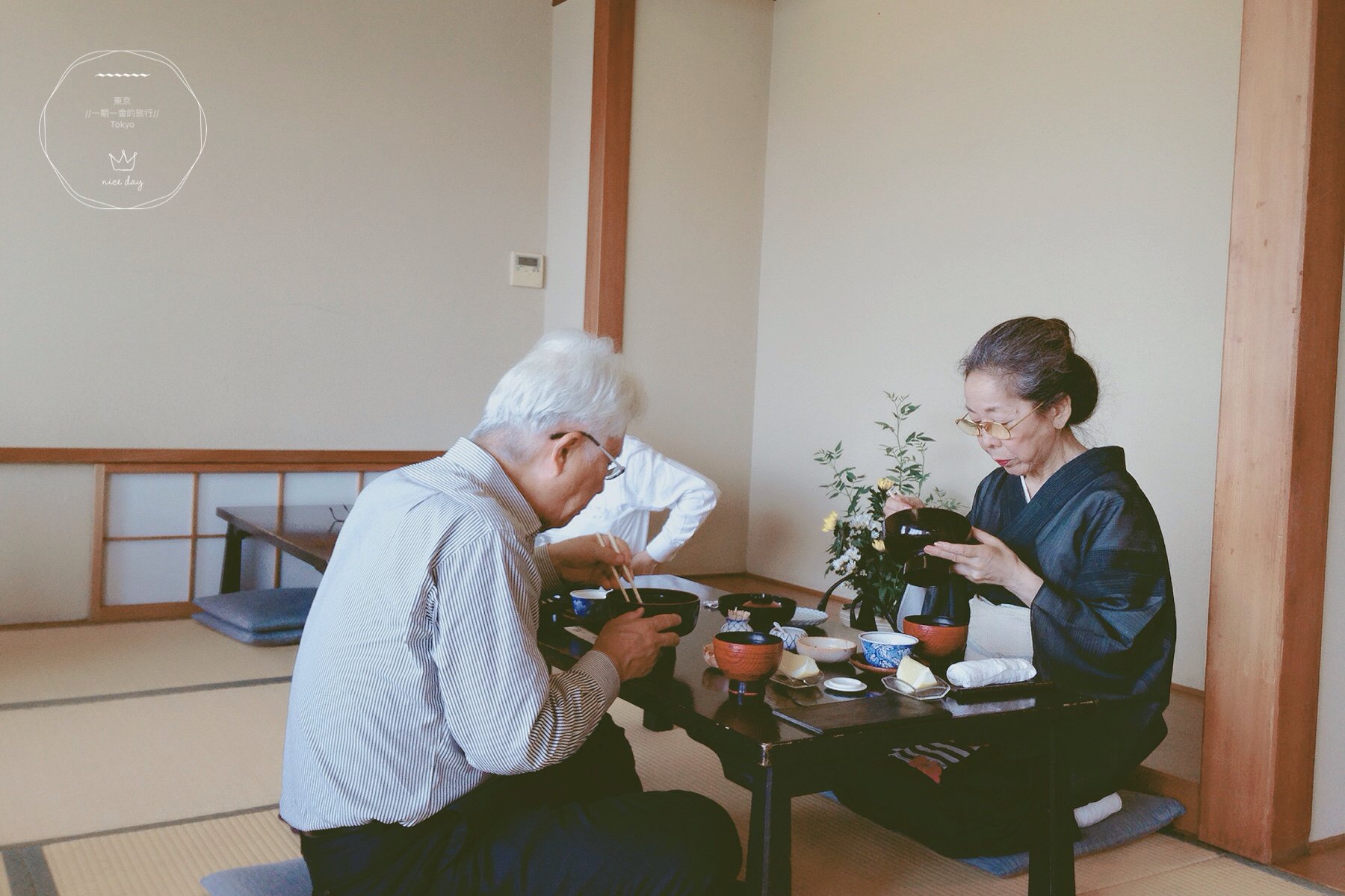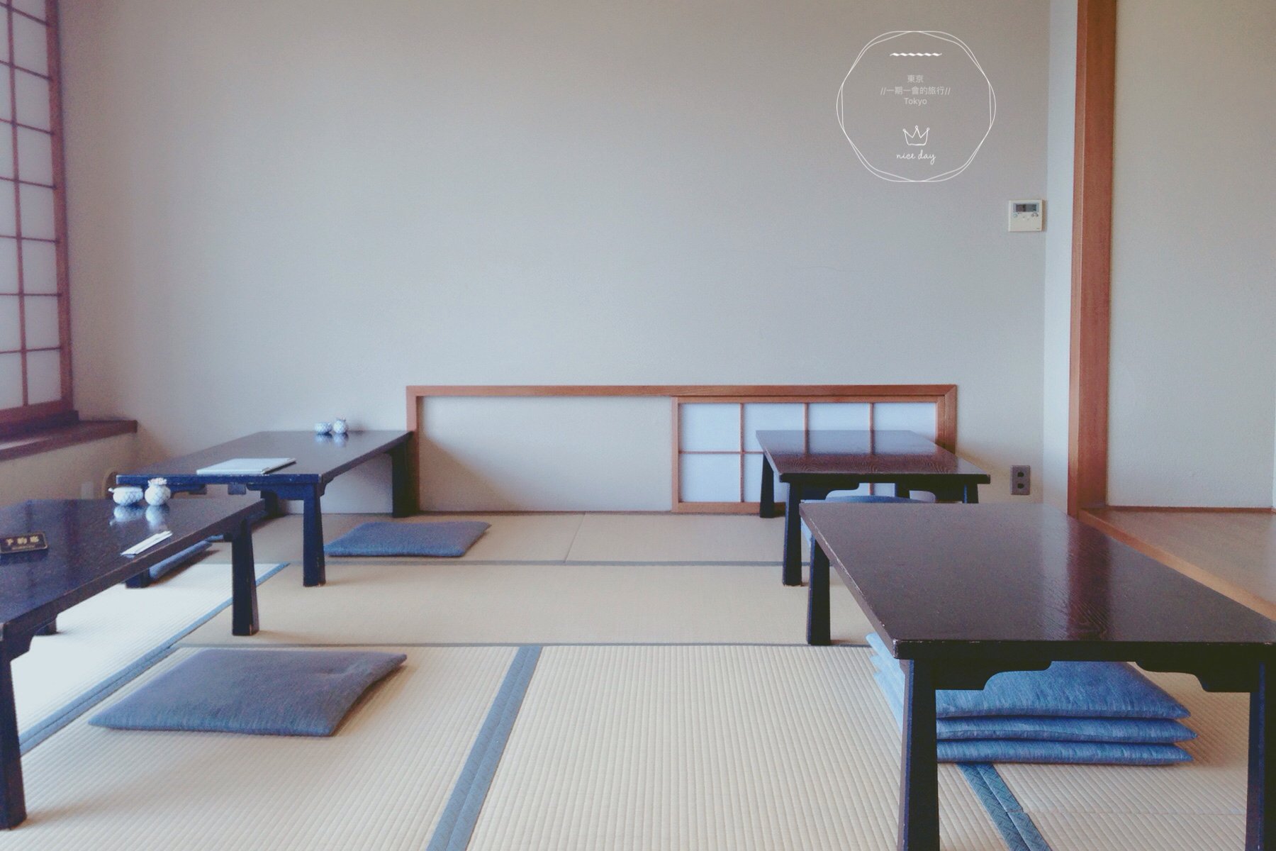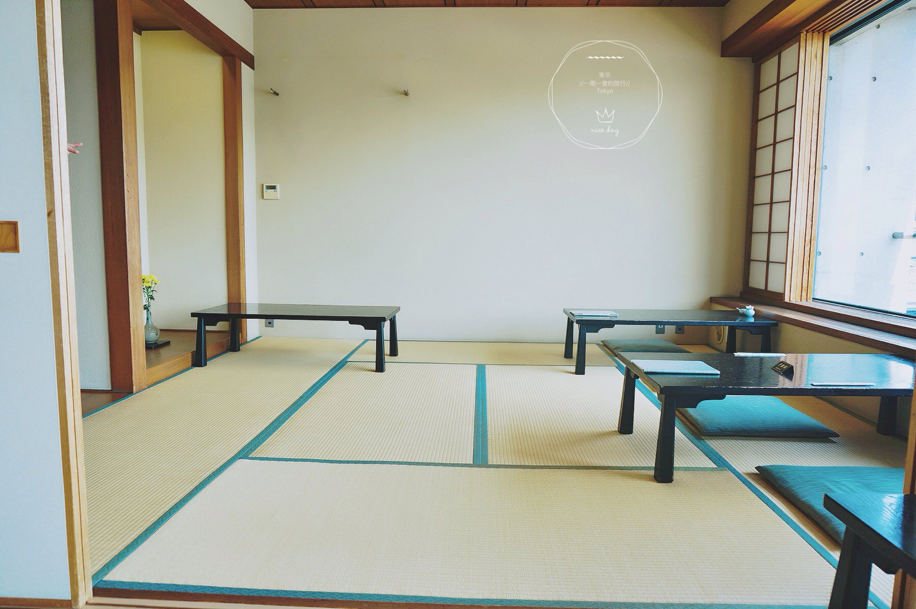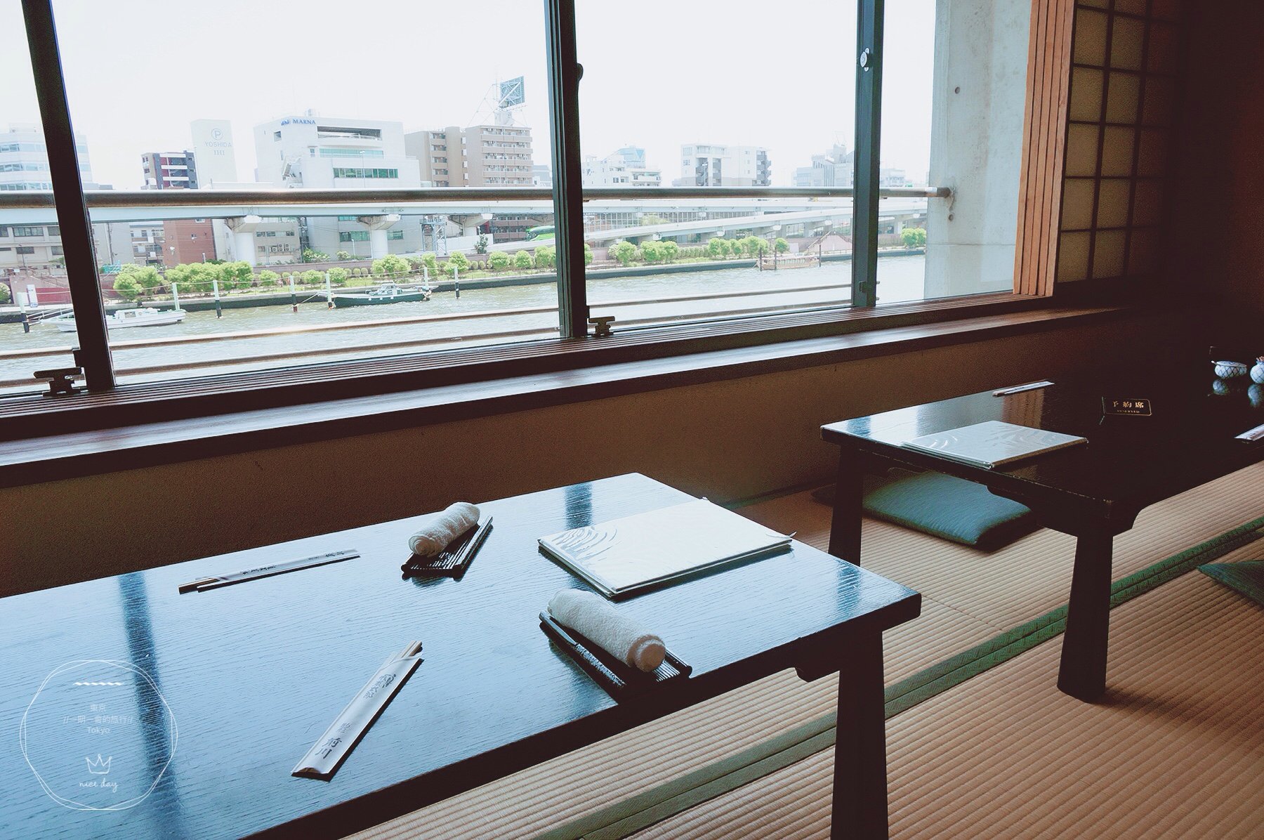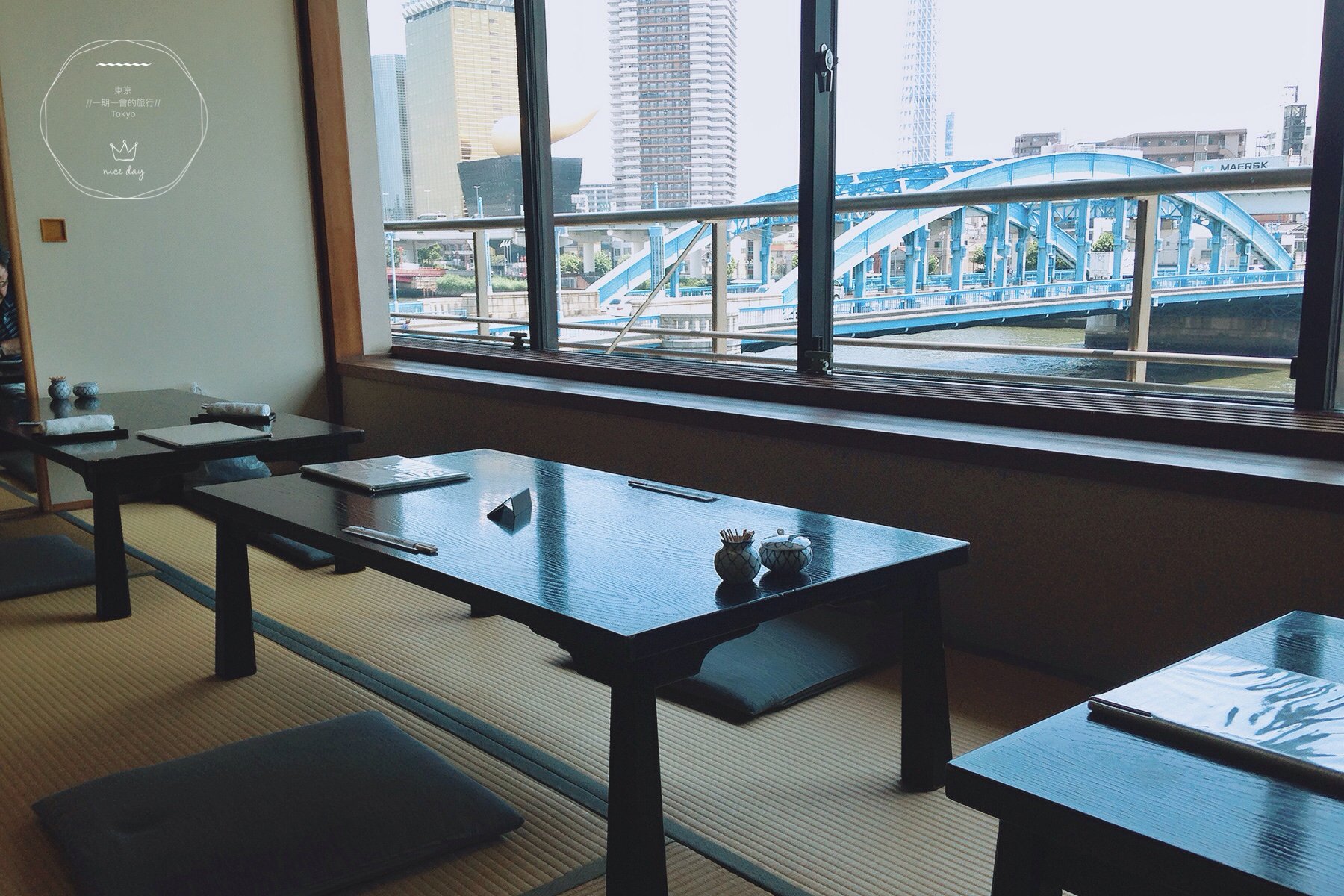 不一会儿店家把我们迎进室内客厅。为每一批客人排好号,让我们换上拖鞋之后,由女将把我们带到三楼的用餐区域。之前一直听闻靠近隅田川一侧的位子特别抢手,今天我们第一批进来,顺利坐上靠近窗边的位置,开心!