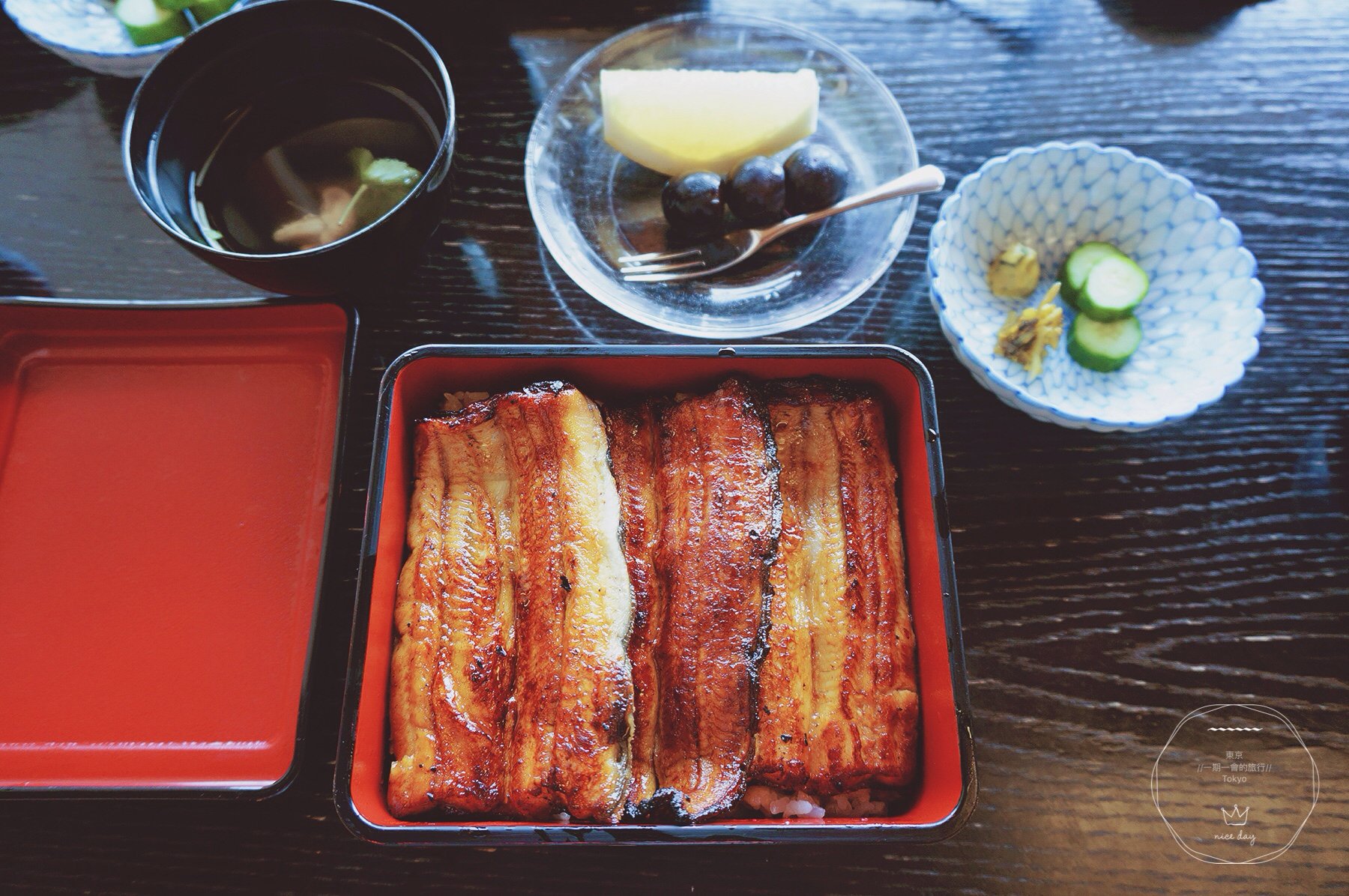 等待的时间,让人们对于食物的期待倍增。因为是现杀现做的关系,差不多等了半个小时,鳗鱼饭盛在漆盒中被女将恭恭敬敬地端上来。配上几样渍物、鳗肝汤与水果,这就是一顿丰盛的うな重套餐。