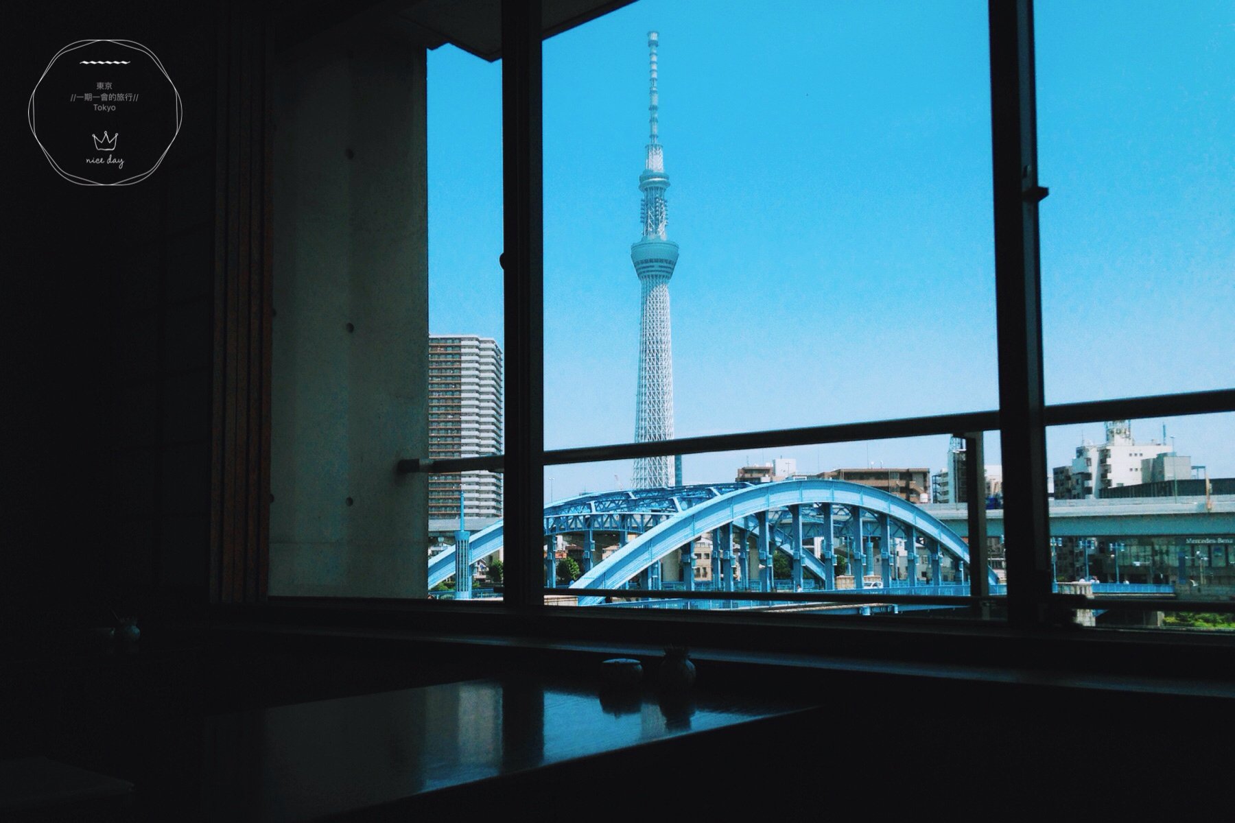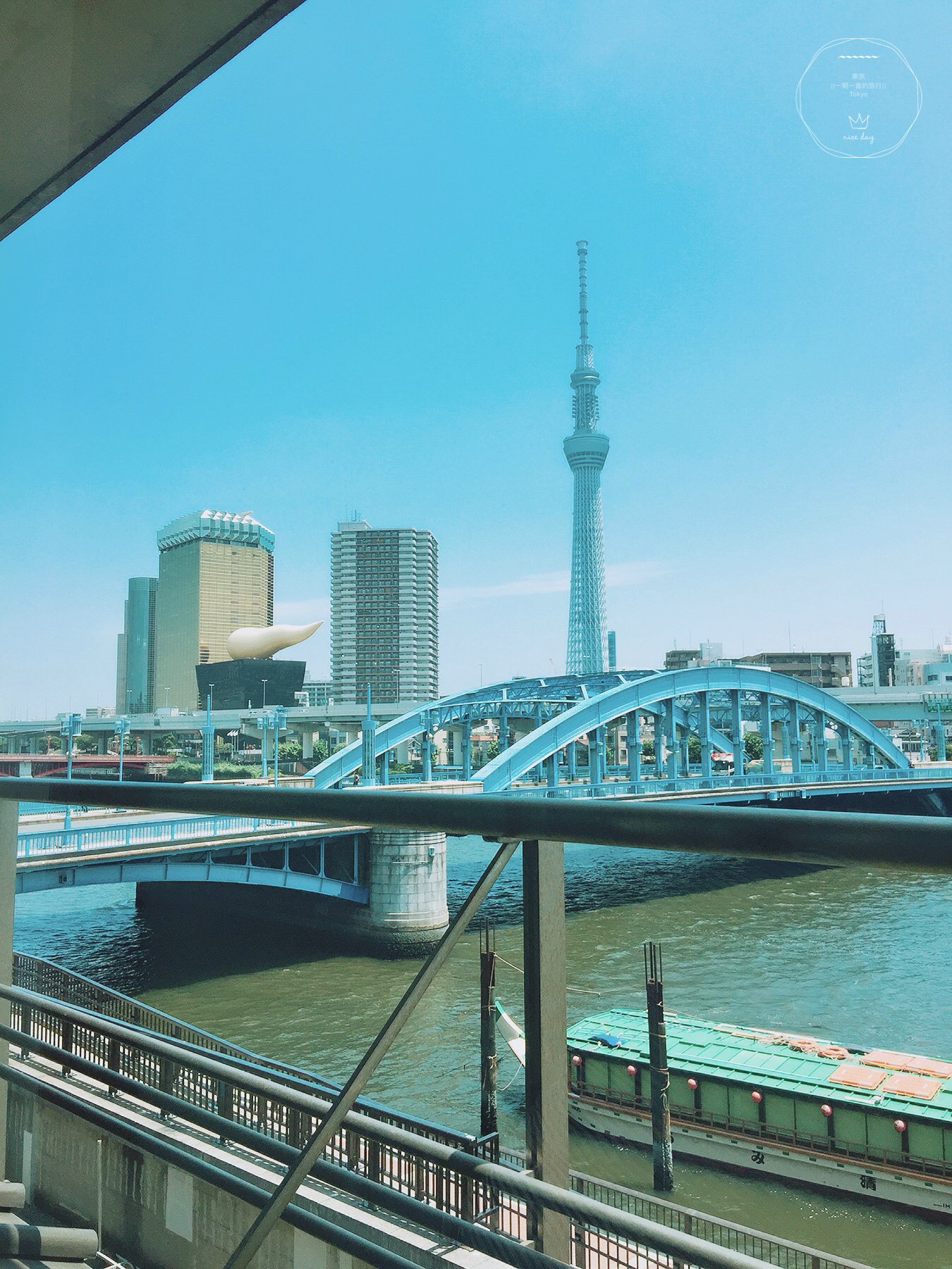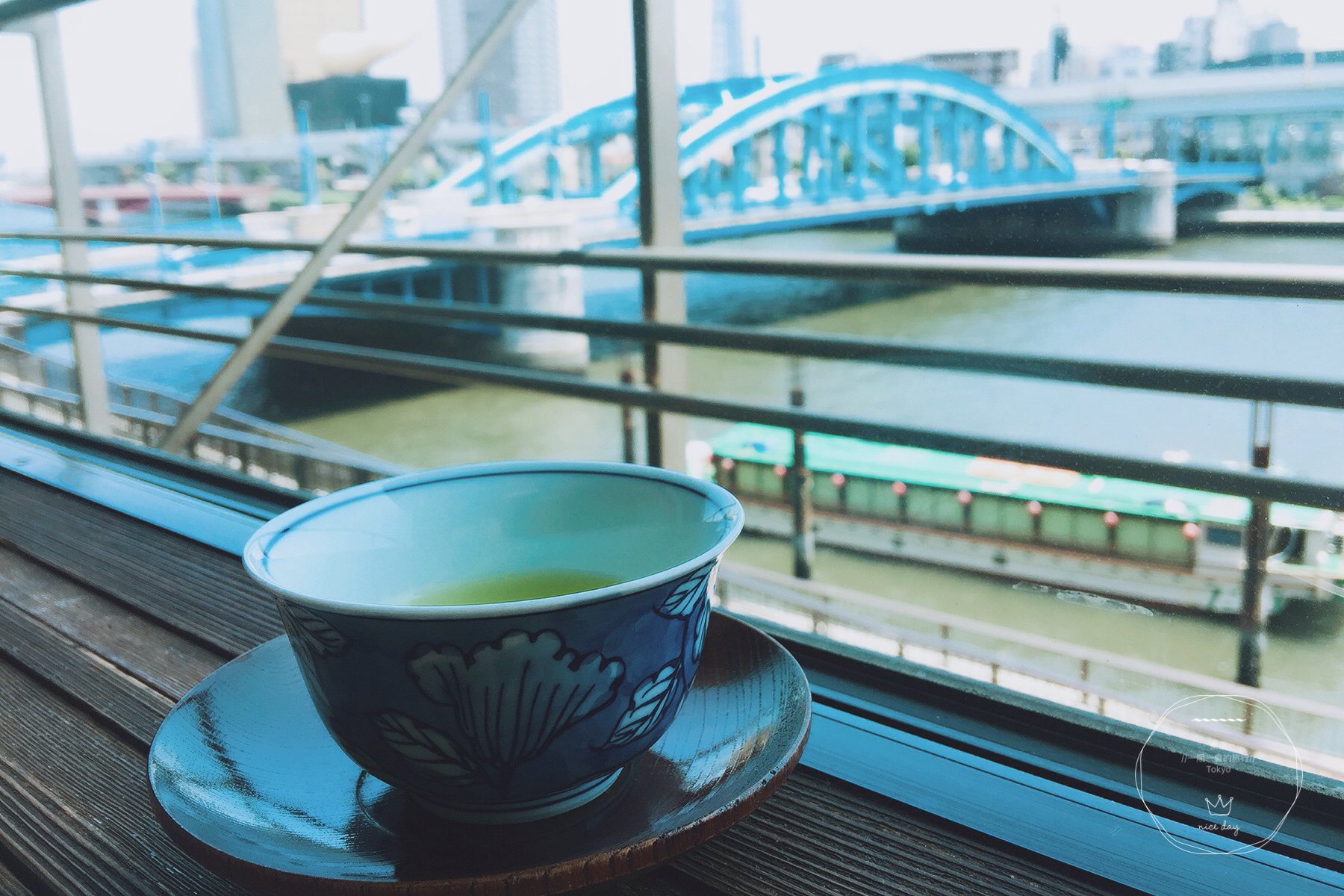 窗外这一条河就是大名鼎鼎的隅田川啦,河岸远处是晴空下的晴空塔,还有朝日啤酒总部大楼那谜一般的“啤酒泡沫”。坐在靠窗户的位子,喝着女将端上来的日式绿茶,凭窗远眺,好不惬意。