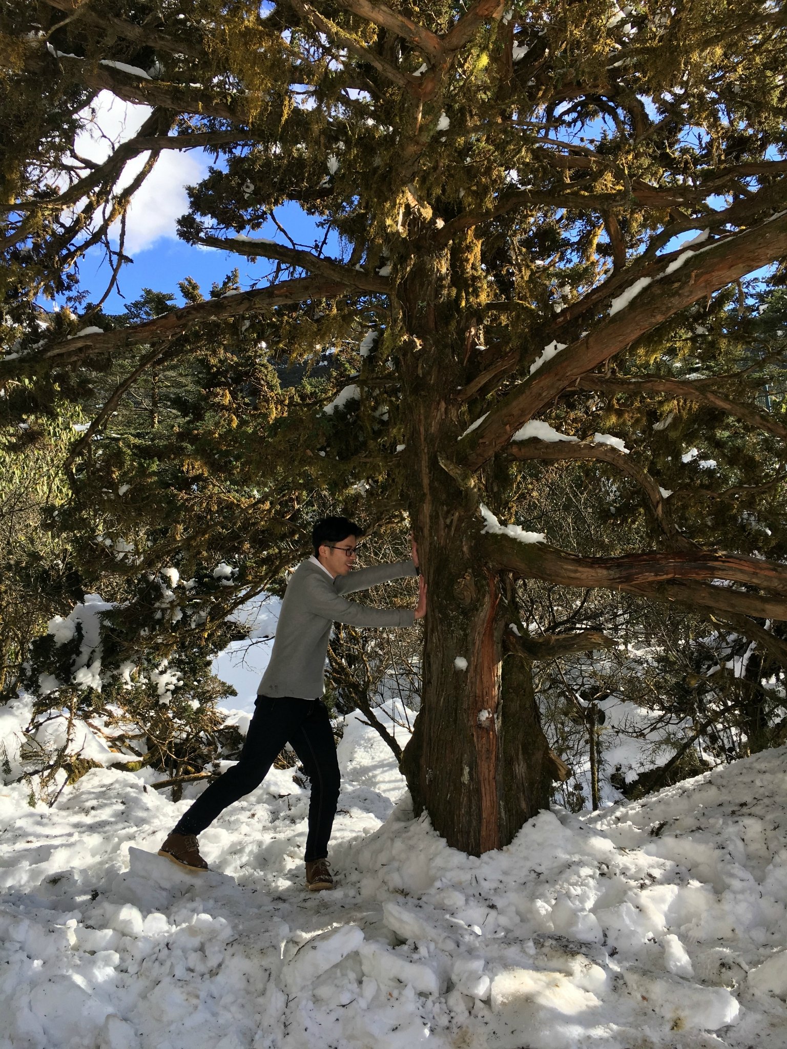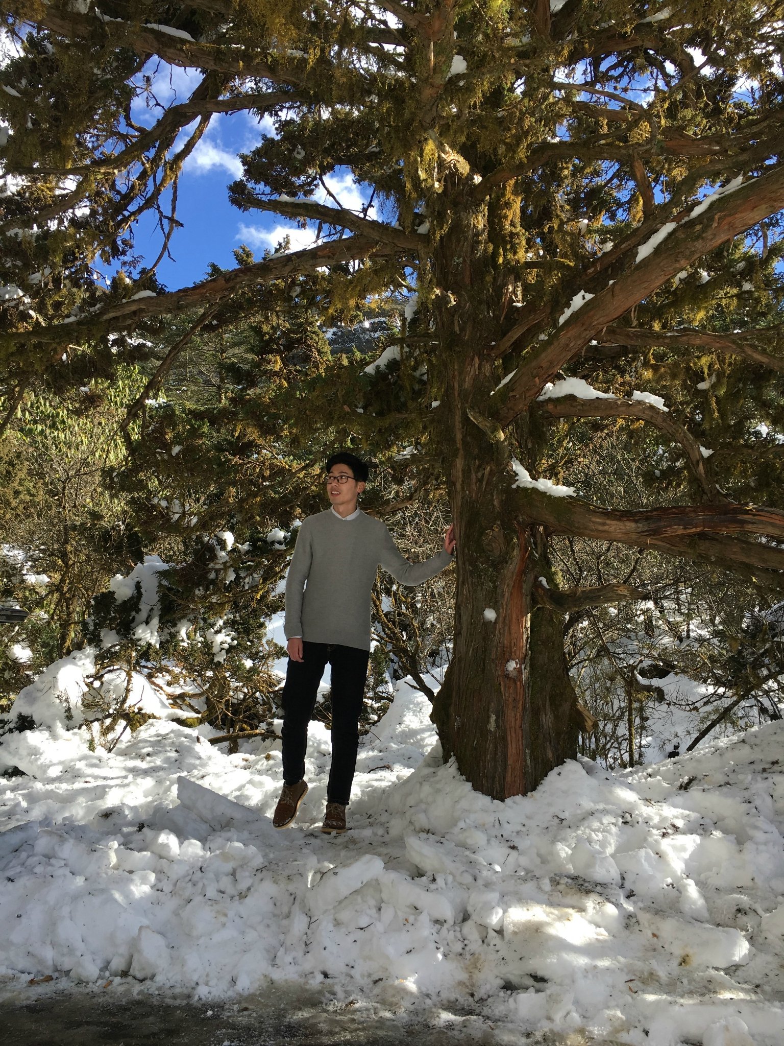 你从树下走来,脚下的沙沙声绽放着枝头的雪白,参天古树的身上趴满了毛茸茸的青苔,默默释放着为他抵御严寒的温情和依赖,静静诉说着那些尘封的年代,也有佳人相爱,执手相看雪花开。