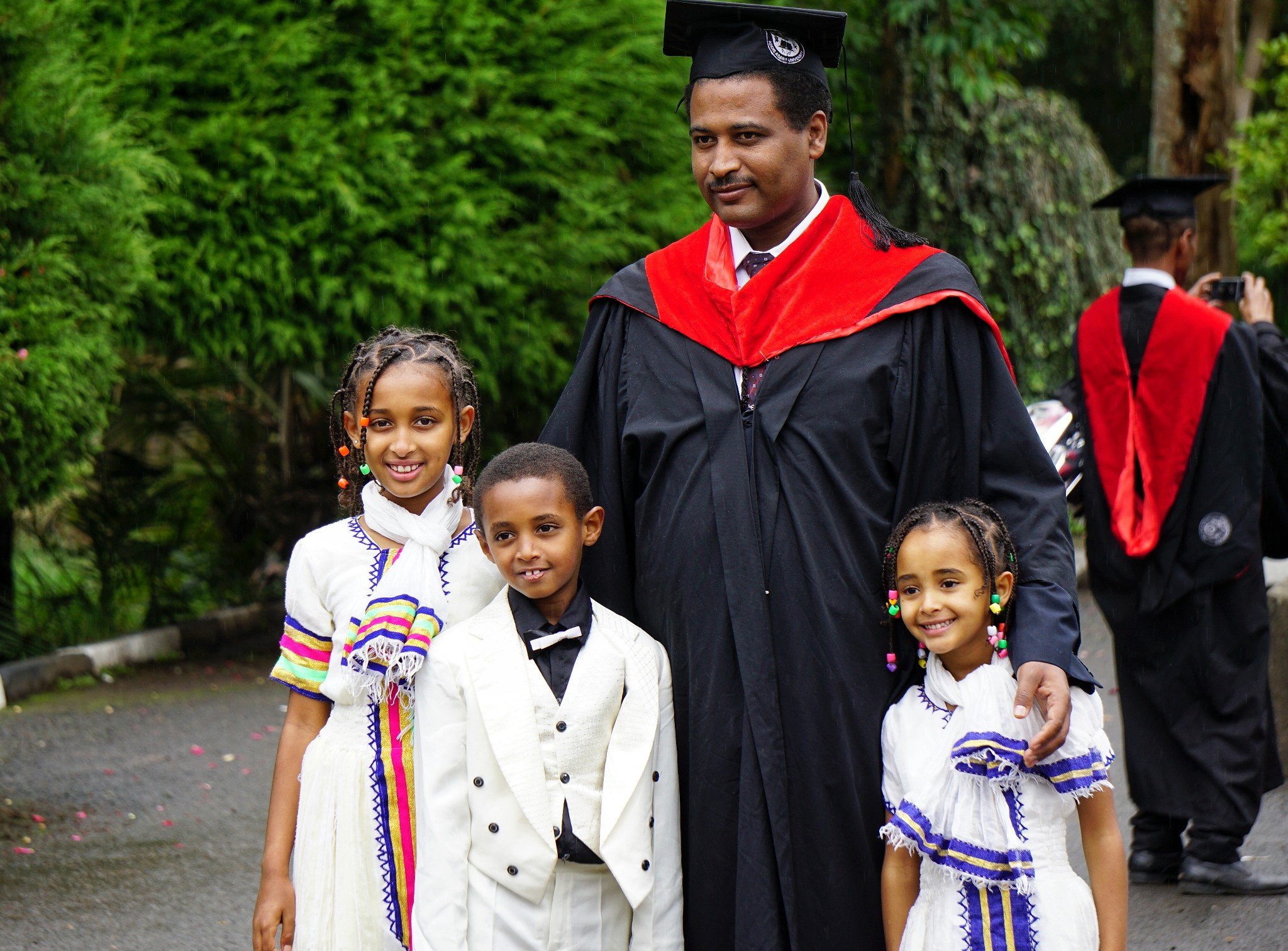 学校内读研究生不限年纪,在校园中 ,还可见大龄学生有携家带口来拍毕业照,萝莉们陪着毕业生爸爸一起提前感受埃塞俄比亚高等学府的魅力。