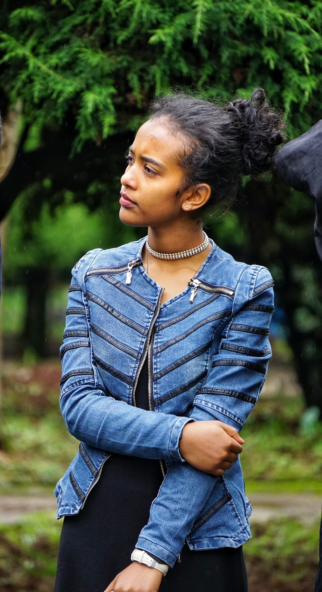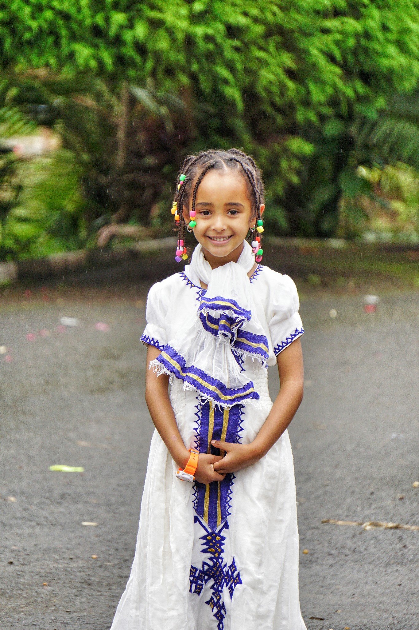 特写在细雨中端庄的小萝莉,橙色的电子表展示着家庭的殷实与幸福。