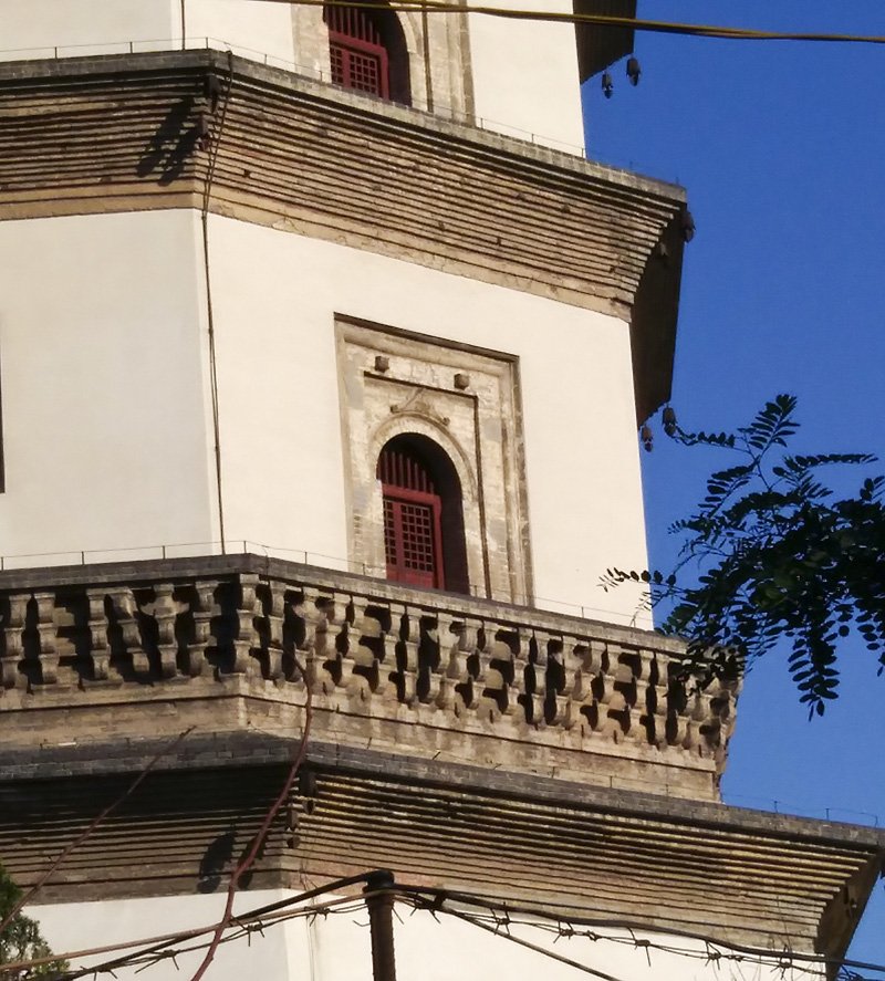 塔为八角形,共11层,高达80多米,是我国现存最高的古砖塔,素有“中华第一塔”的美誉。颜色是那种淡淡的黄,叠檐、券门、盲窗是砖灰色,盲窗是由精美花纹砖雕彻成,券门上也是砖雕的门额、门簪。仔细看最上面的三层颜色略微加深,有重修的痕迹。再细看,最上两层的盲窗都改成了券门,应该是方便眺望吧。整座塔给我的感觉厚重经典,没有更多的花哨,但沉稳的模样让人久久不忘。