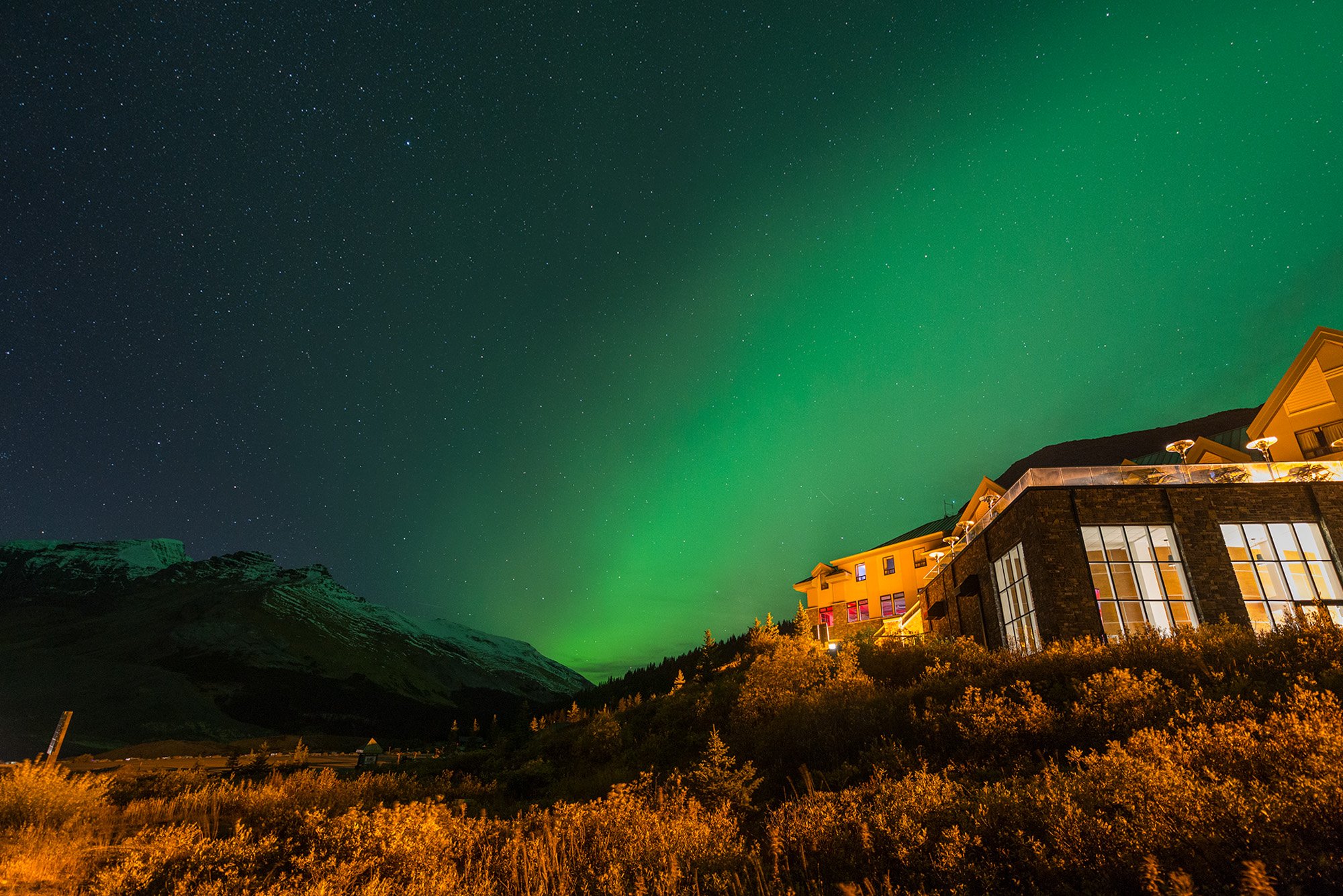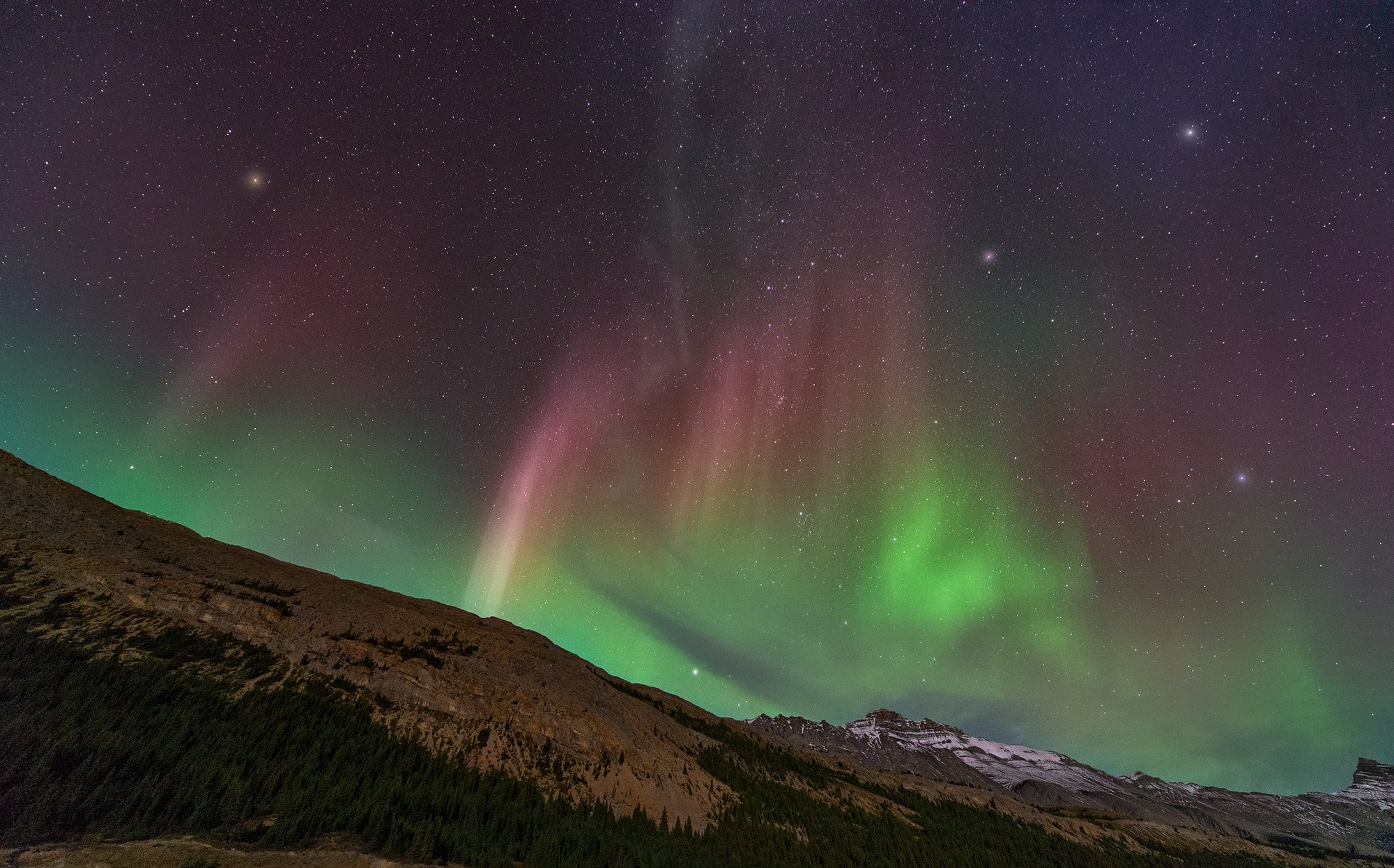 本次行程最激动人心的时刻就这样不知不觉的来了,突如其来的幸运就这样降临了。饭后打算去拍雪山星空,拿着相机脚架走出宾馆,月亮已经西沉,很快就要落入雪山后面。漫天的繁星虽然熠熠闪耀,但是晚上的雪风真不是盖的,吹得人有些受不了。打算随便撸几张就回屋休息。在抬头观星之时,突觉东方有异样,灰白色的一条带子横在山顶,像云却又不像。难道是。。。。。虽然在游客中心卖的画册上看到过照片,知道这一带确有看极光的可能性,但不管是朋友来玩儿还是看了那么多游记,都没有提到。迅速架好相机,对着东面来了一张长曝光。照片一出来就惊得嘴巴合不拢了,真TM是极光!!立马狂奔回酒店让家人一起出来看。路过酒店门口的时候酒店的一个工作人员妹子看到我拿着相机跑得上气不接下气,就问我是不是看到极光了,她说她在Jasper镇上的朋友刚发短信让她出去看极光,她在这里上了一年多班了还是第一次碰见。