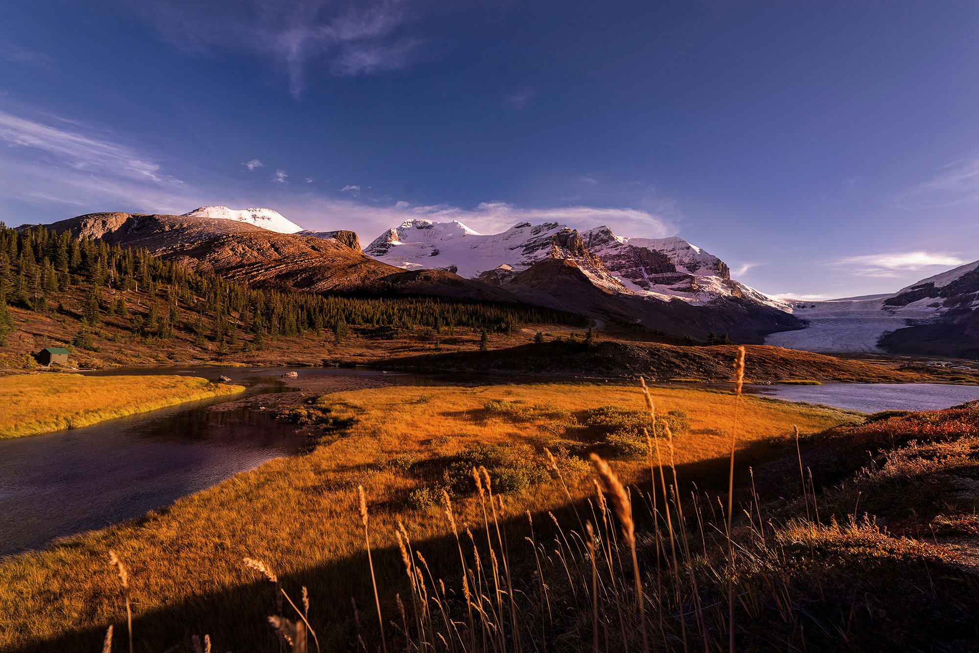 赶在日落前到达了哥伦比亚冰原游客中心,停下车抓起相机就冲到马路对面。Mt.Athabasca和Mt.Andromeda就像要胡到脸上一样就耸立在当面前,当天的日落阳光仿佛给整个世界镀上了一层金红色,不知是冰川刮来的呼呼雪风还是眼前这无比壮丽的景象,让人热泪盈眶。