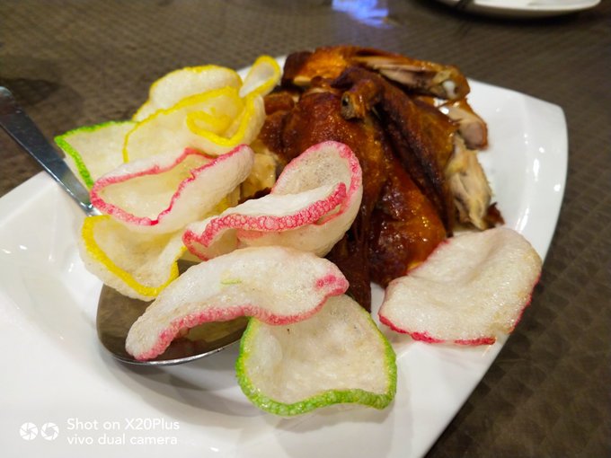 还有这个烤鸡,伴着五颜六色的龙虾片。爱吃龙虾片的我,烤鸡还没来得及吃,到把龙虾片给消灭干净了。