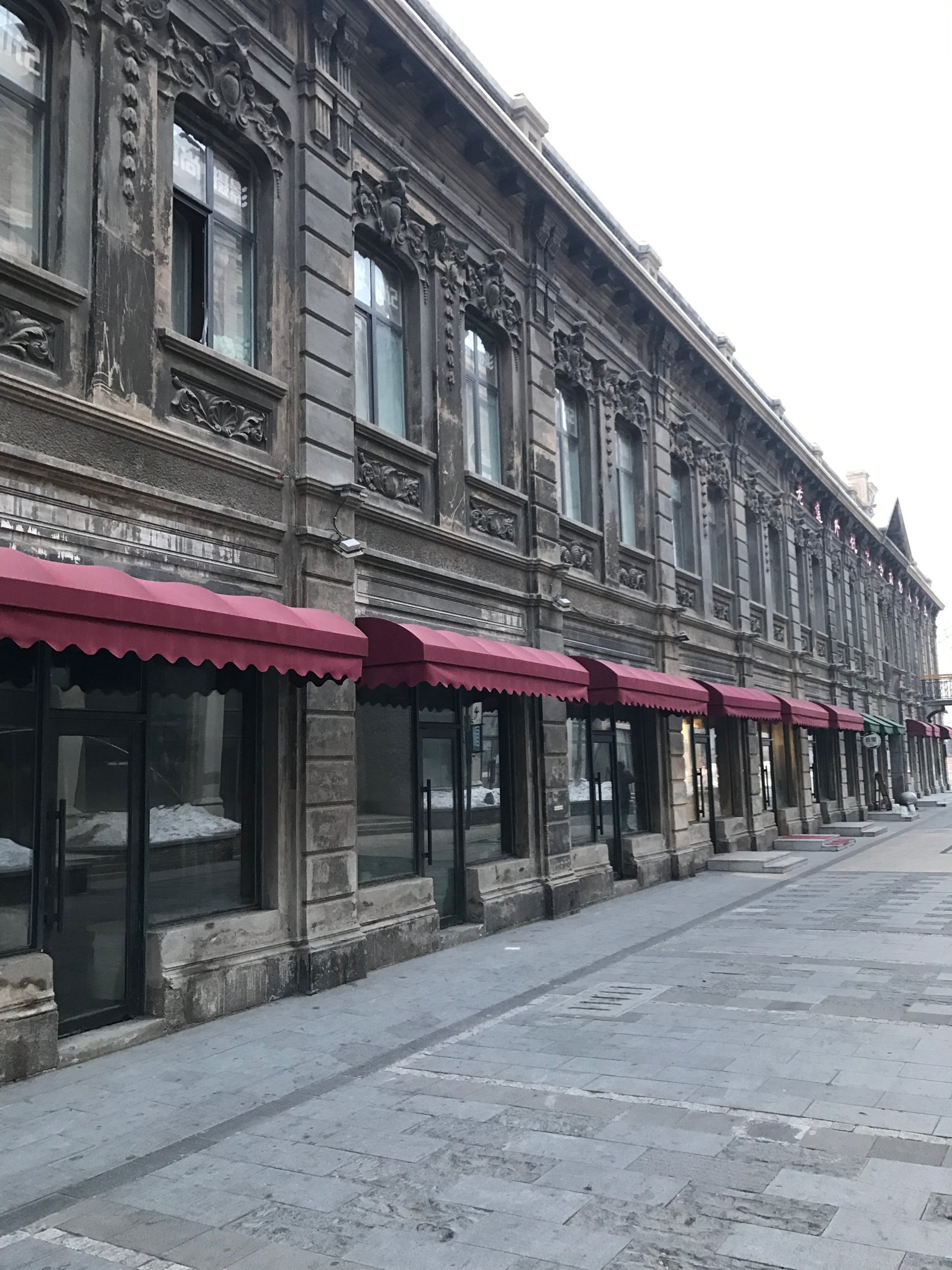老道外浓浓的巴洛克建筑风格,街道两边许多小吃。