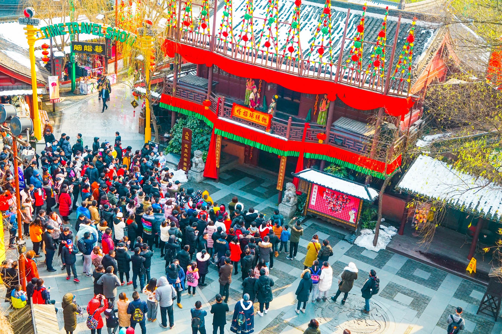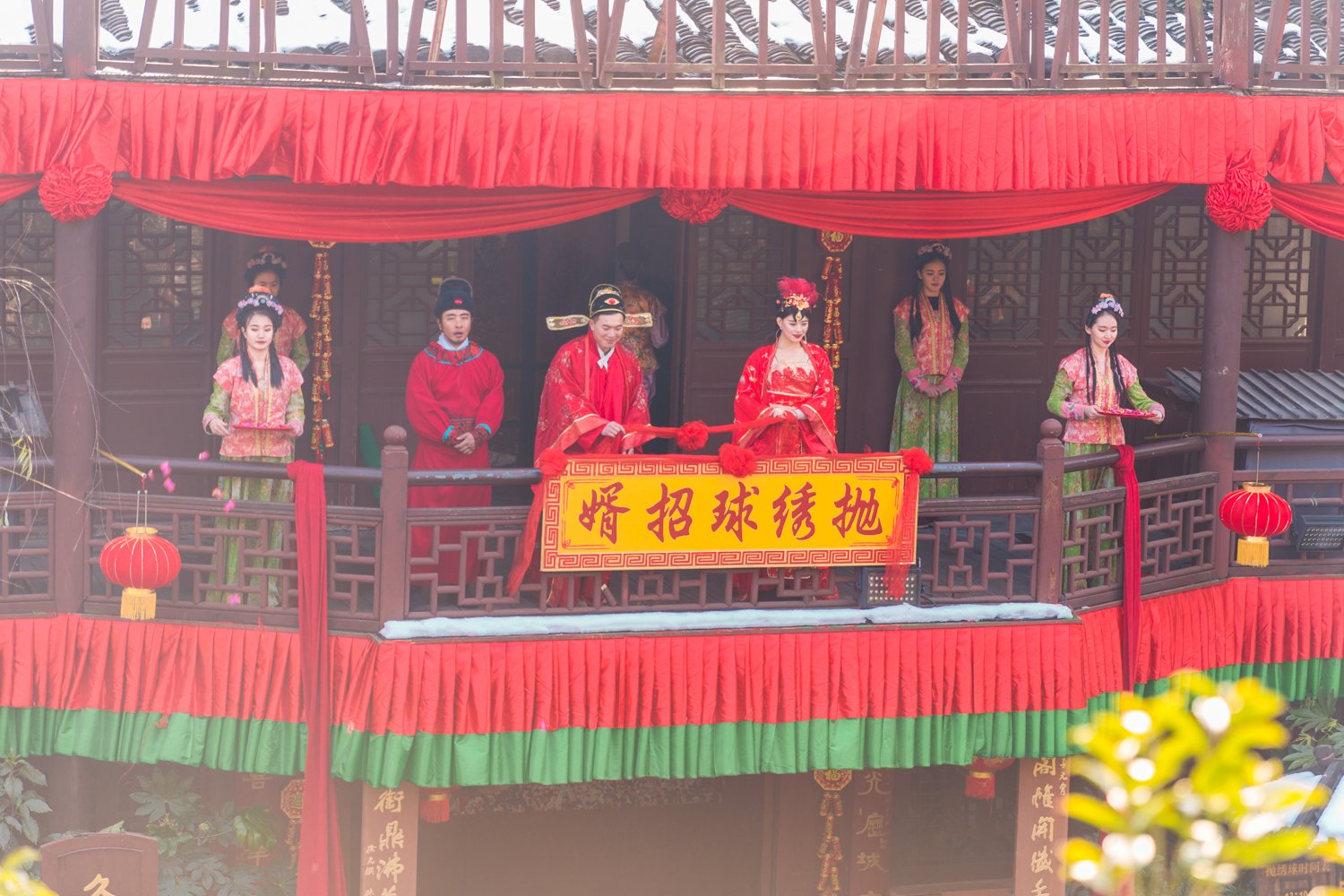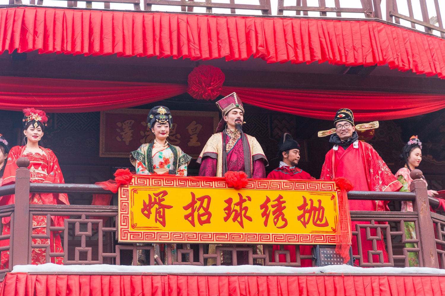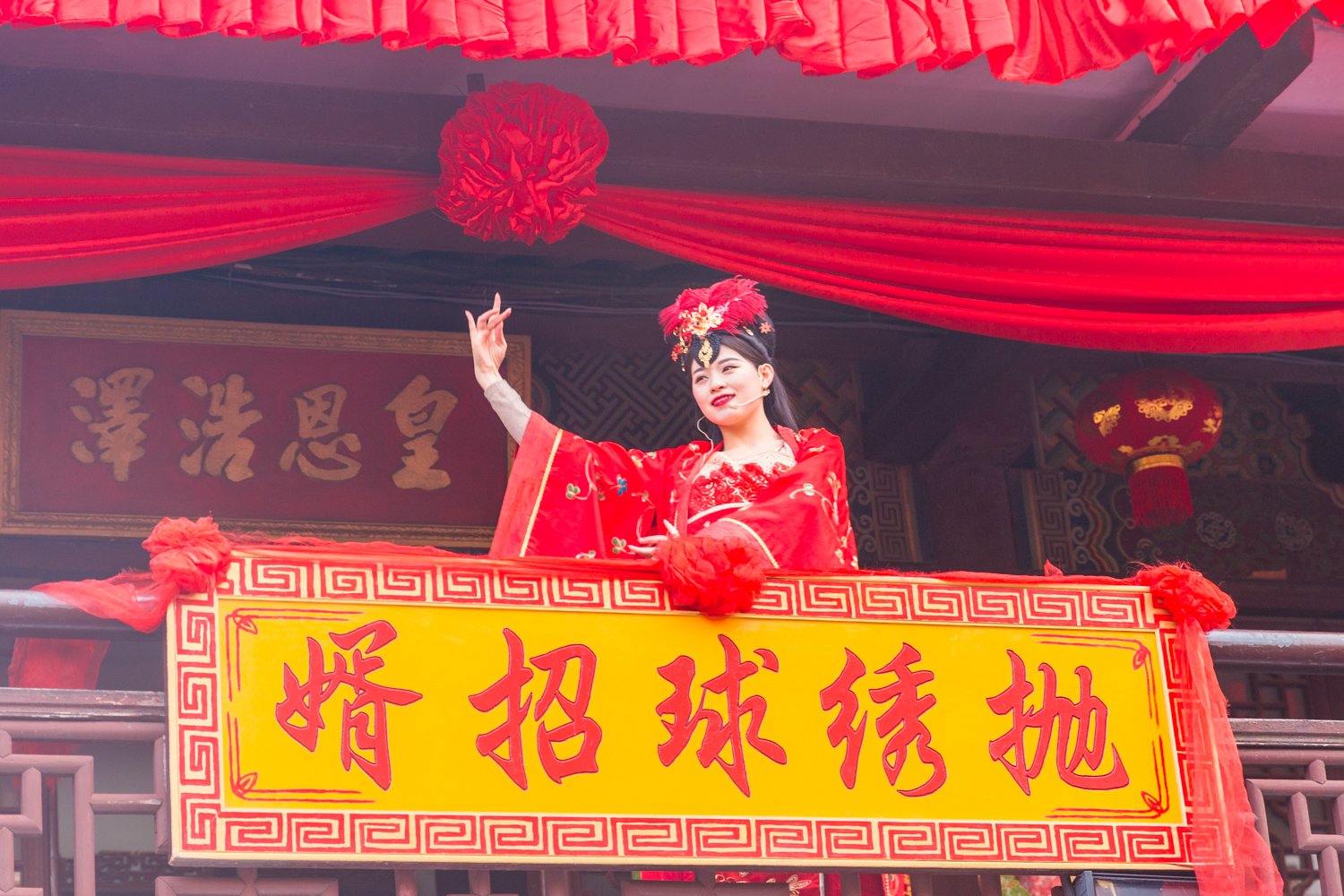 据说到宋城,不可不看的表演就是“抛绣球,争做王员外女婿”。