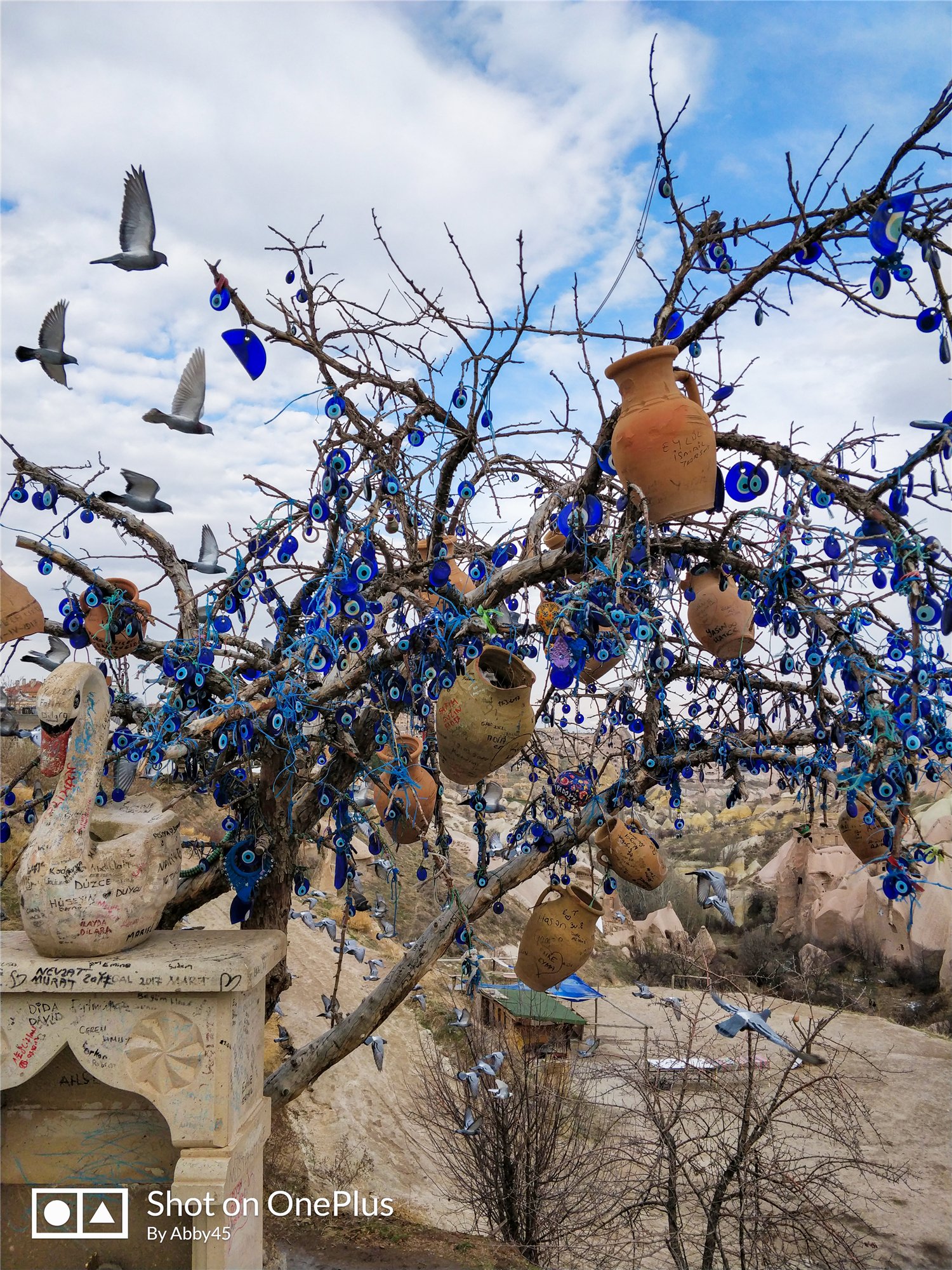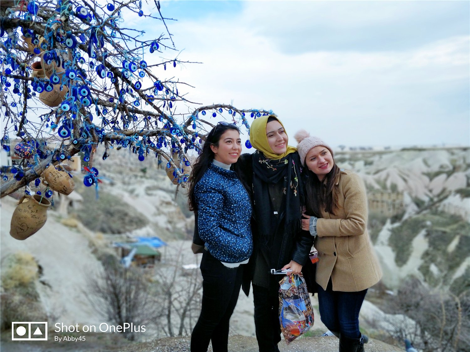 这里还有蓝眼睛树。就像中国挂满红色丝带的许愿树一样,这里挂满了蓝眼睛。蓝眼睛也叫“土耳其之眼”,标准称呼是“美杜莎之眼”,这位希腊神话中的女妖传说中能将任何直视她眼睛的人变成石像。为了凸显拍摄的主体人物,我用了5T的人像模式,全新升级的人像2.0虚化效果显著,和单反不相上下。