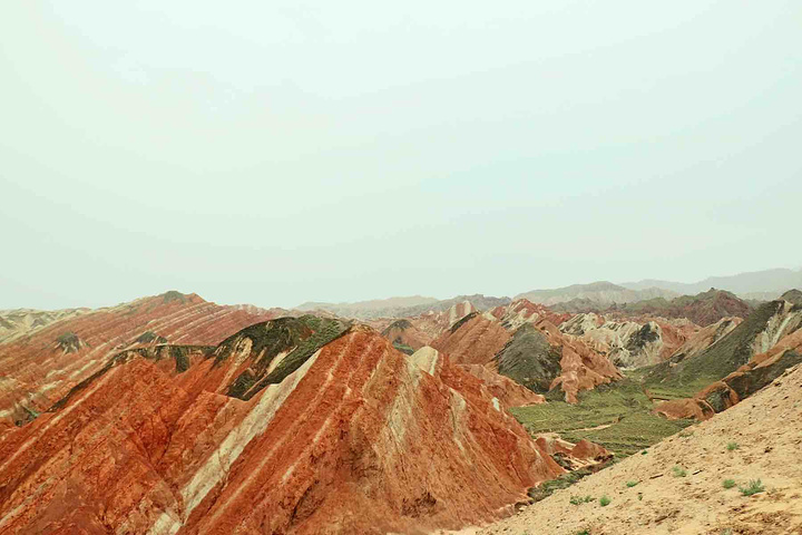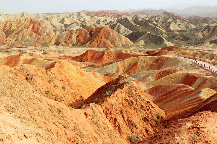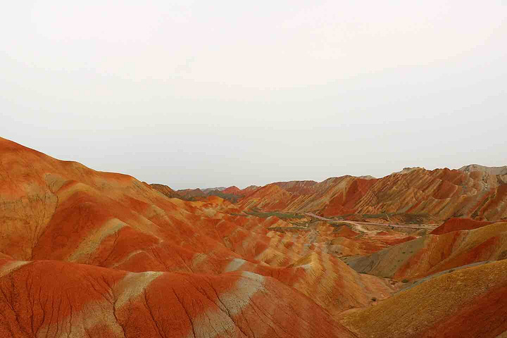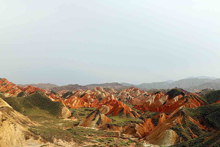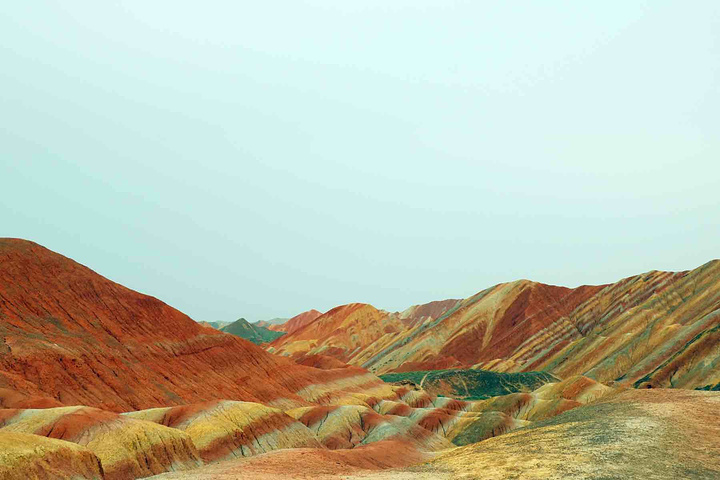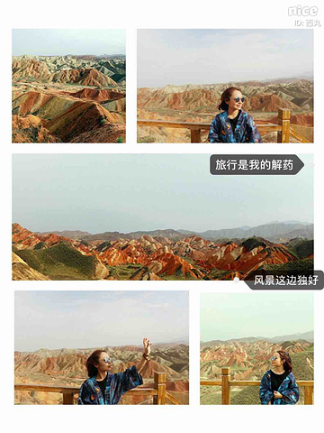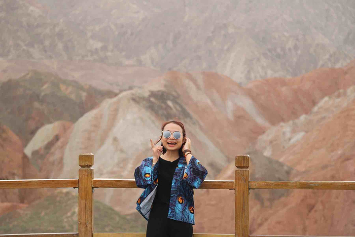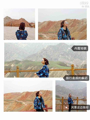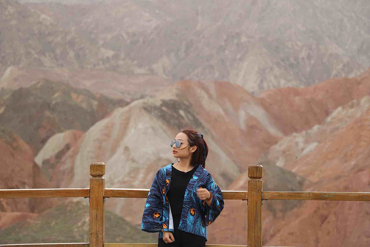 是上帝不小心打翻了调色盘,目光所及的每一寸土地都是视觉上的洗刷,同样洗刷人的还有炙热的阳光,身在景中,感叹由心而生 ,那种醉人的美,那种梦幻般的奇异,那种巧夺天工的雕砌 。不是我能用文字或者图片可以来描述的。 一座座起伏的丘陵七彩各异,就着晨光步入眼帘,这样七彩的美景是上帝不小心打翻了颜料,还是七仙女的彩衣漂落了人间?感觉是如此的不真实,就像画家笔下的一幅油墨,又是如此的真实,伸手并可触及!彩色丘陵景区主要分布在临泽县倪家营乡,被《中国国家地理》杂志评为中国最美的七大丹霞地貌景观之一,具有非常重要的科学研究价值和极高的旅游观赏价值。丹霞地貌作为古老的地质遗迹,它发育于侏罗纪至第三纪时期,是喜马拉雅山运动中发育形成的红色岩系随着地壳的抬升,山坡以崩塌过程为主而后退,保留下来的红色砂岩经长期的风化剥离和流水侵蚀形成了孤立的奇岩怪石,所以其突出特点为“色如渥丹,灿若明霞”。 公交: 【外部交通】丹霞最好秋季9-10月前往,在张掖汽车西站乘坐张掖到肃南县或者临泽县的班车。从张掖汽车西站有班车直达丹霞公园,到景区门口下车即可,票价10元/人。运营班次为9:00:-12:00每1小时一趟,15:30、16:30各一趟。 临泽丹霞由西入口进,肃南丹霞在东入口。国庆期间包车前往,上午冰沟下午七彩丹霞,七座面包车600元 【内部交通】临泽管理区内,有观光车可以到景区内的四个观景台,车费20元/人 【观景指南】有4个光景平台,其中,观景平台 1 号观景台离大门很近,步行10 分钟左右。1号观景台是4 个观景台里最大的一个。2号观景台距离1号观景台步行10 多分钟,但是由于都是山路也费些体力。2 号观景台是景区里最高的观景台,可以看到景区的全貌。但需要爬666 节台阶,大概半小时才能到达观景台最高处。建议时间充裕的体力佳者登上游览。3号观景台可以看到著名的七彩扇。这里的台阶都做成了三种颜色交替的彩色,跟类似颜色的山摆放在一起相得益彰。4号观景台是主观景台,设在一道东西向的山梁上,由大道爬上山梁,向南面眺望,东侧的七彩山岭将在落日光照下,呈现斑驳陆离的景象,也就是著名的刀山火海景点。在这还可以遥看张艺谋拍摄三枪的麻子面馆,也是观看日出和日落的最好地点。【宿】七彩丹霞是很成熟的旅游区,周边吃住配套齐全且选择多样,旺季前往需提前订好房间。