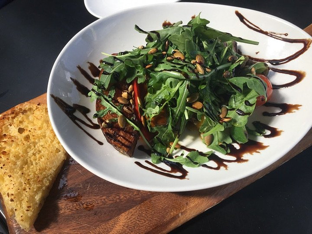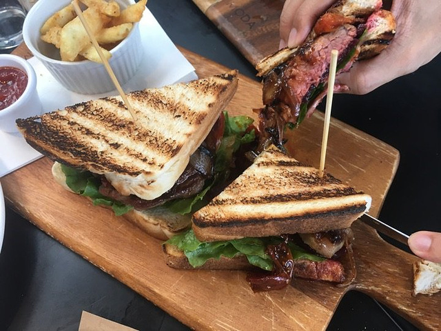 这家餐厅就在市区沙滩泳池前 很容易看到 周末或假期许多local都会到这里 游泳 晒太阳 喝杯啤酒 大概就是当地人休闲娱乐的方式吧 点了这两道菜 一个是牛排三明治 肉的分量很足啊 表面的面包烤的酥脆 一口咬下去要流汁 另一个是蔬菜沙拉 有南瓜 时蔬 樱桃番茄 很健康营养 不错👍