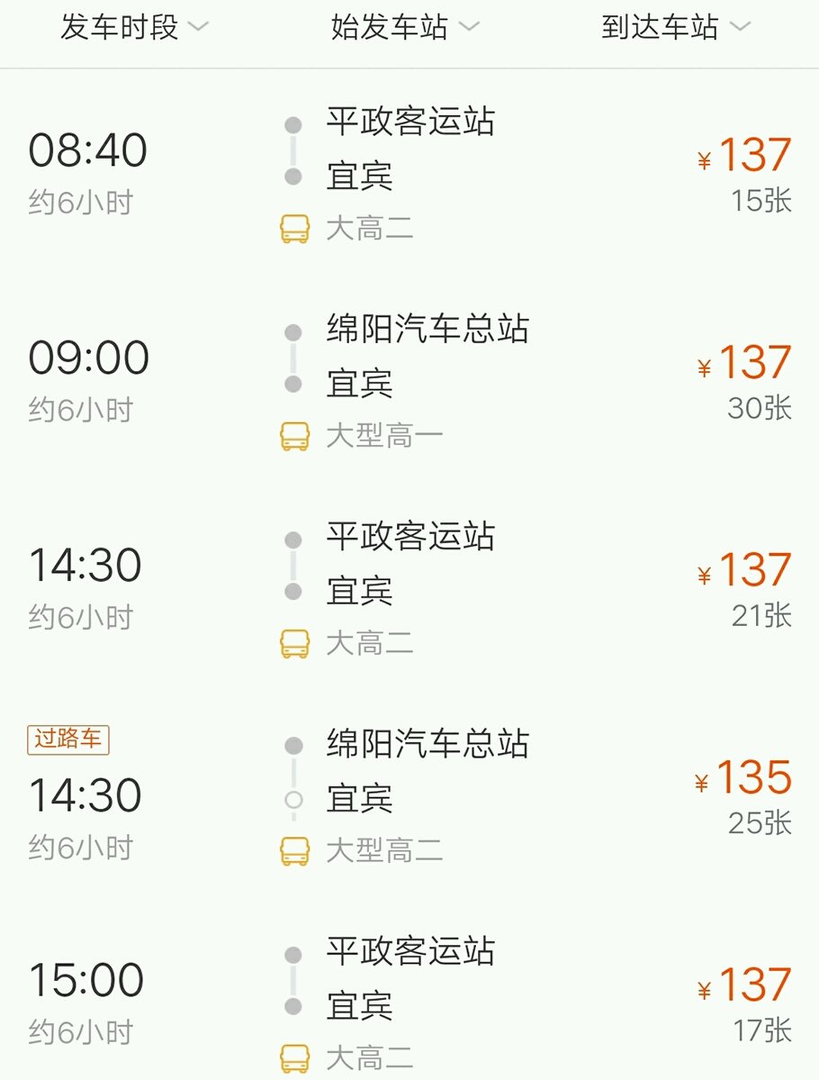 从绵阳直达宜宾的班车每天有6班,很方便,可以直接在平政汽车站或者绵阳客运总站坐车,买票时一定要注意你在哪个车站乘车。