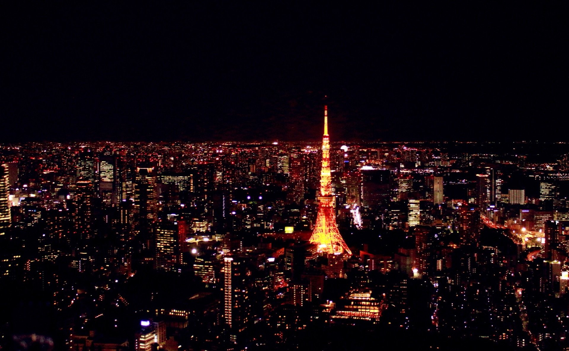 从高处看下去,东京高楼林立,灯火通明,最耀眼的东京塔发出暖黄色的灯光