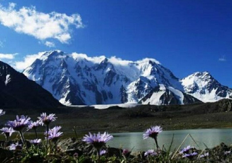 常年的高山积雪,下面的小湖就是积雪融化后的产物,山下的野花为这座高山点缀了无限的美好,永远是那么高大神圣!