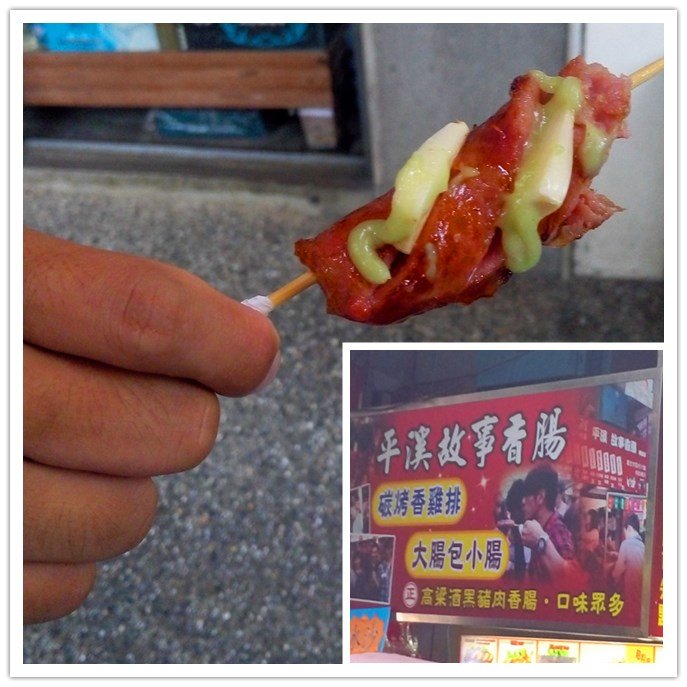 因为下着小雨,我们都没怎么拍照也没有好好走老街,直奔网上介绍的“平溪故事香肠”找吃的。用黑猪肉做的香肠表皮略带焦脆,肉馅肥瘦相间肉汁香溢,绝不是那种淀粉肠,经过炭烧后真是yummy yummy,我买了芥末味和黑椒味的,感觉黑椒味正路一点,芥末太浓郁了,都被呛到了。其实我很想再来一支,只是走远了,懒得走回头了。