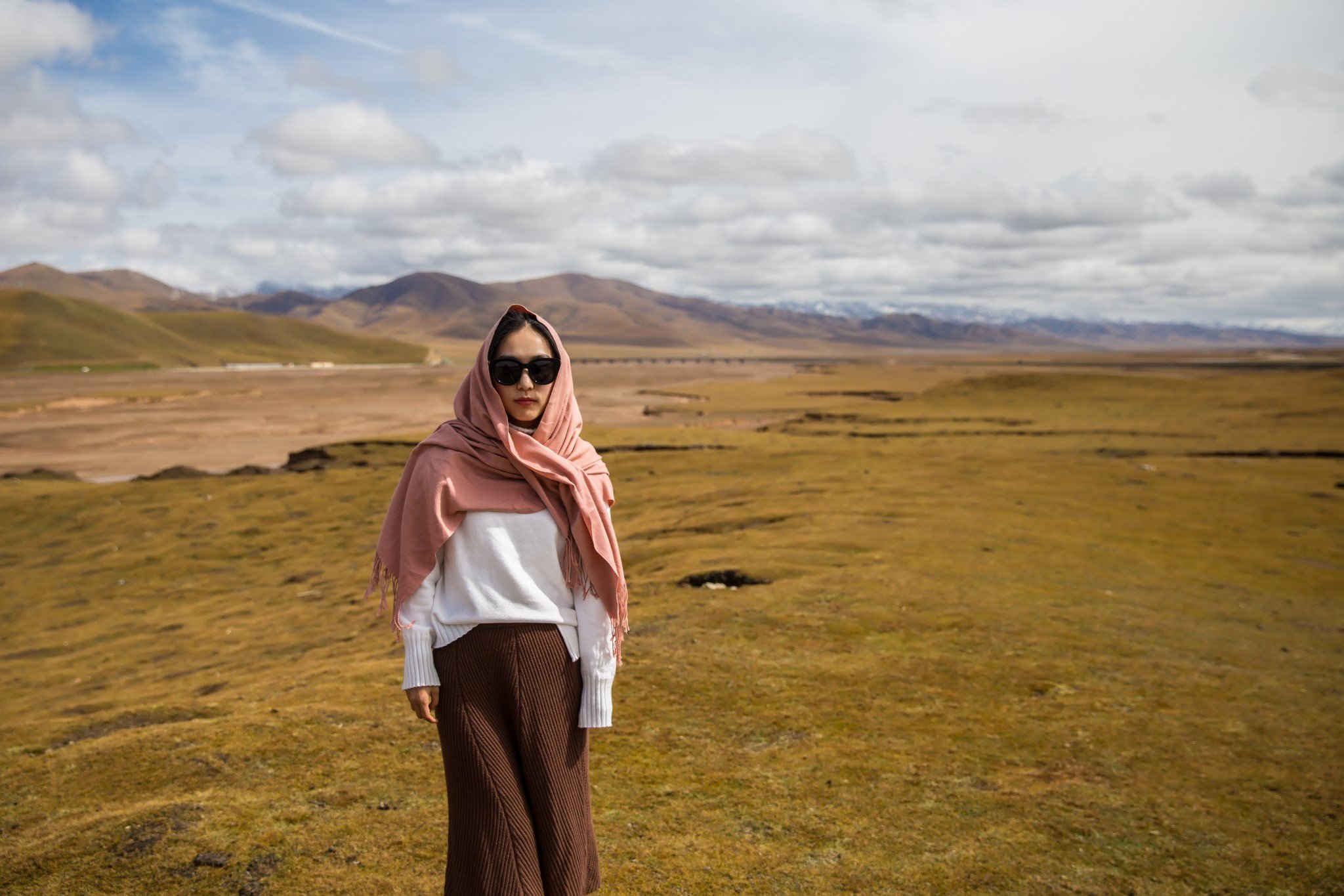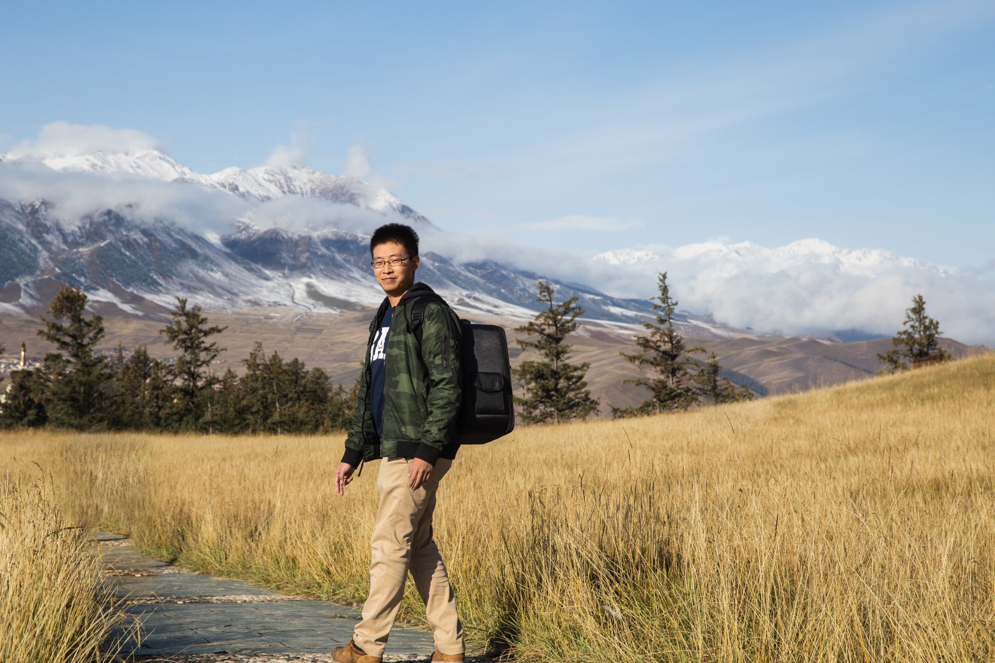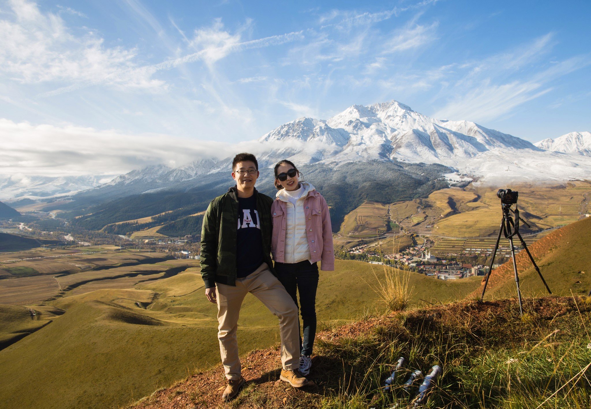 蓝天雪山还有很多云的好天气实在太适合拍延时了,可是行李都在酒店,我俩直后悔这次三脚架算是白带了。让两个在拍延时的老法师帮忙合张影。