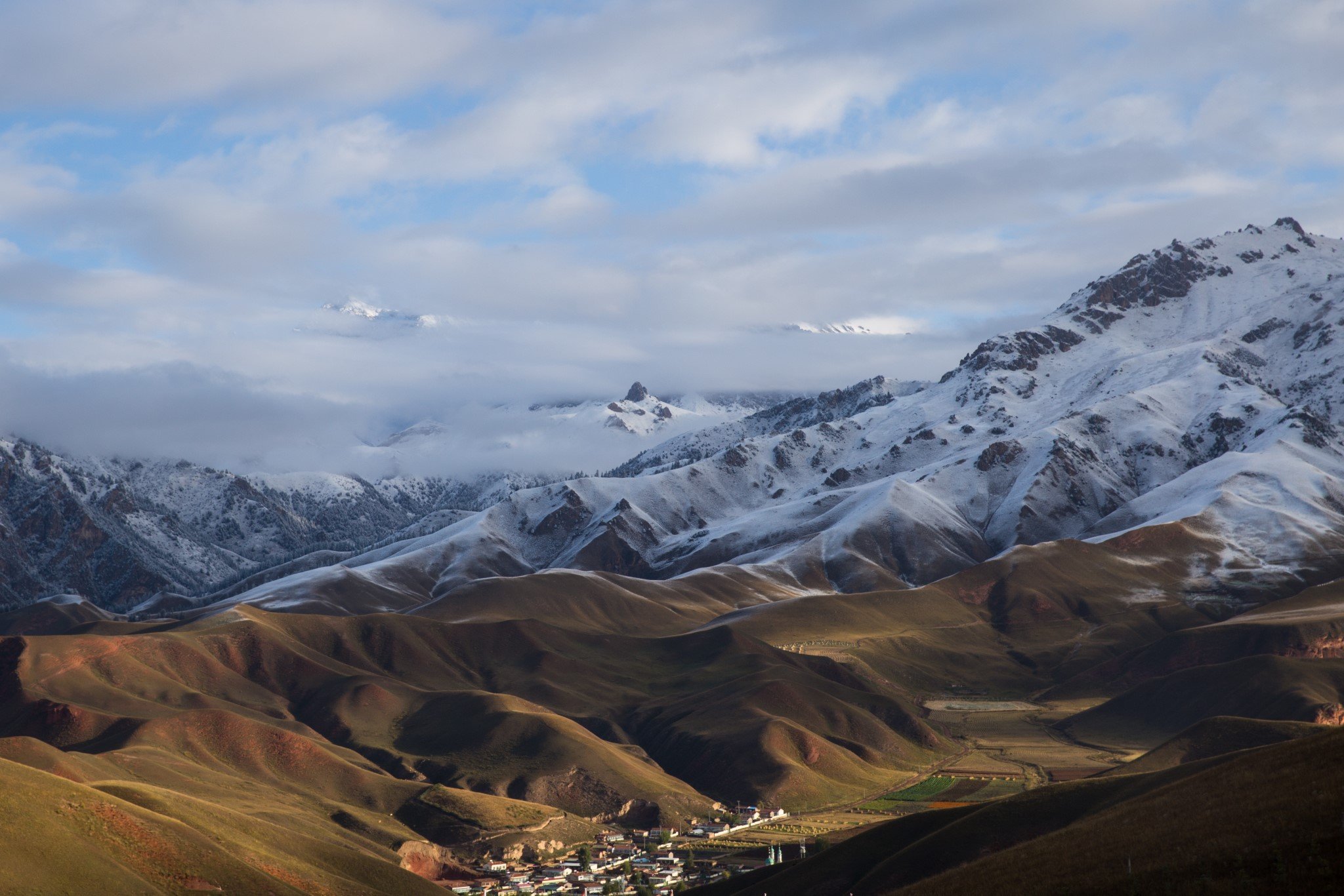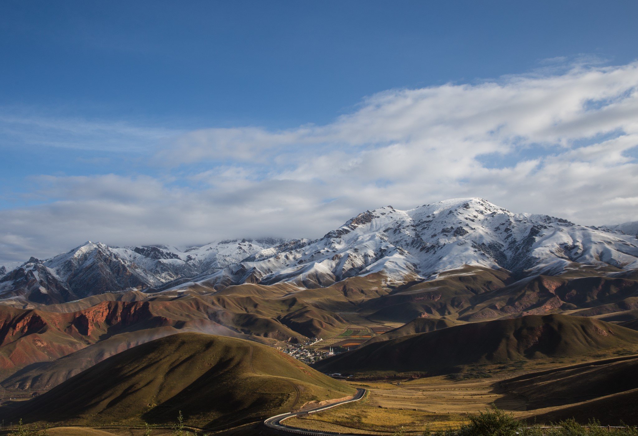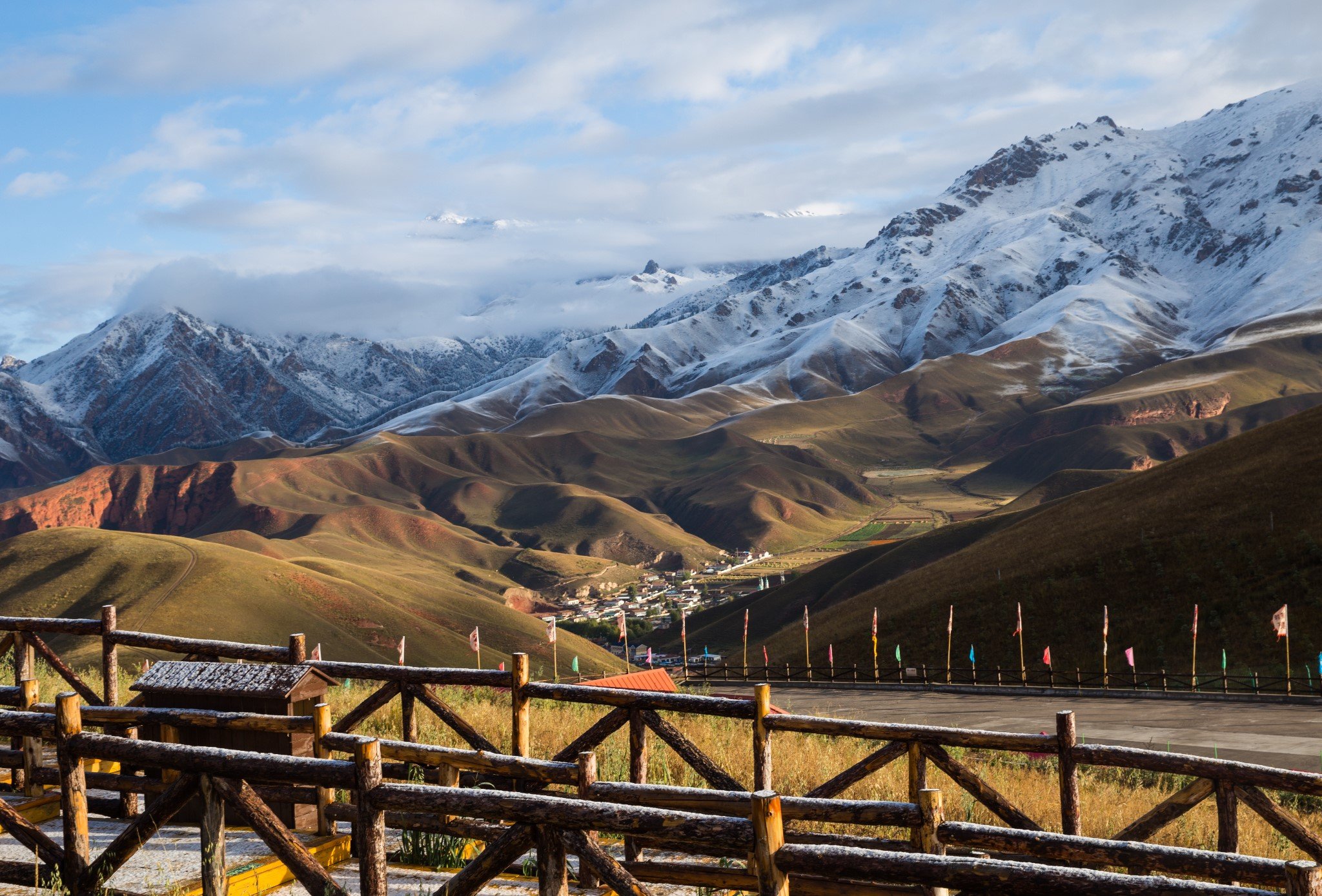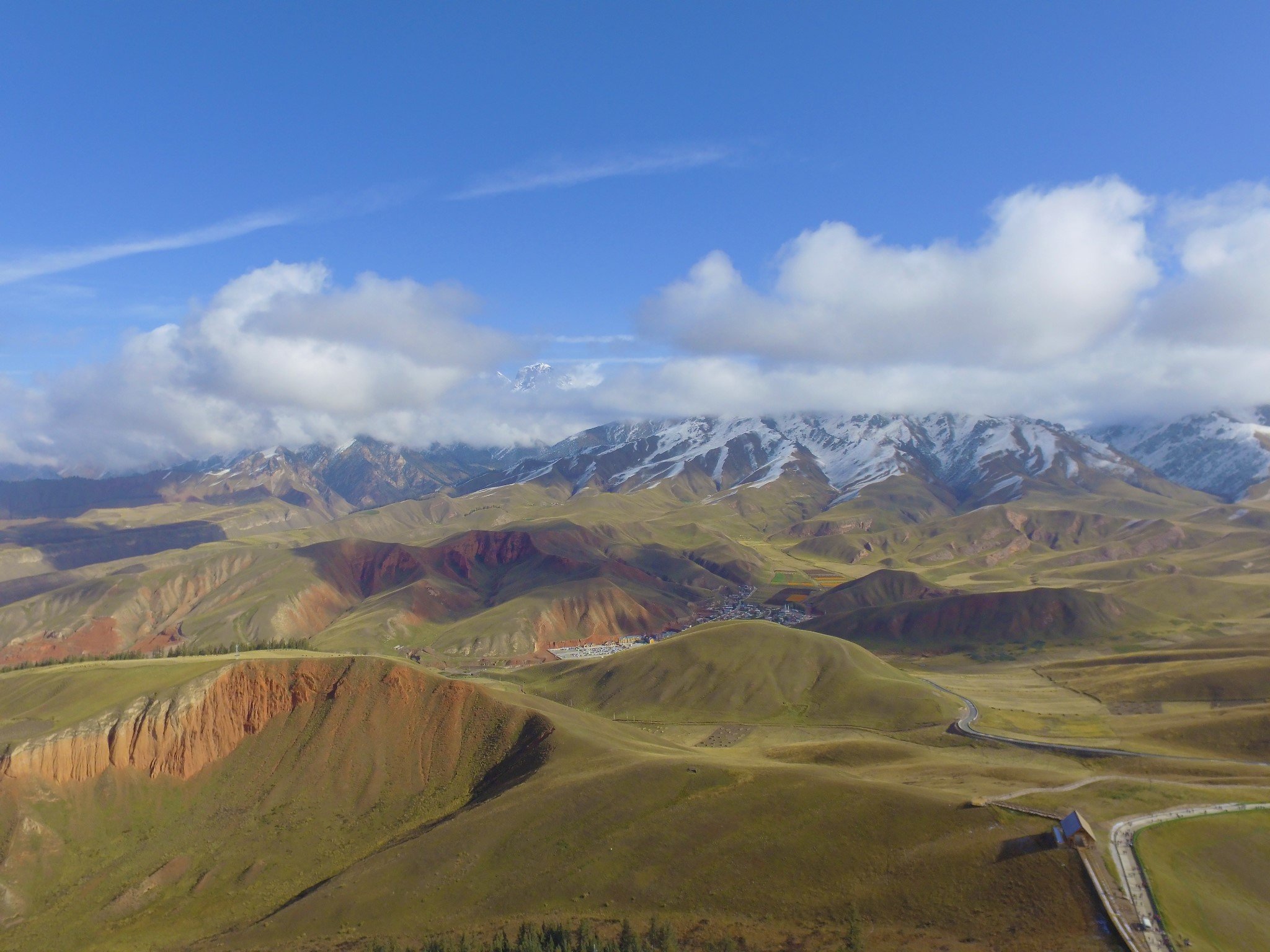早上吃过早饭,在祁连县城就看到了远处阳光下金灿灿的雪山。县城离卓尔山景区很近,十分钟就开到了。