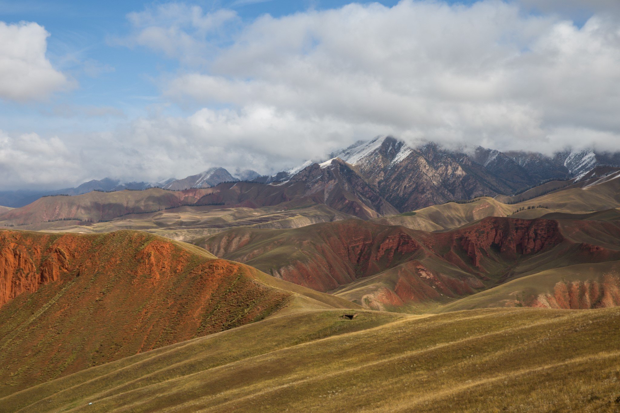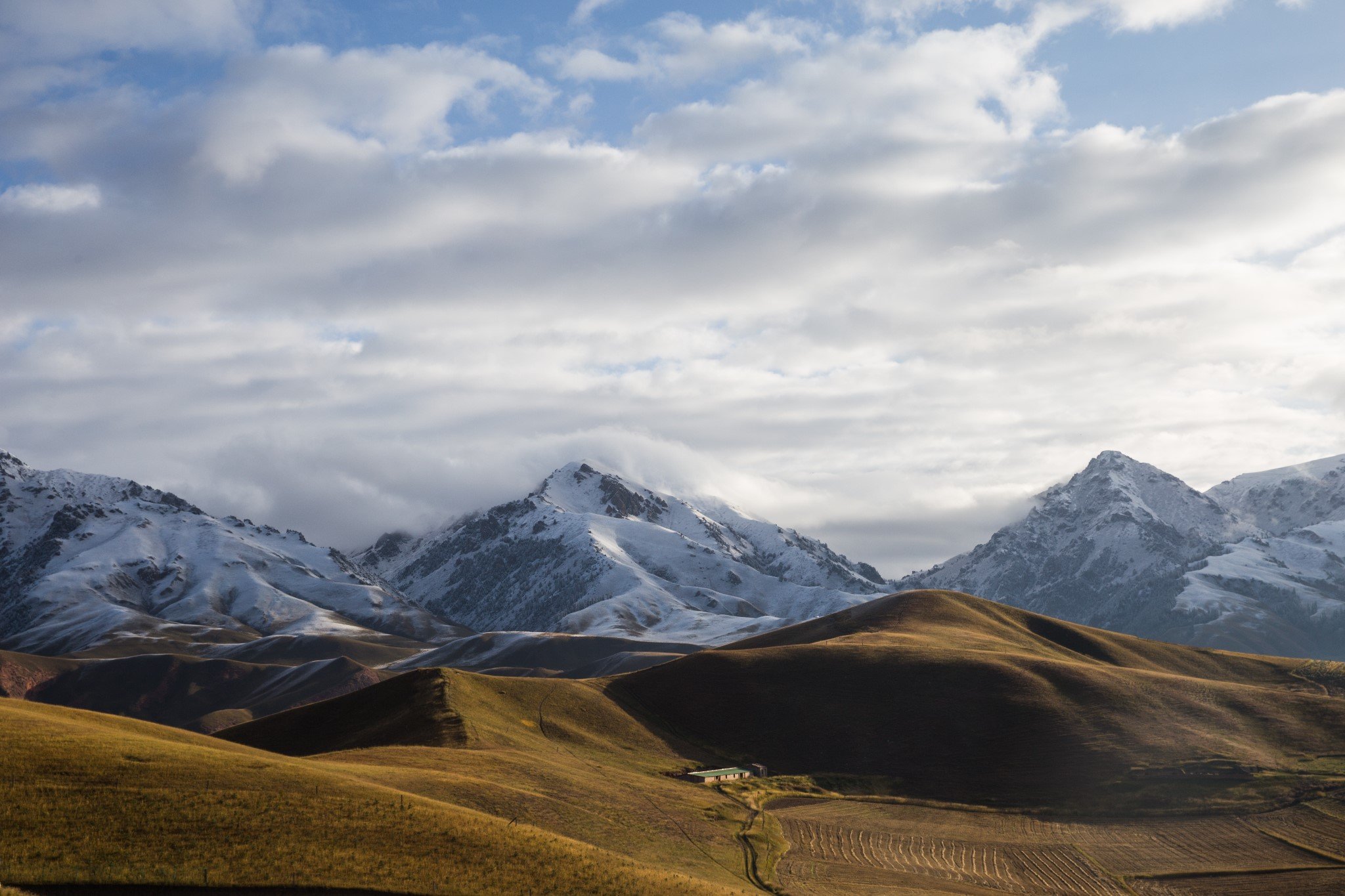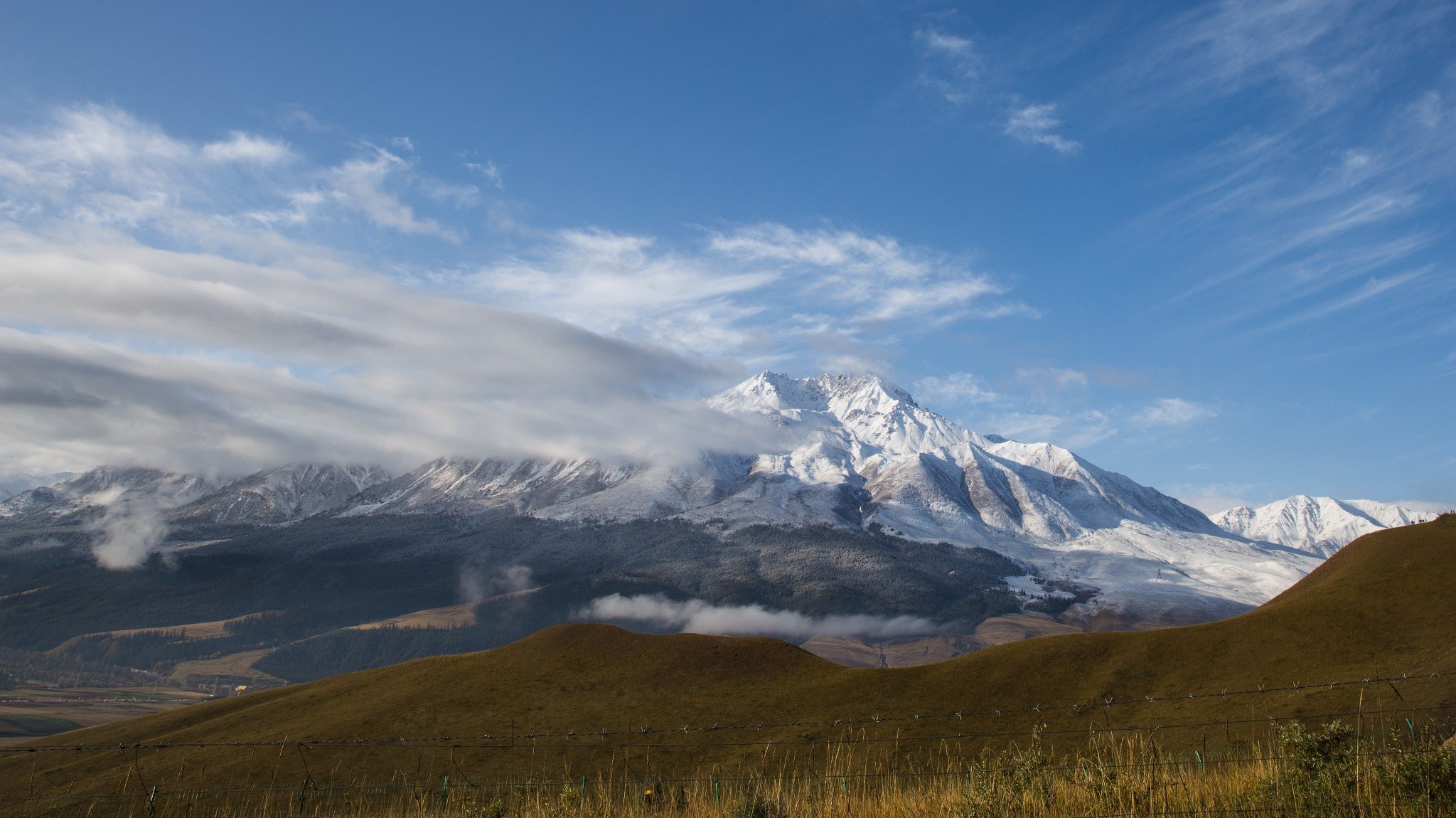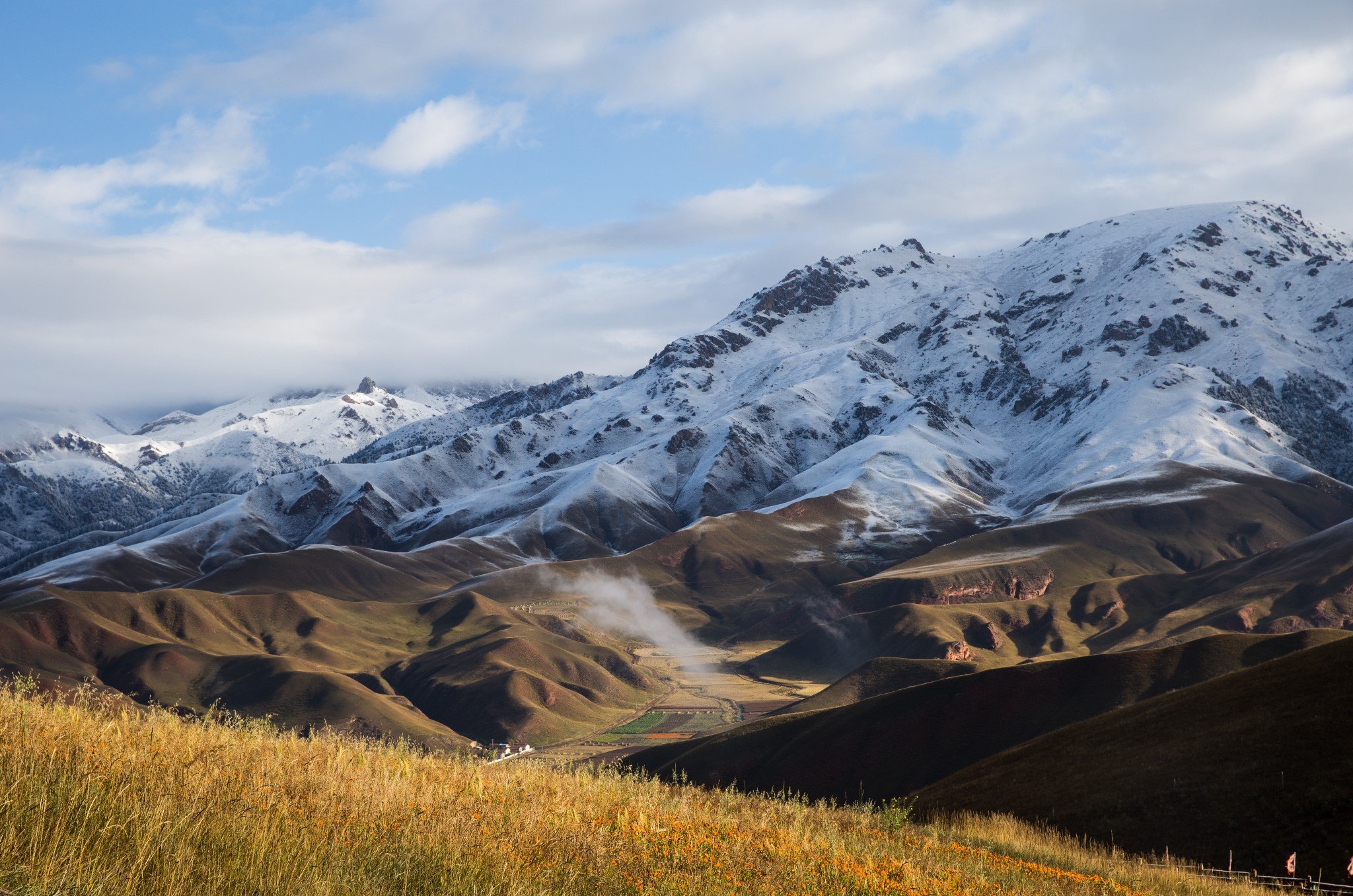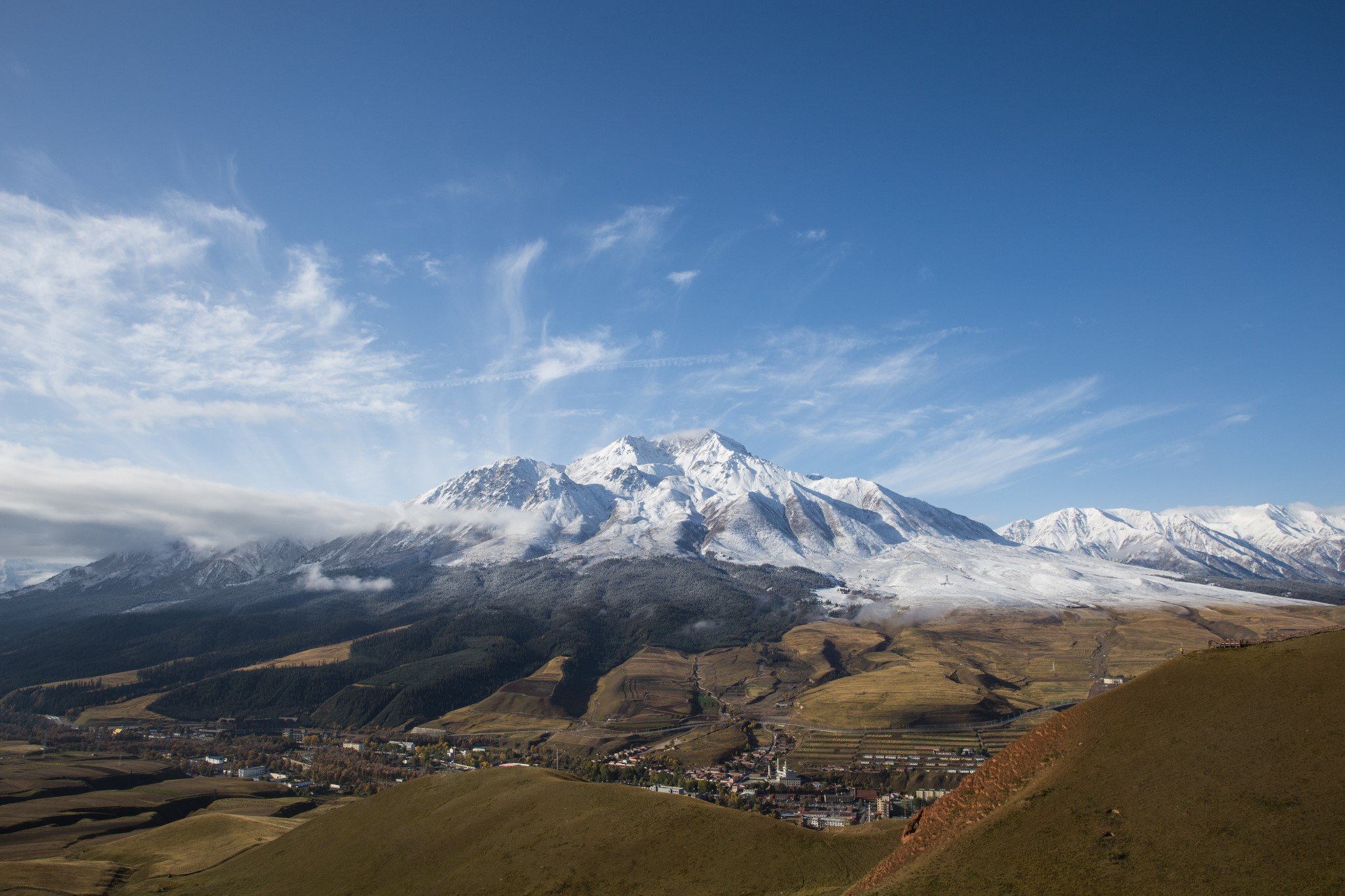 早上吃过早饭,在祁连县城就看到了远处阳光下金灿灿的雪山。县城离卓尔山景区很近,十分钟就开到了。
