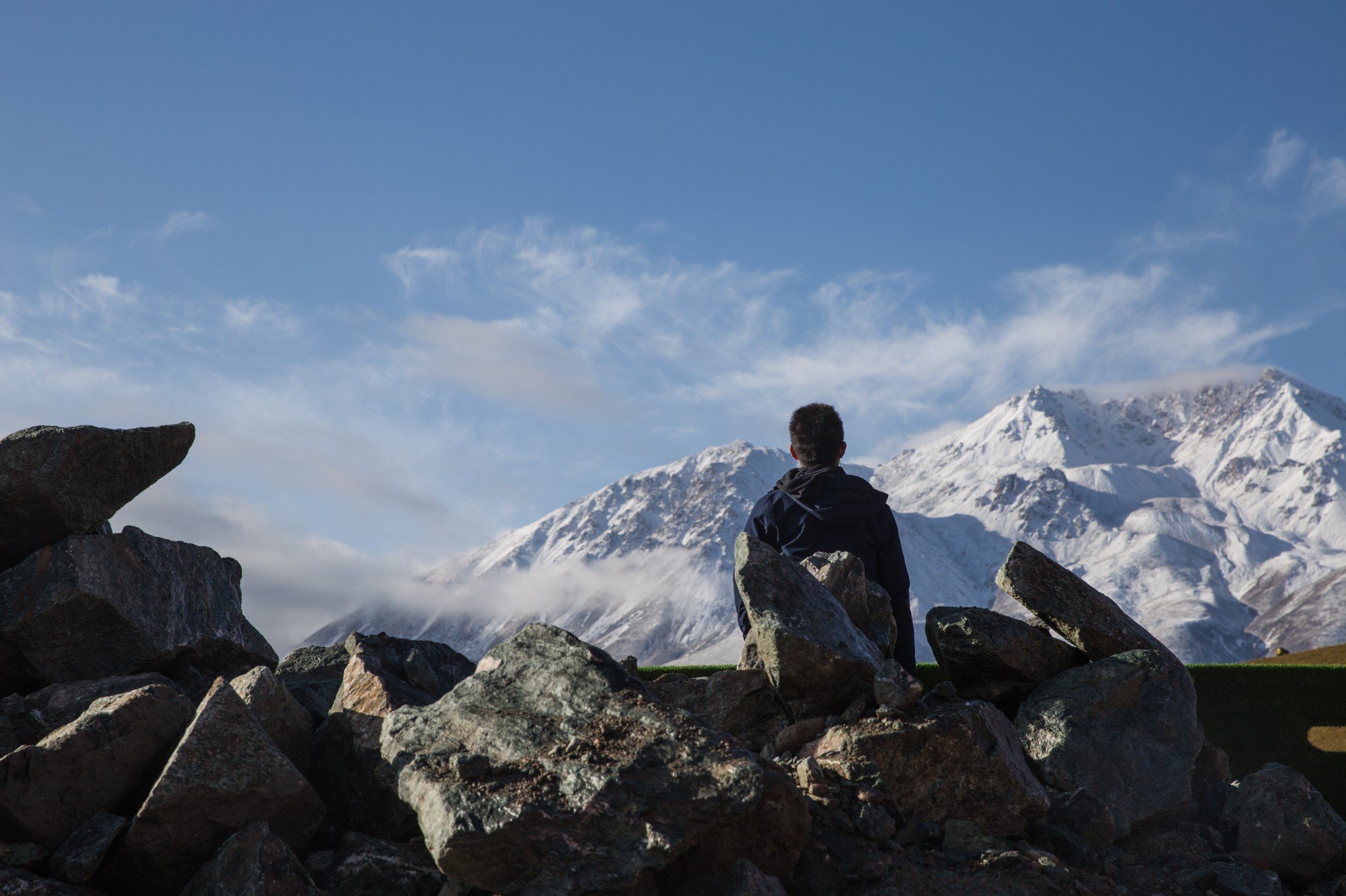 指挥我的专业模特站在乱石背后拍一张背影。眺望远方的姿态表现对理想和希望的追求,雪山和石块表现男人的坚毅与执着。#技术不够,胡说八道来凑#