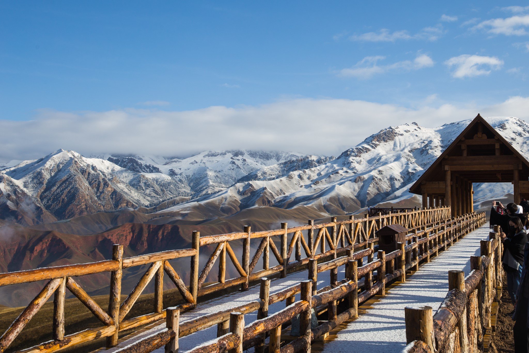 在大西北,虽然每天都要在路上很久,但风景也在路上。木栈道上积了薄薄一层雪,怕太滑不安全封了