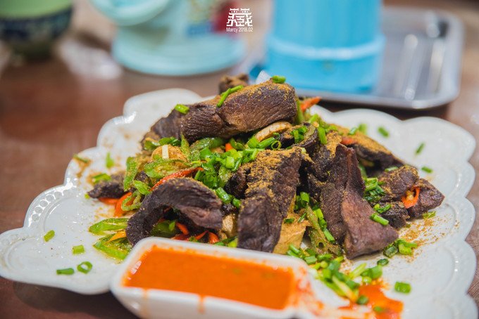烤牦牛肉,非常锻炼牙口,细细的品是很香的,沾着当地的辣椒酱,除了爽就没有别的形容了,一起的小姑娘被辣到直喊妈呀好辣,却也根本停不下来。