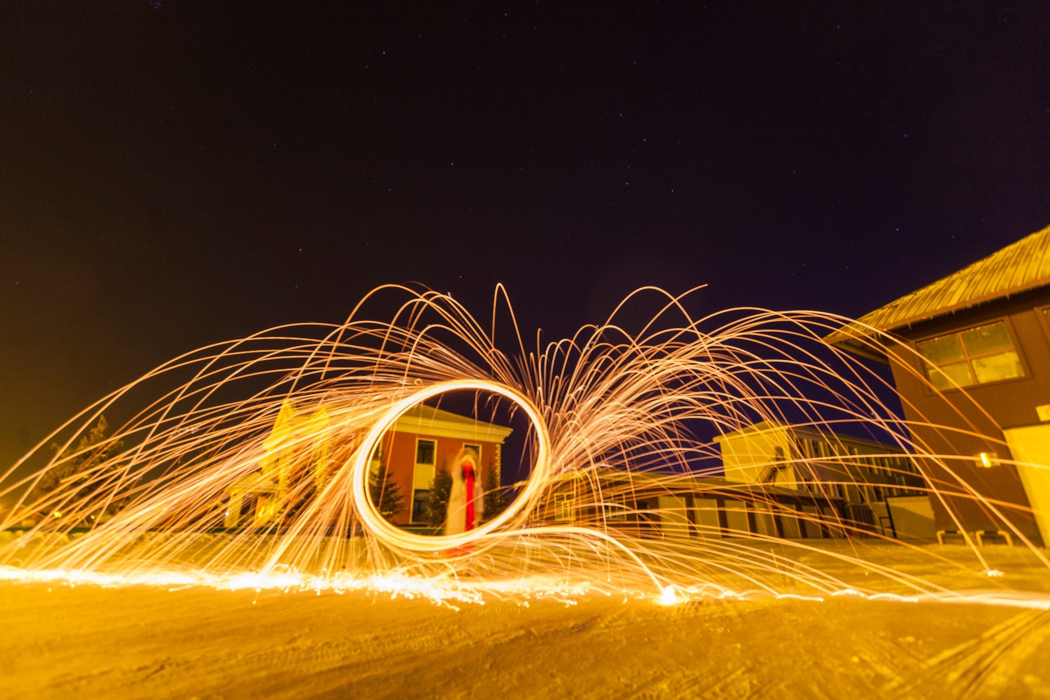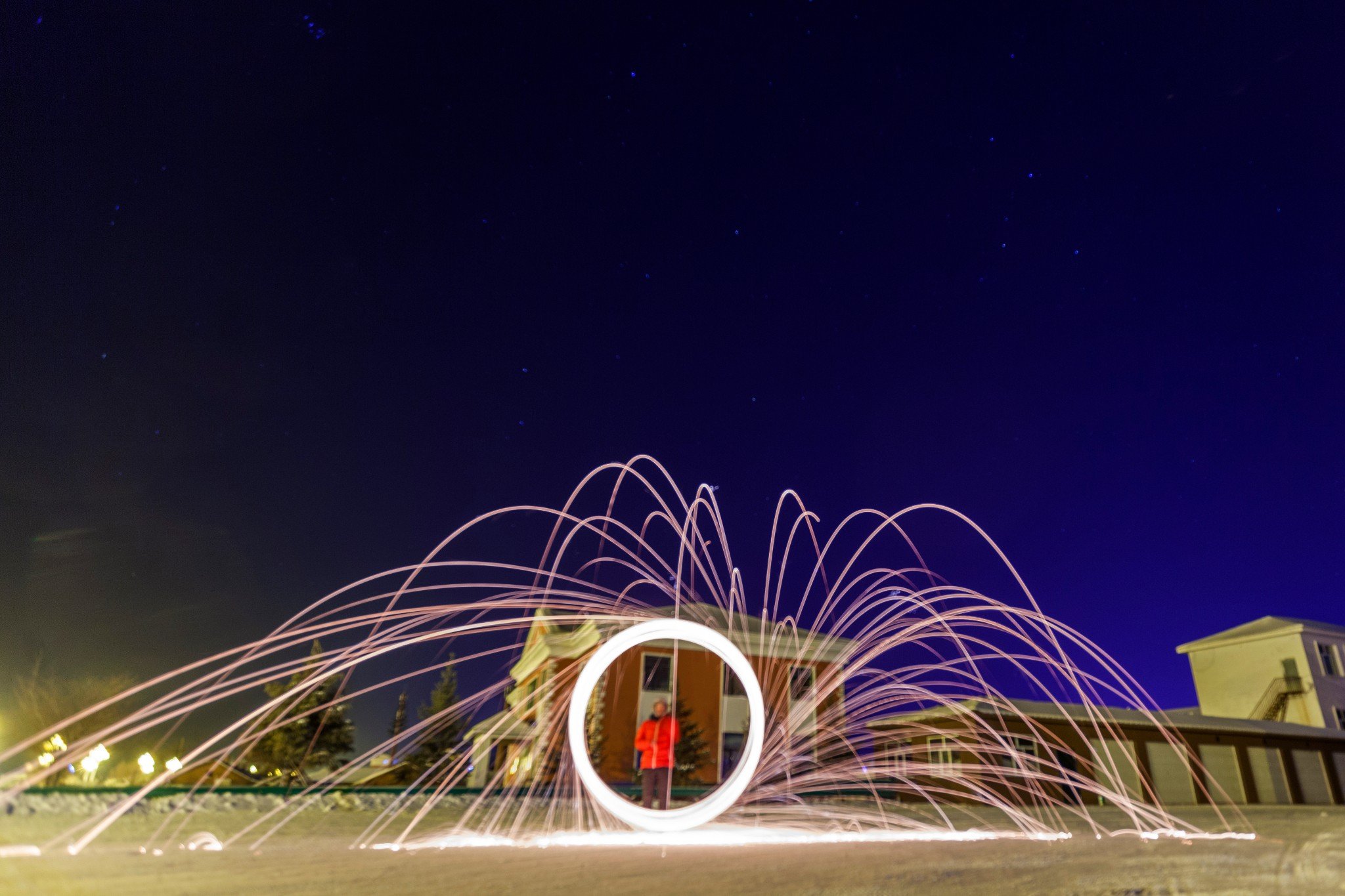 光绘,这边夜间的温度实在是太低了,钢丝总是无法充分燃烧,拉出的火花就没有那么浓密了。