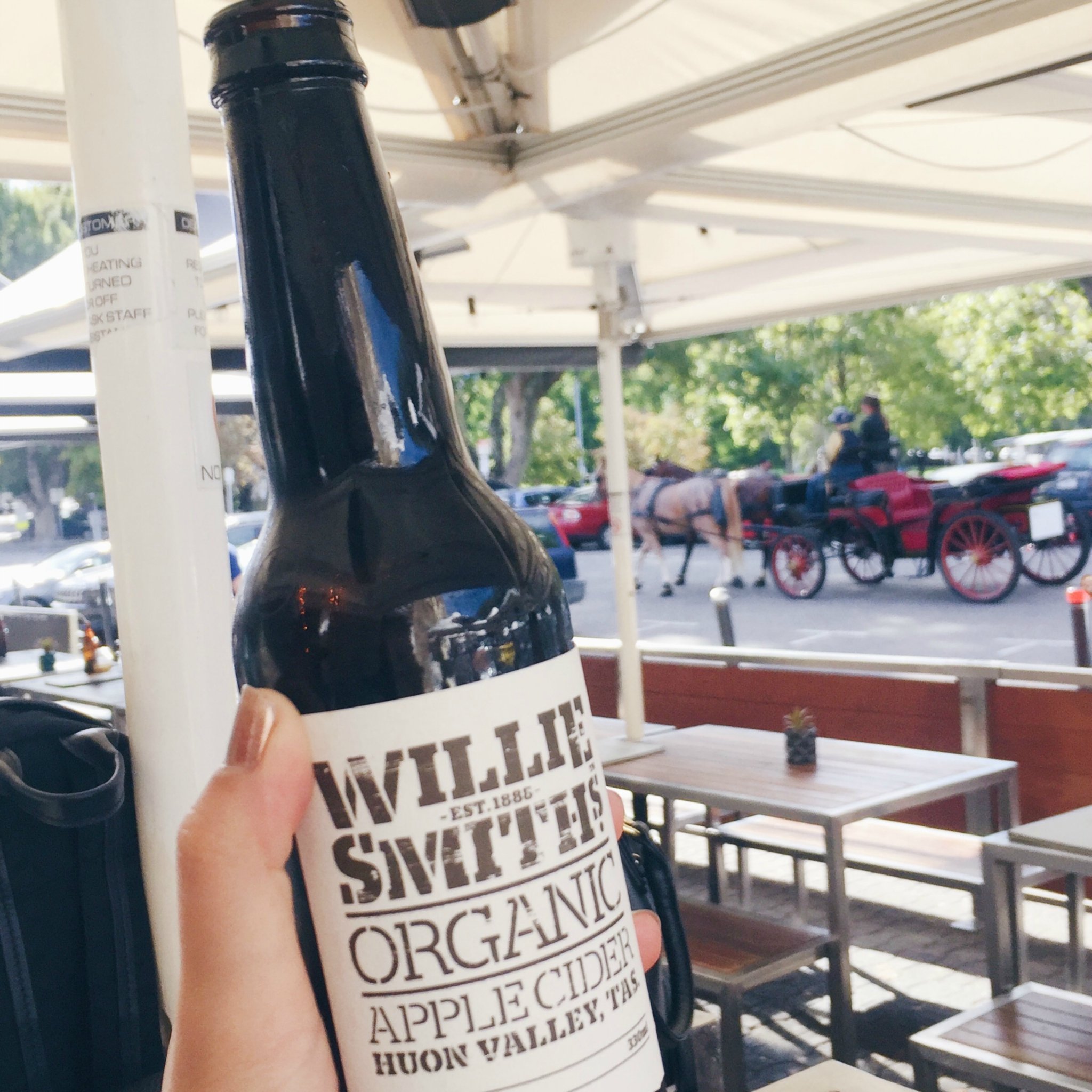 塔斯反常的热度,让我们所有人都备多了衣服,阳光好到坐在室外的bar里喝酒都晒不得太阳(飞机上看小册子就记下了黑白配的塔斯独有的TAS cider)