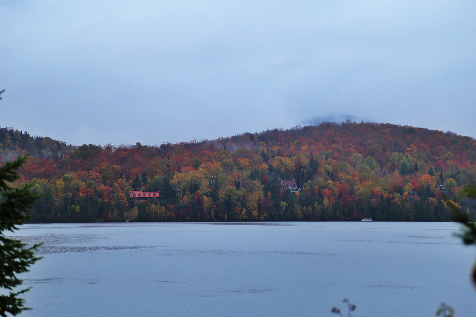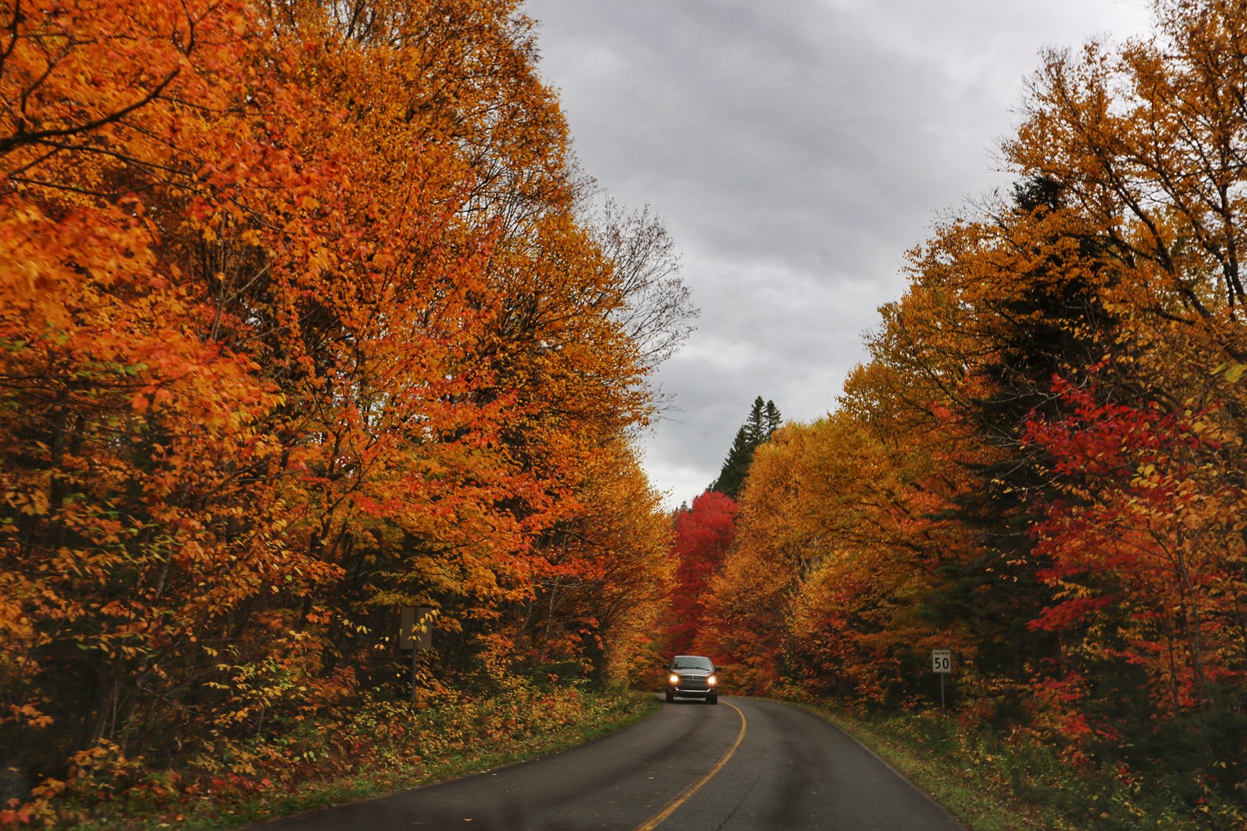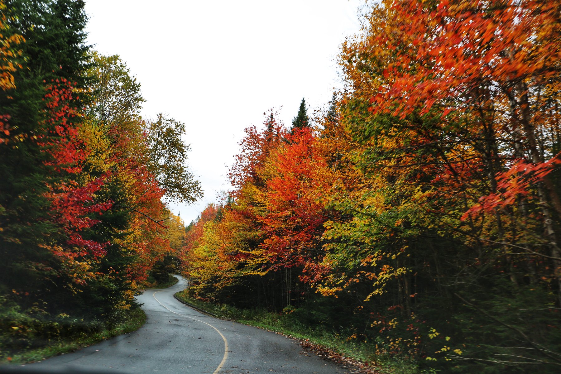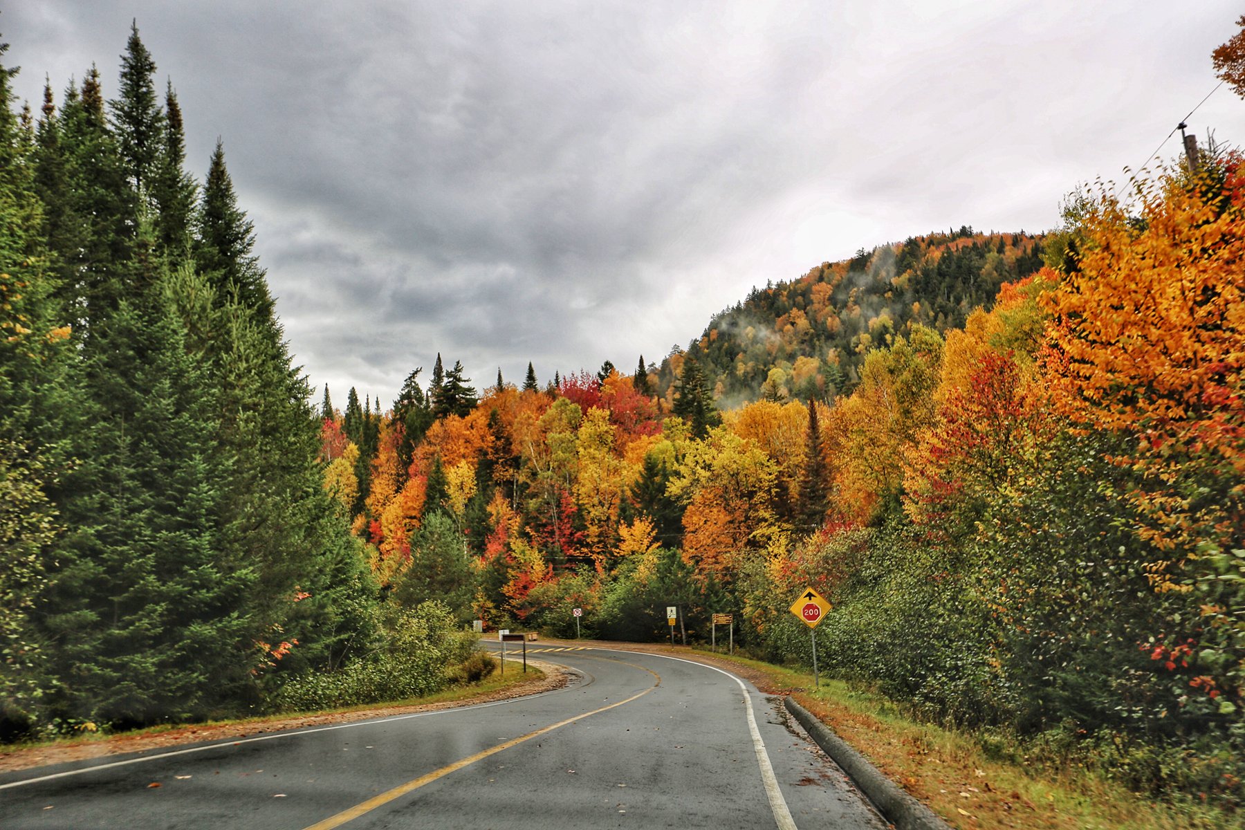 到蒙特利尔时,雨已经如瓢泼般,所有车速依然很快。从蒙特利尔转向北,一团团云雾飘来飘去,已经看不清路两边的风景,隐约觉得进了山区,路边的颜色更丰富了。