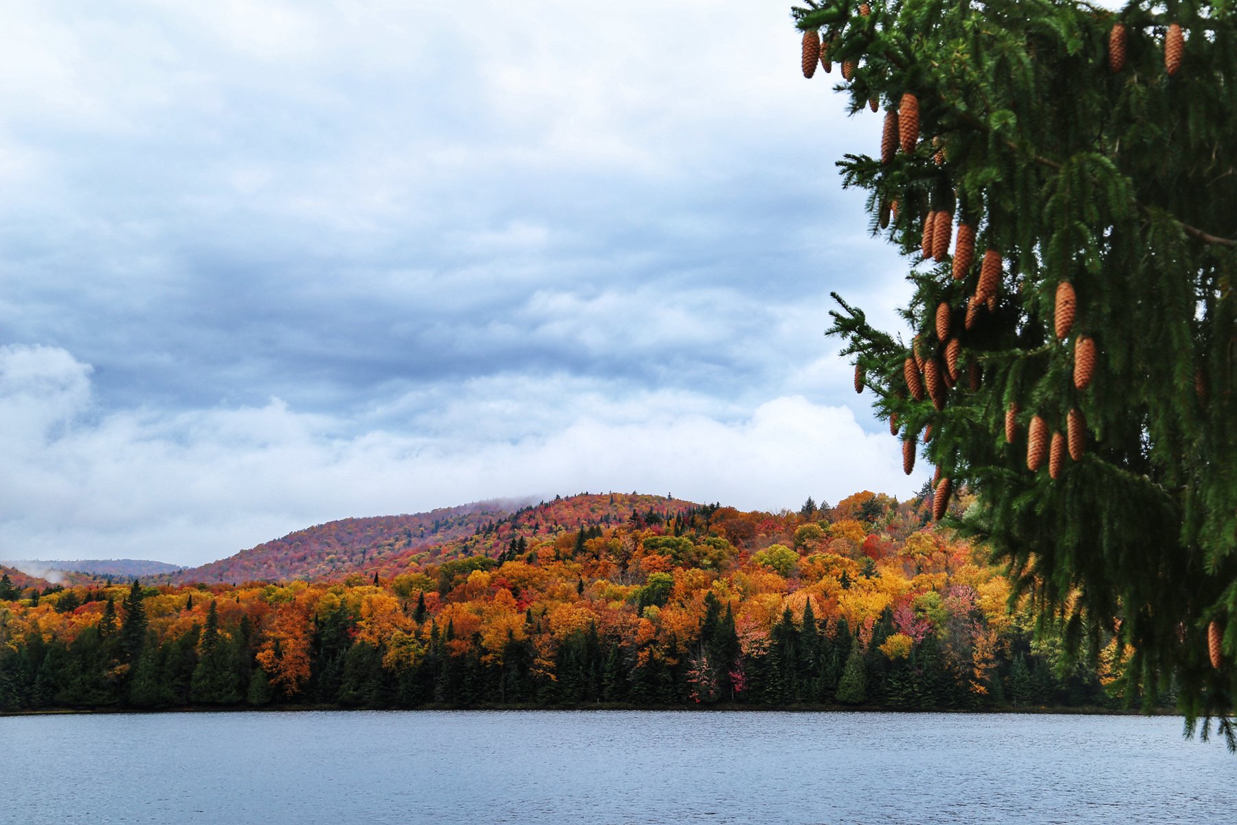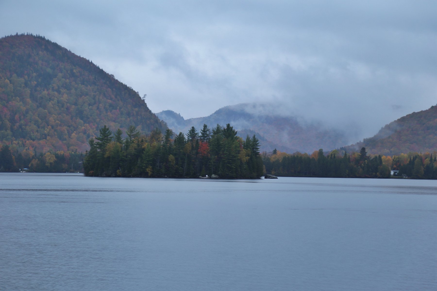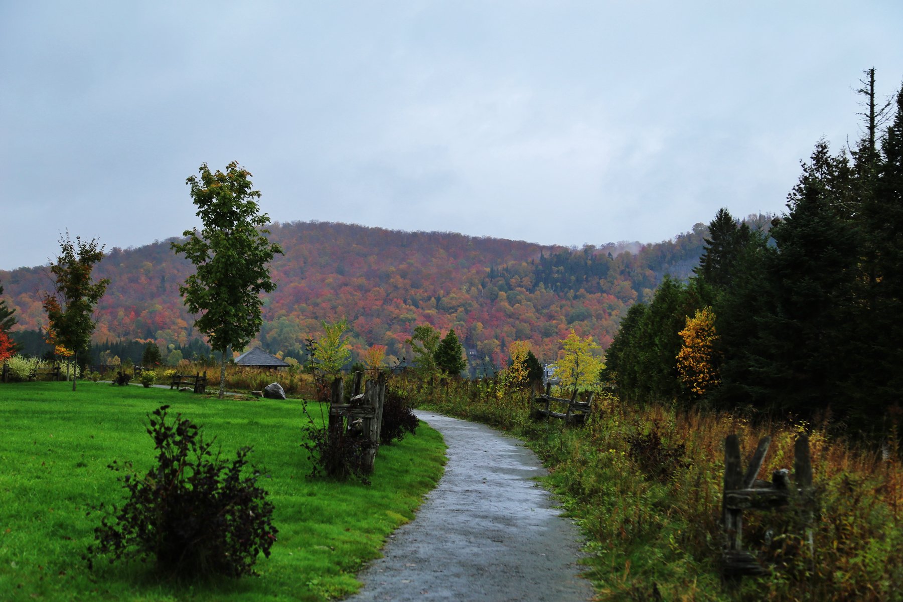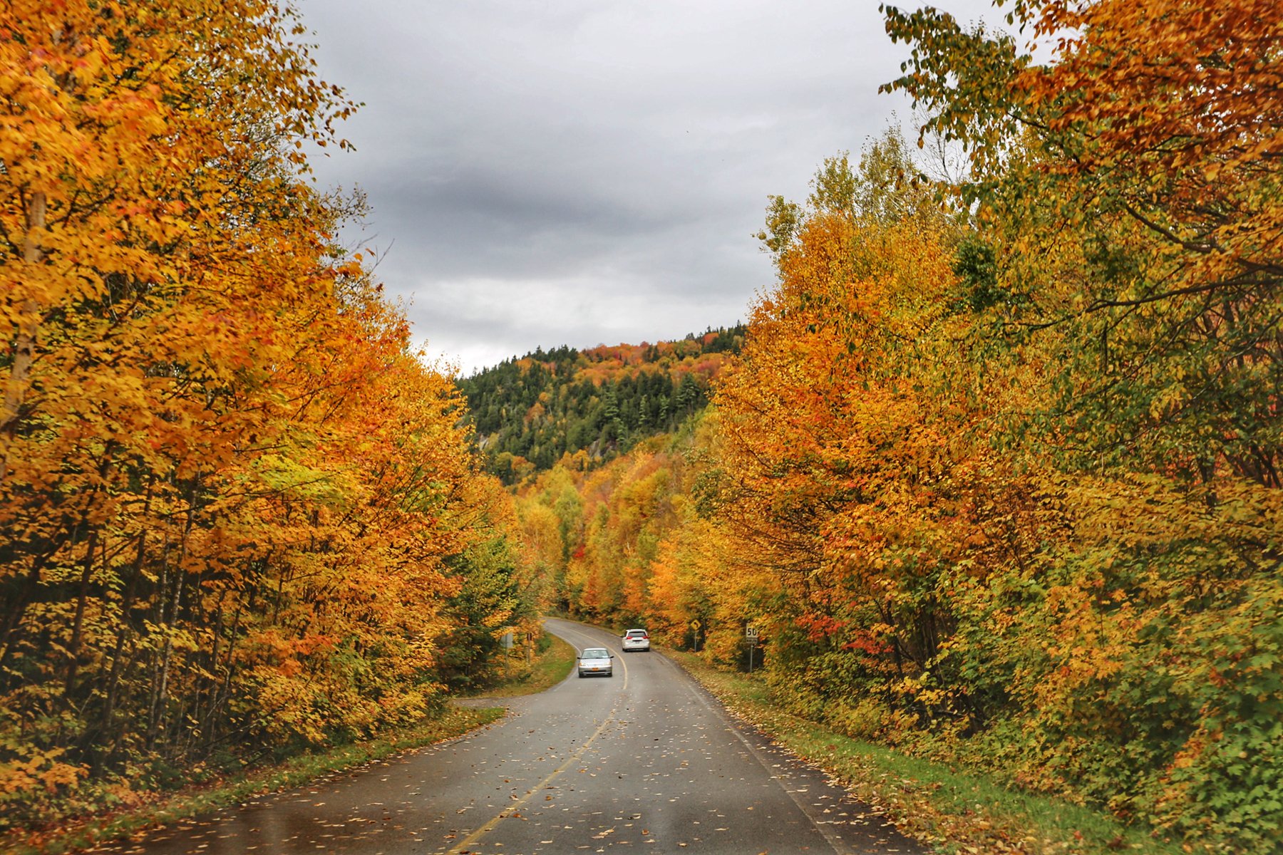 到蒙特利尔时,雨已经如瓢泼般,所有车速依然很快。从蒙特利尔转向北,一团团云雾飘来飘去,已经看不清路两边的风景,隐约觉得进了山区,路边的颜色更丰富了。