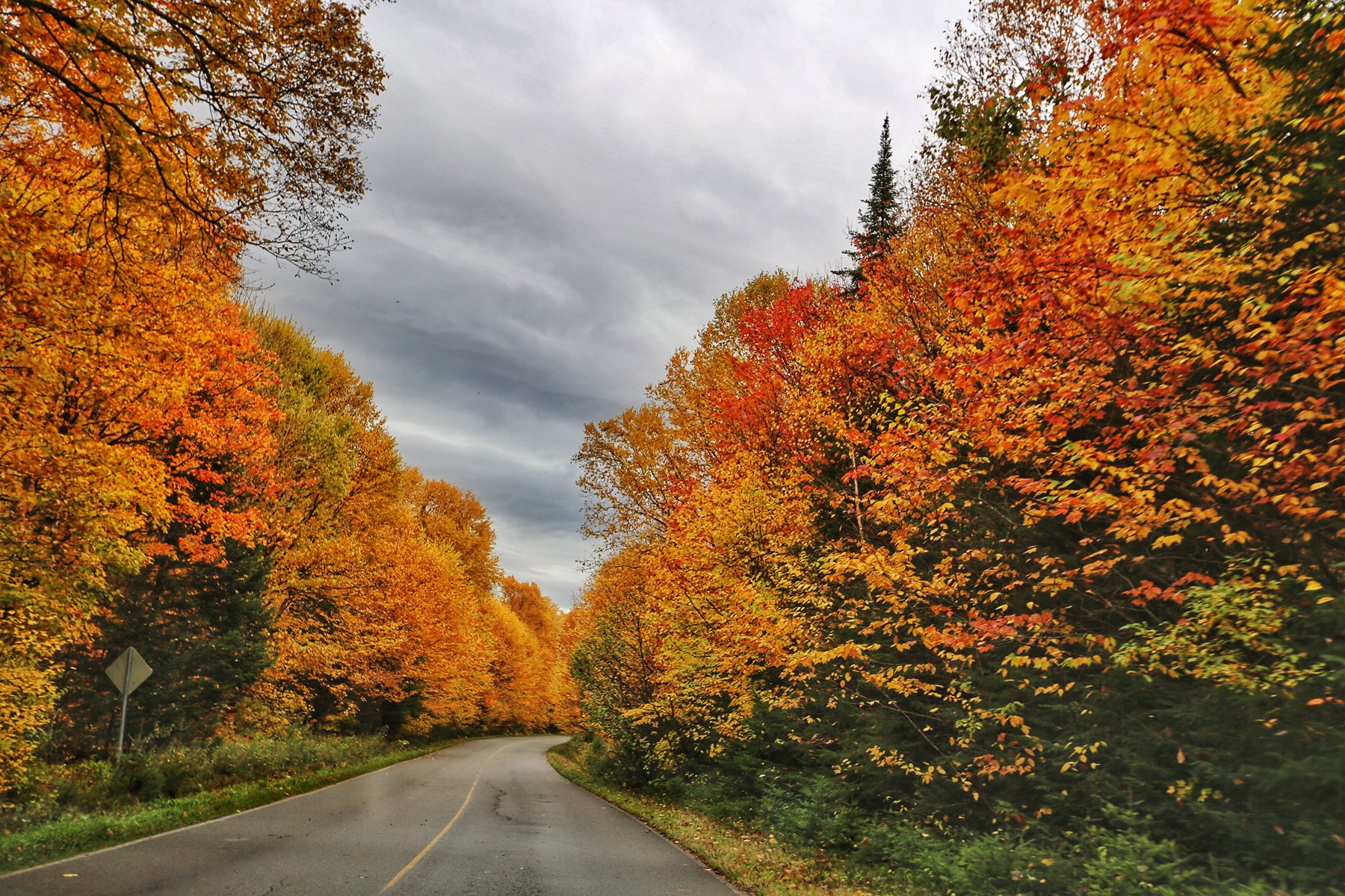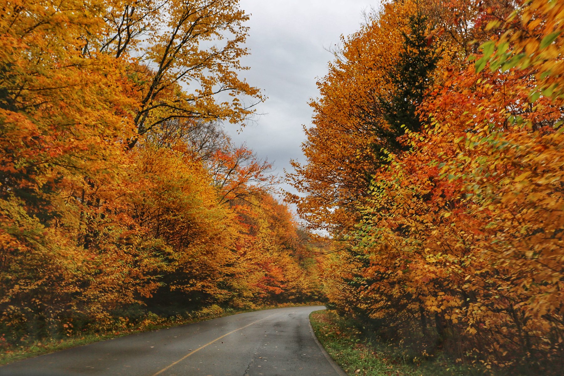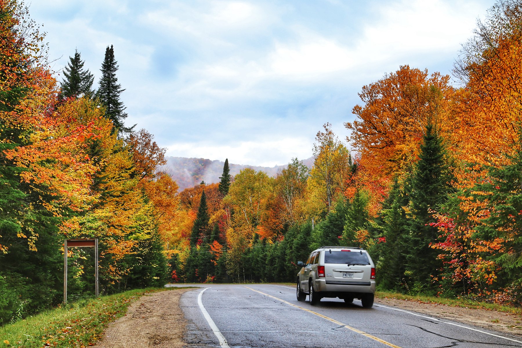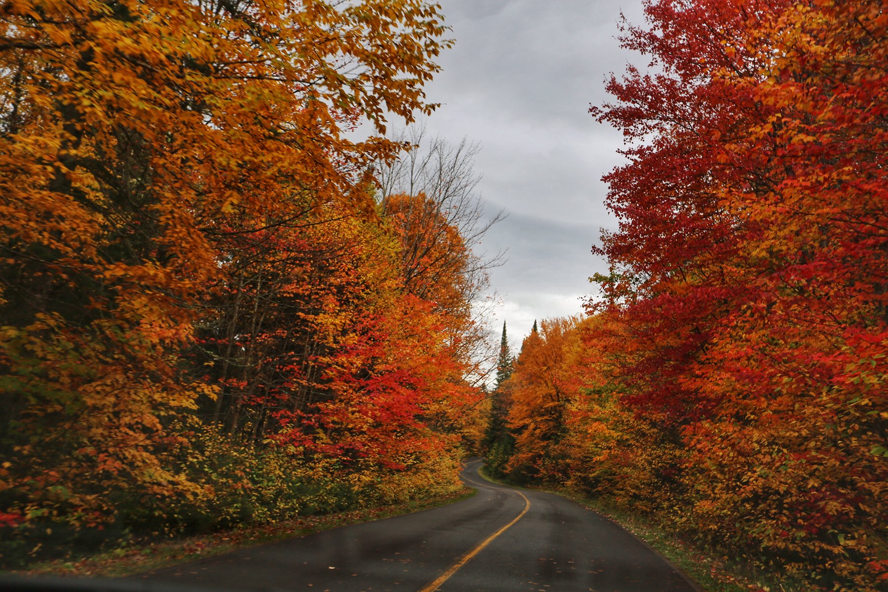 到蒙特利尔时,雨已经如瓢泼般,所有车速依然很快。从蒙特利尔转向北,一团团云雾飘来飘去,已经看不清路两边的风景,隐约觉得进了山区,路边的颜色更丰富了。