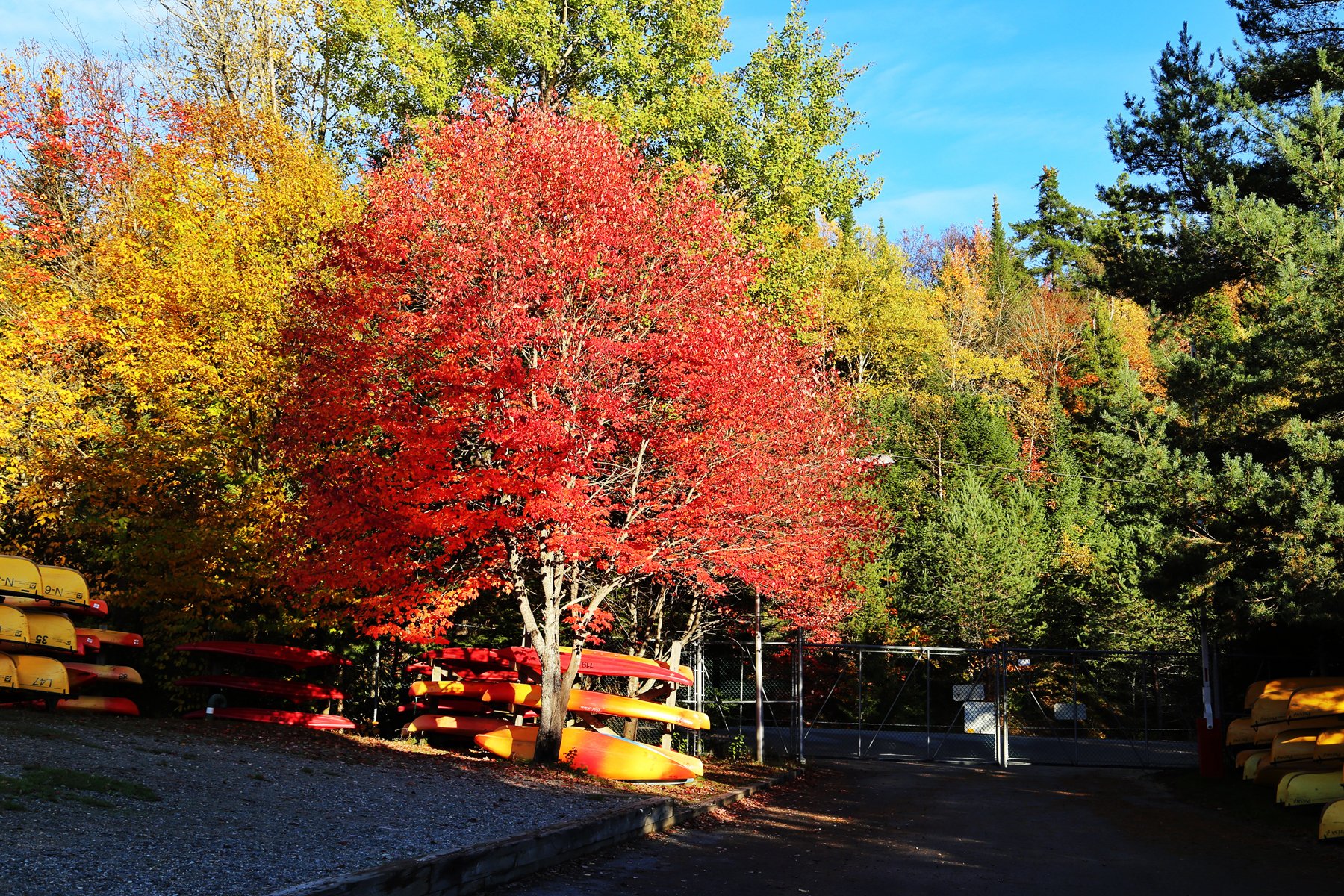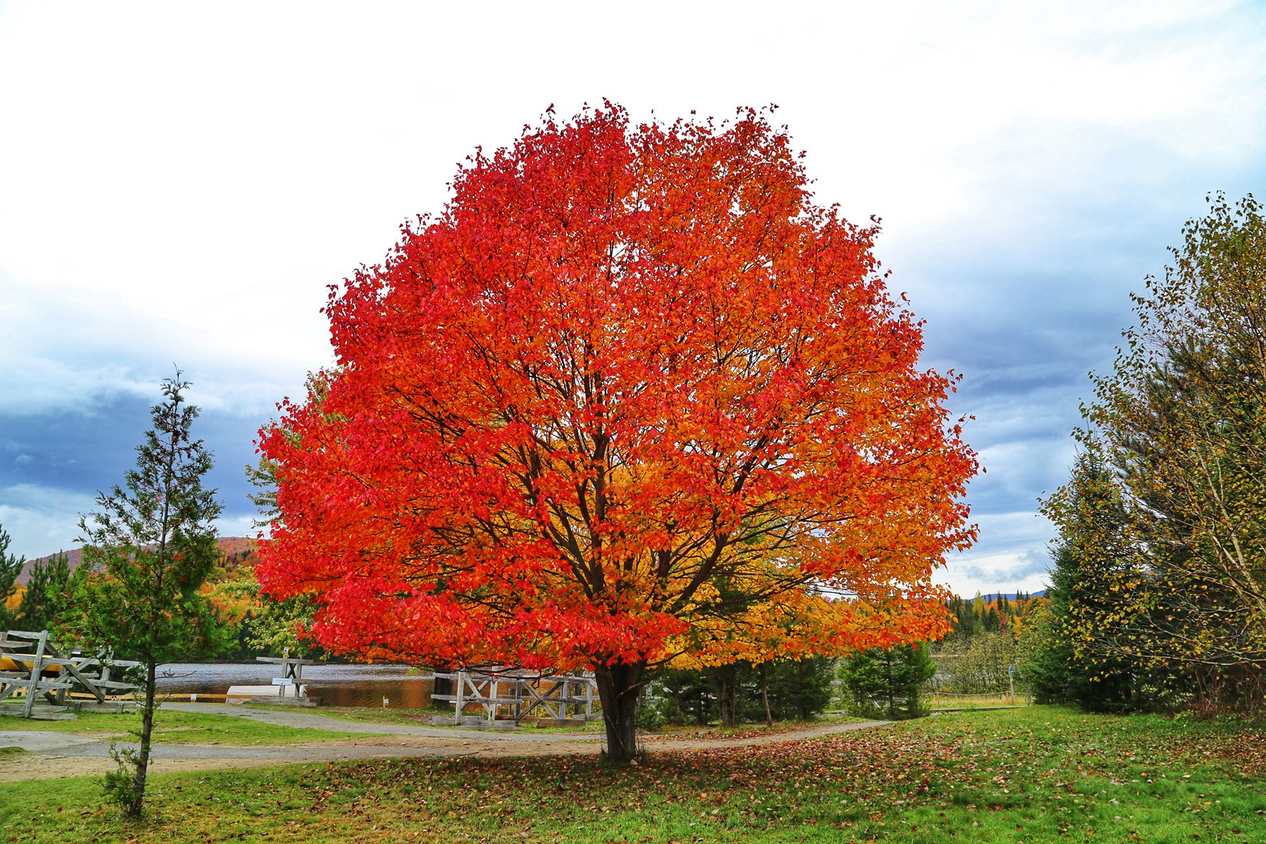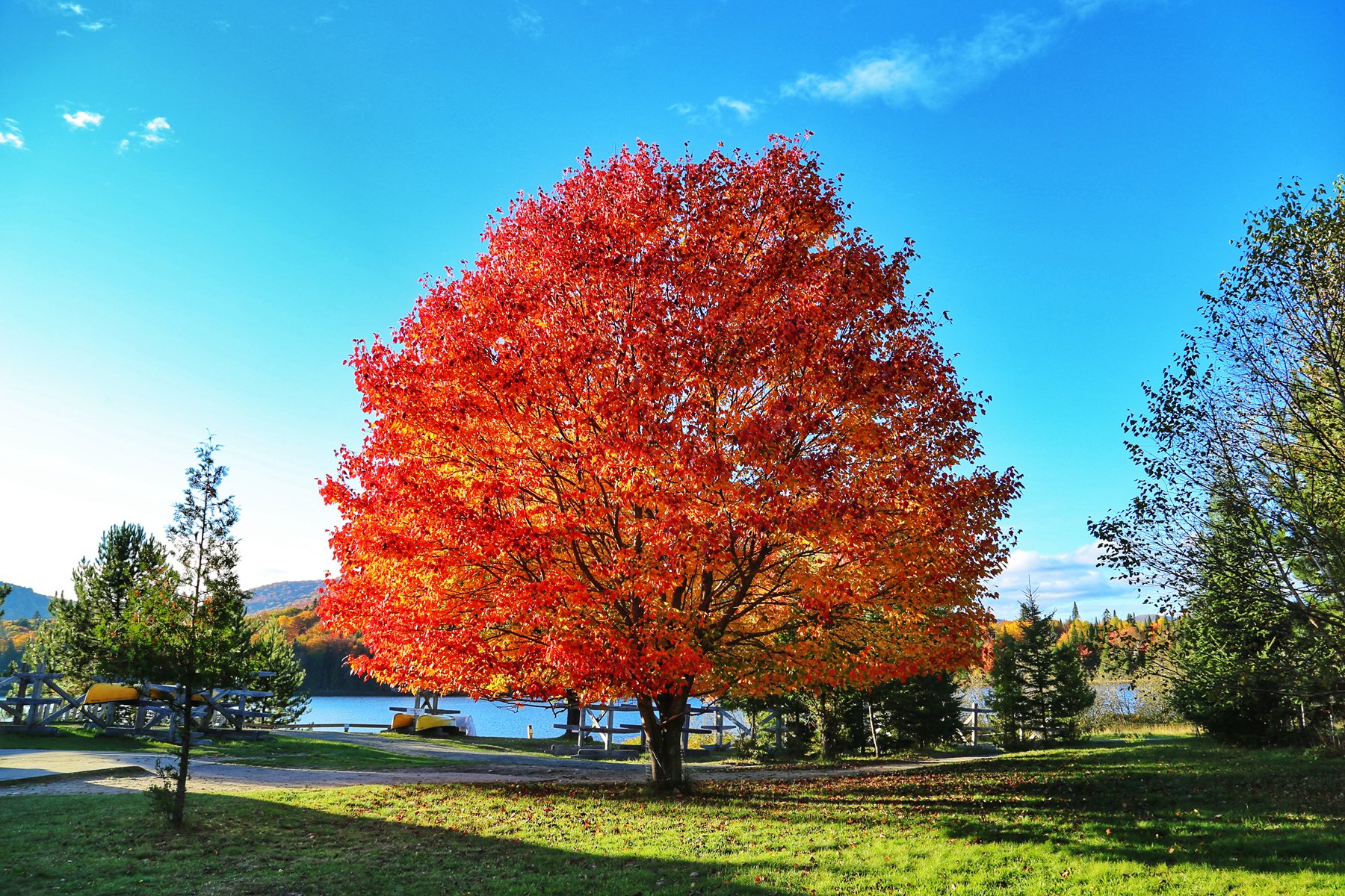 露营地有几棵红透了的枫树。