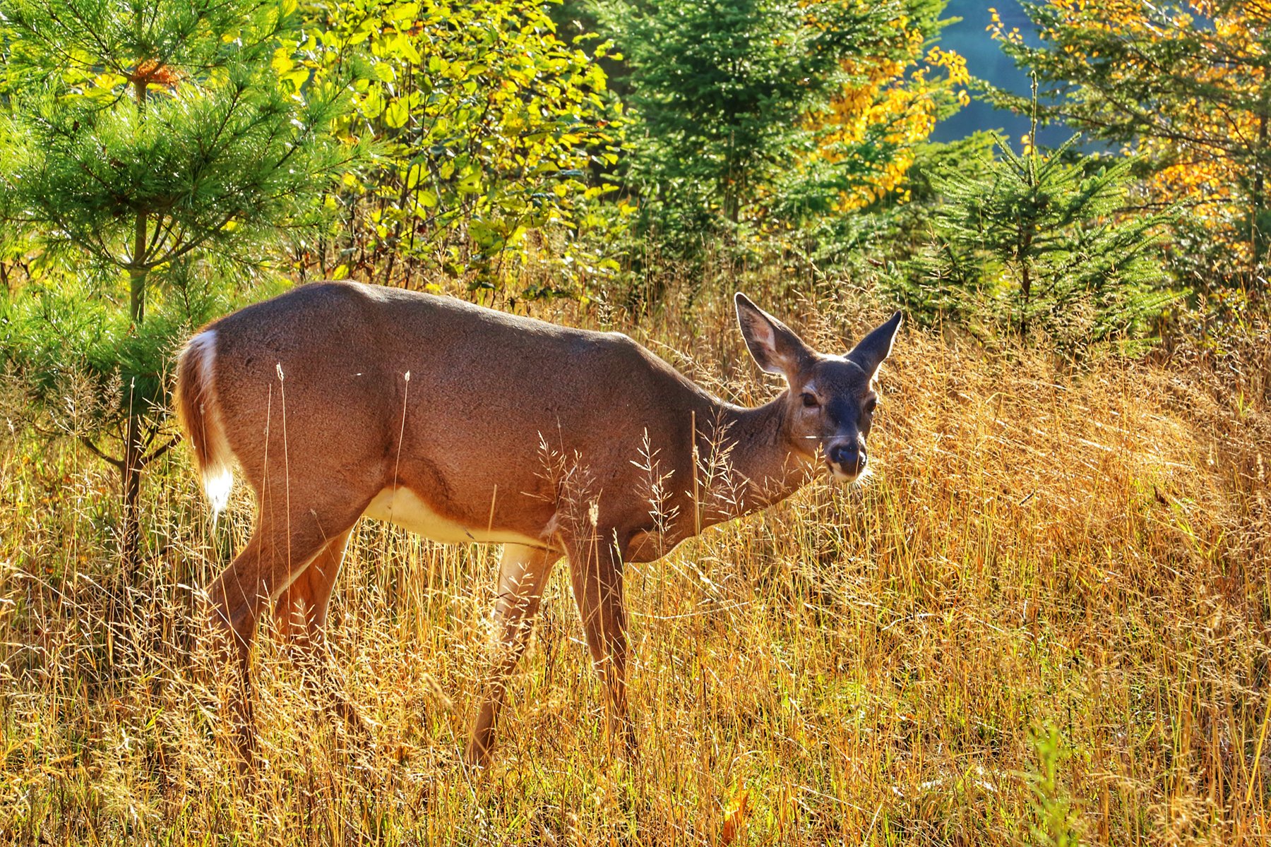 草丛中的一头鹿看见我们,只是抬头看了看,又继续低头吃起草来,我们可以离得只有一两米看它,不过没敢摸。