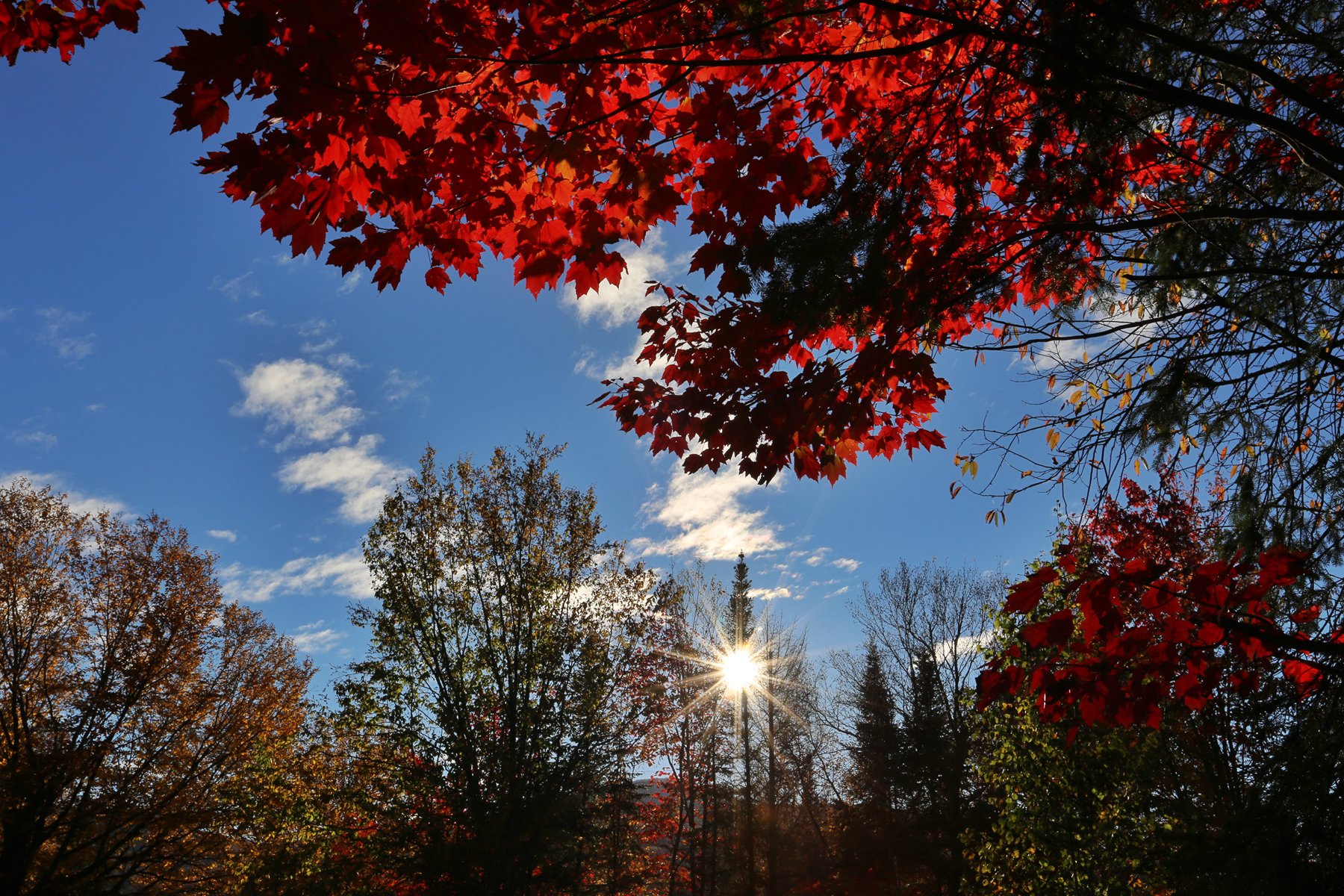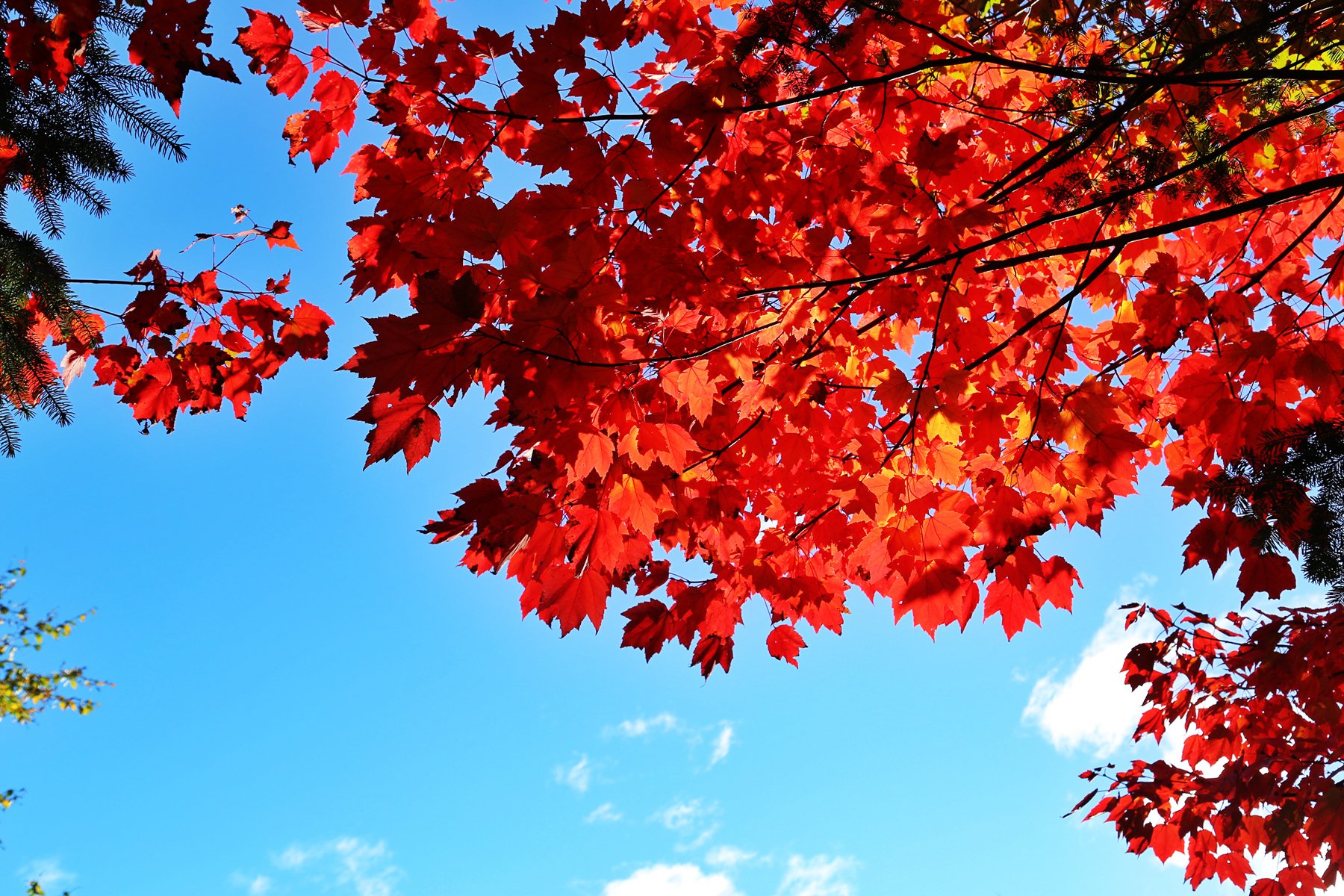 逆光下的枫叶更为鲜红。