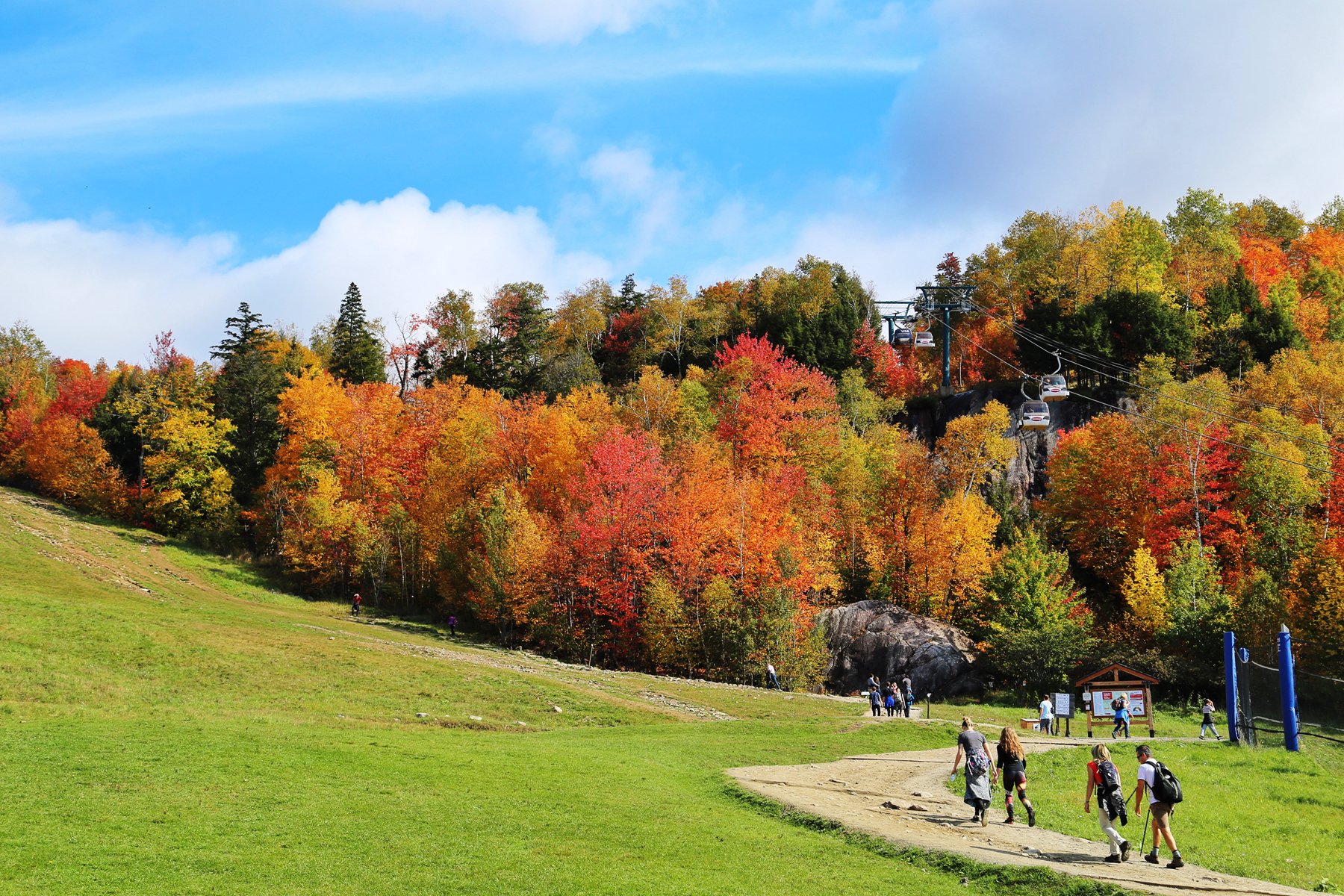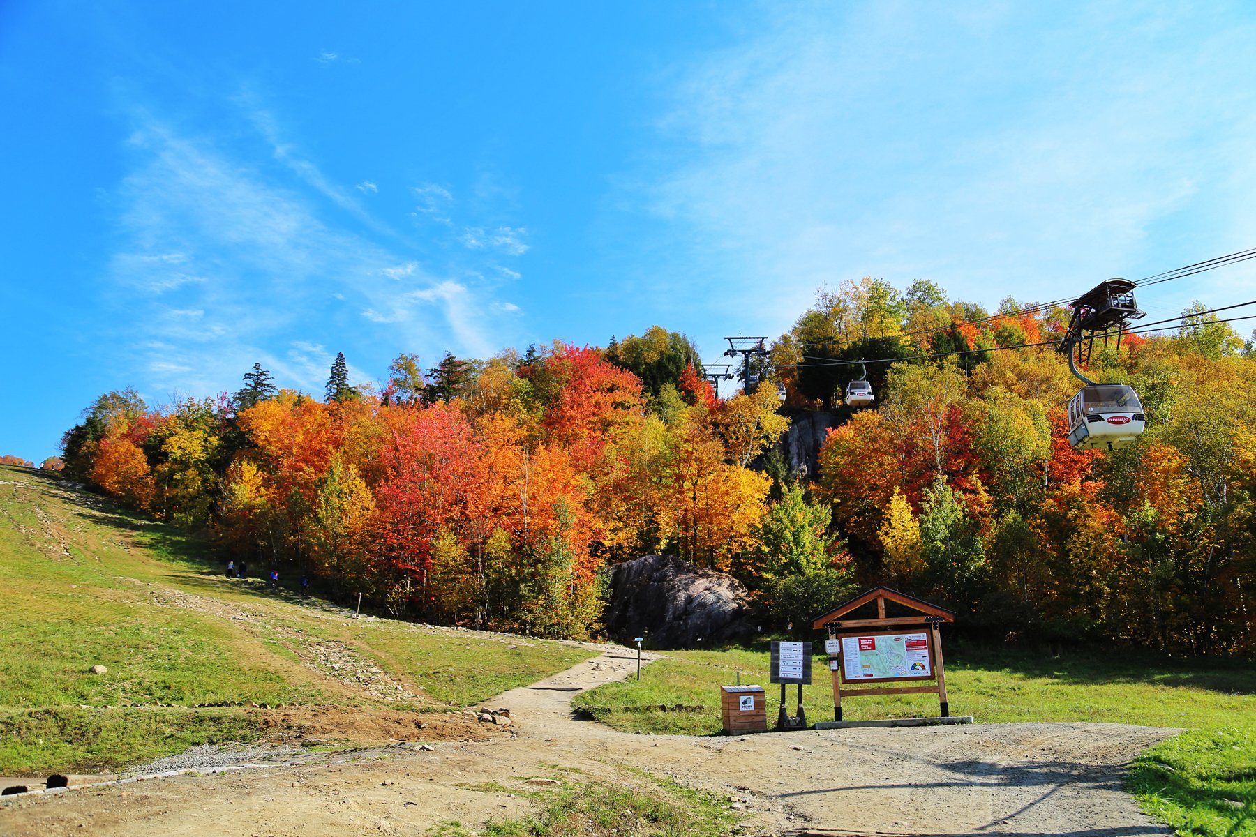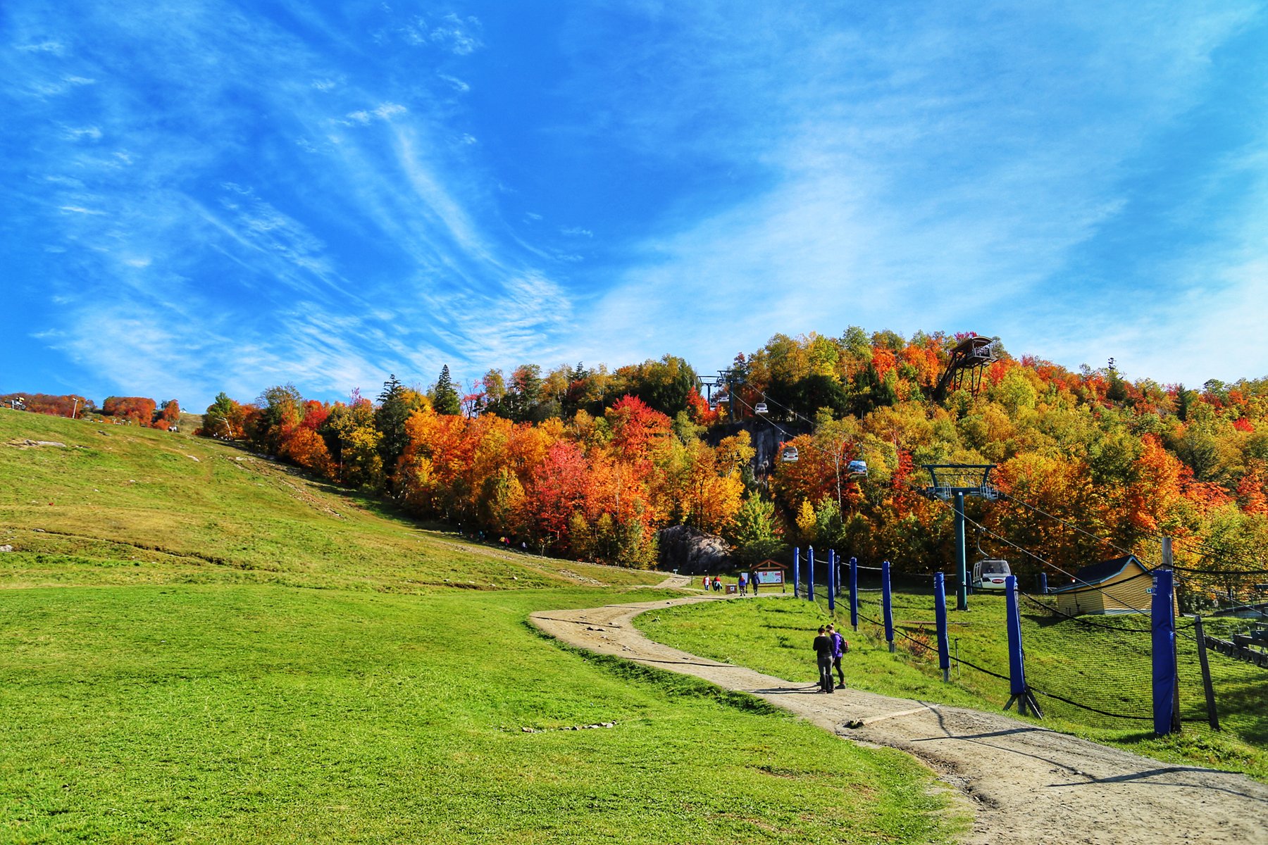 沿着缆车的路径,可以在树林里穿行,或者直接走雪道,当然现在是草地了。