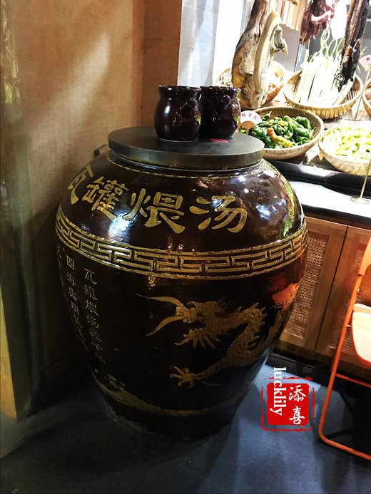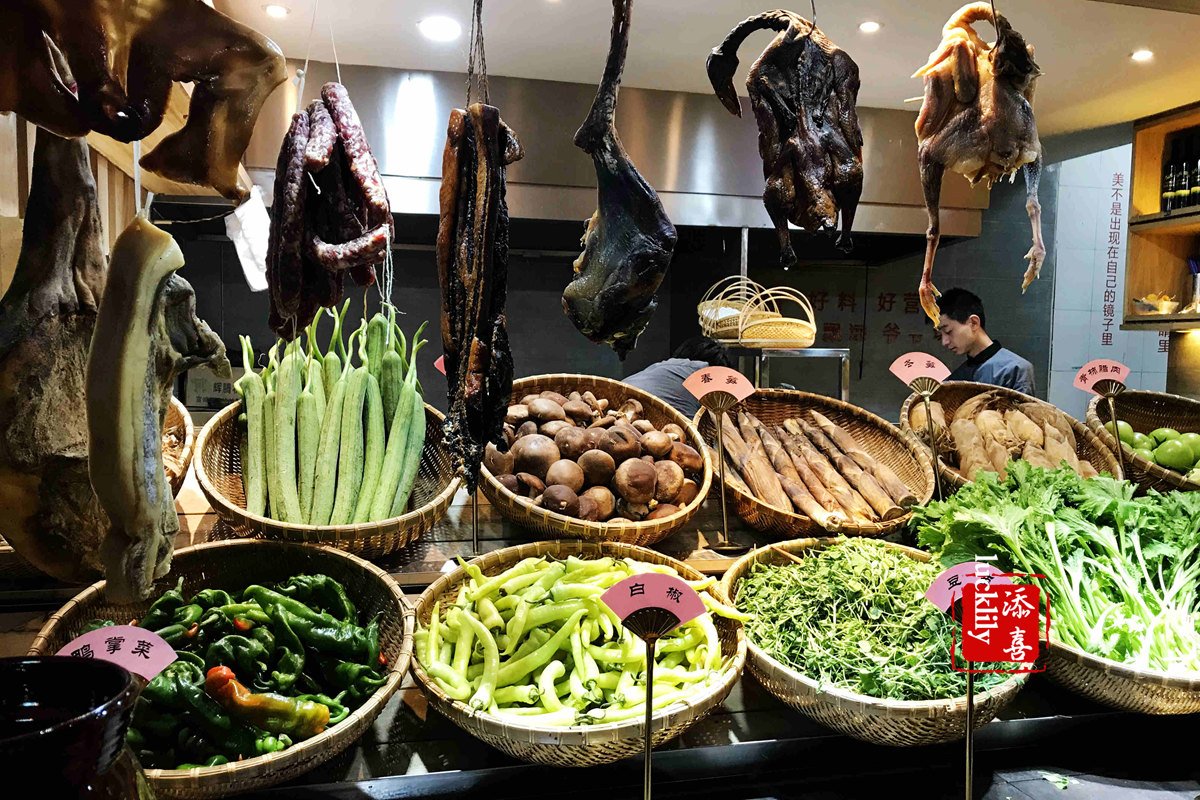 感觉服务生蛮多的,门口有两位迎宾,进门就是瓦罐煨汤大缸,还有一些新鲜食材的展呈,除了时令的蔬菜之外,还有腊肉酱鸭之类的悬挂着,一看就是老底子的味道。