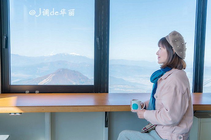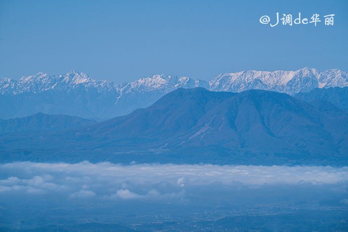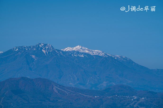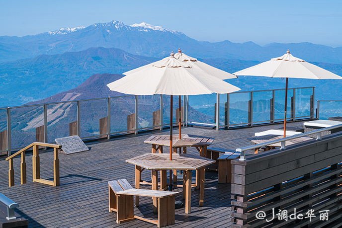 在观景台上可以一览北阿尔卑斯山脉和长野盆地的全景,远处山峰积雪的白色山顶清晰可见。