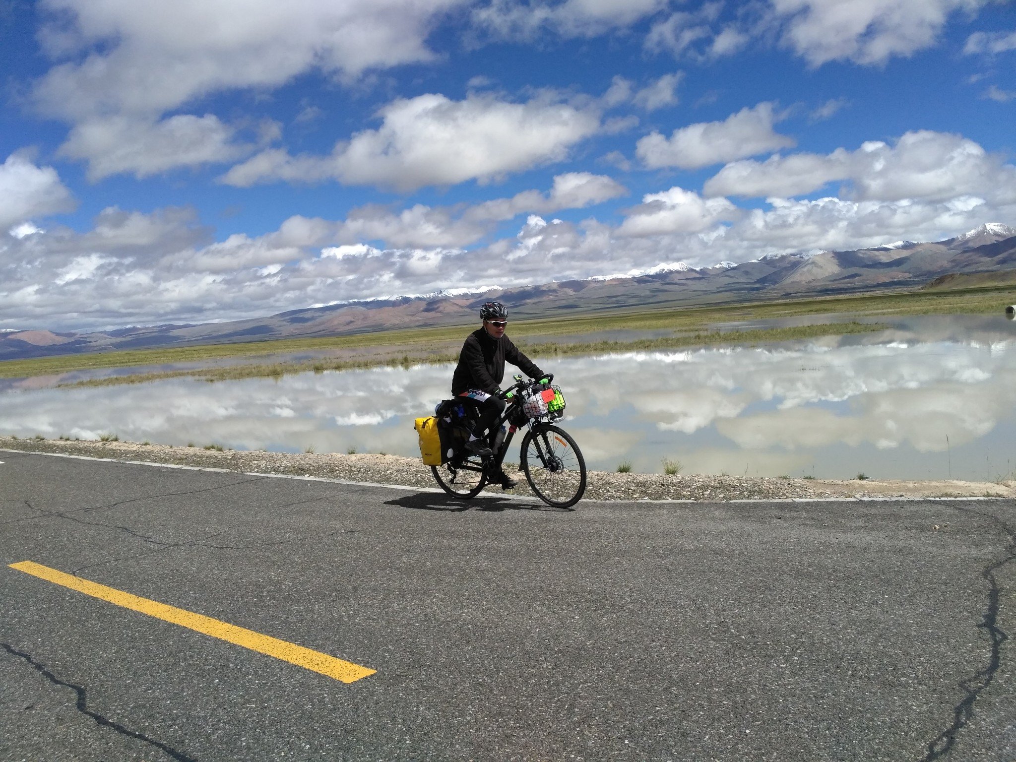 这里骑过一段风景十分好的路段,两旁是一片片的小水池,远处是雪山。水不清,却能反映你的倒影,我和朋友坐在路旁休息,啃着压缩饼干,开始怀念城市里的牛排了。
