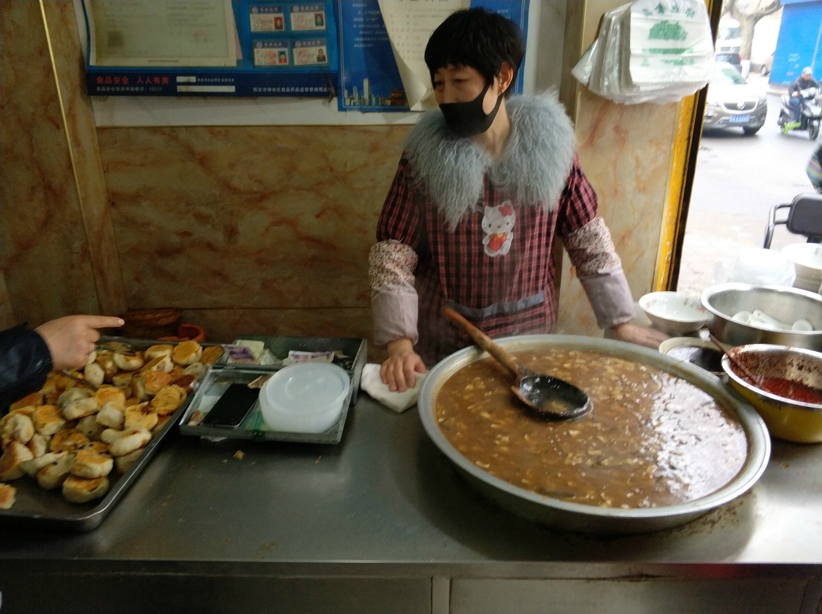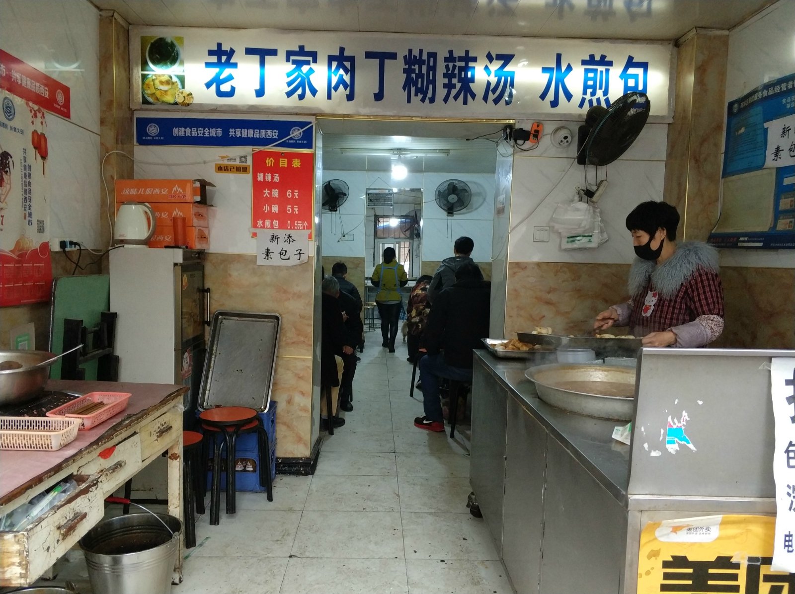 胡辣汤店,是典型的苍蝇馆子,面积不大,环境只能呵呵了。店里仅经营肉丁胡辣汤(大碗6元小碗5元)、水煎包子(分牛肉大葱肉馅和韭菜粉条素馅,均0.5元)和茶叶蛋(1元),采取先付后食的付钱方式,熬胡辣汤的大锅在店门口支起来,旁边便是用盘子放好的热腾腾的水煎包子。“大碗胡辣汤,6个水煎包”,“9块”,“微信付过了”…点餐、付钱,取餐仅在一瞬间。相较于一般的肉丁胡辣汤店,这家店的配菜显得比较丰富,有海带、豆腐皮、黄花菜、花生米等,因此汤也显得比较稠,喝起来很实在。一大早的上班高峰期,时常见到店门口排成小队、由于小店面积不大,仅能摆放5-6张桌子,人多时店老板会摆放一些折叠桌到门口的路边,一大早的逃避市容整治,算是打着时间差的“占道经营”。